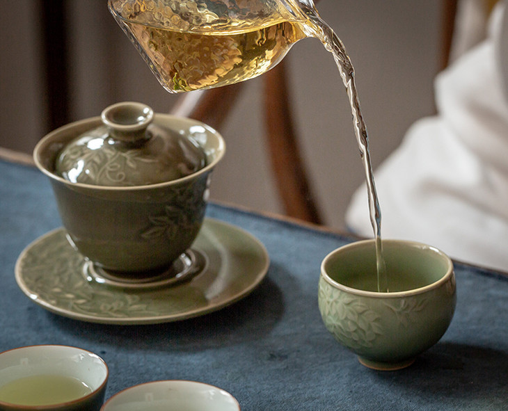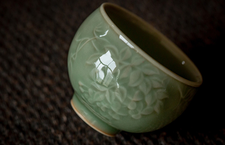 茶香记 谢建林 柴窑缠枝杯 梅子青 手工刻花 荔枝纹 端庄典雅 古窑烧制
