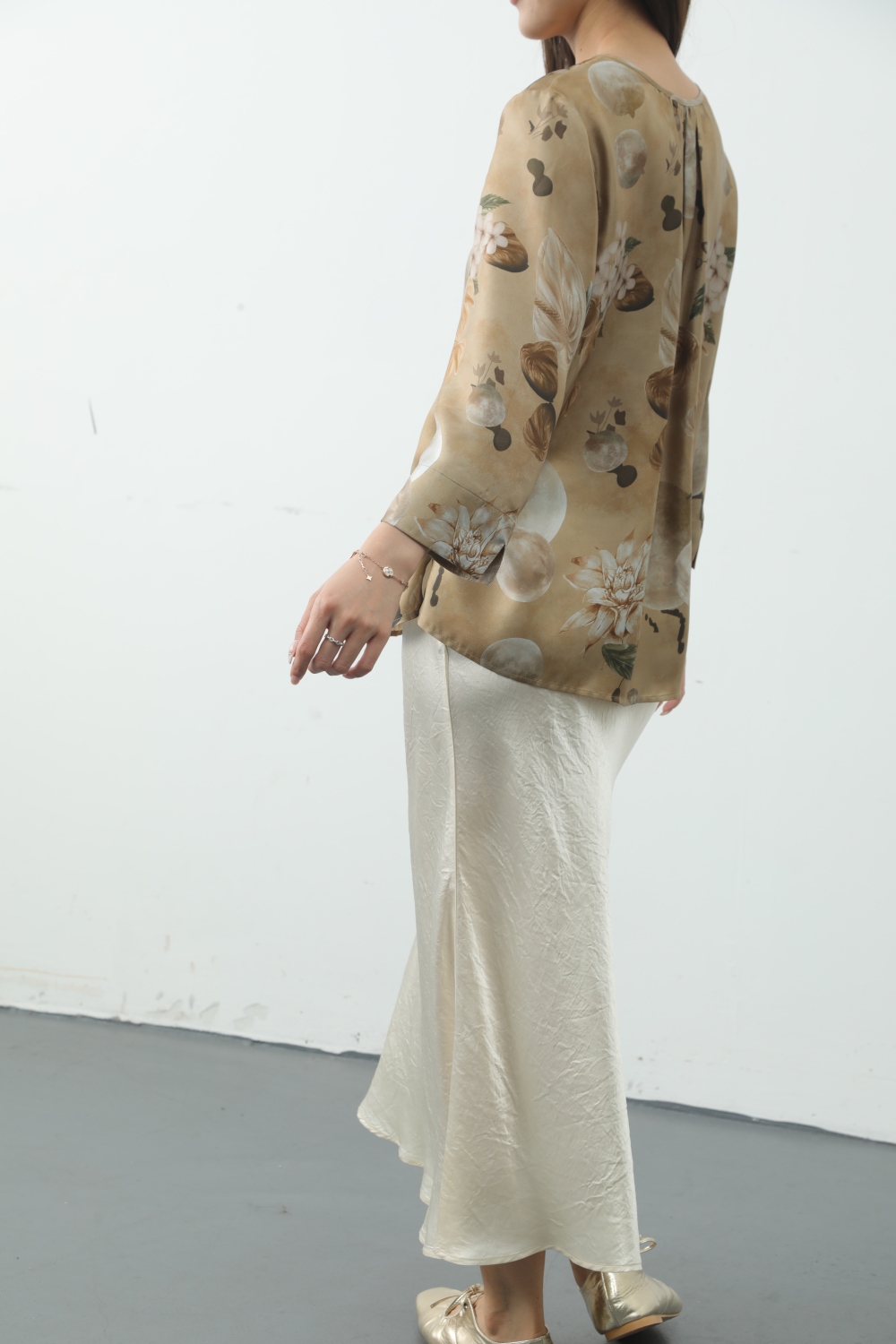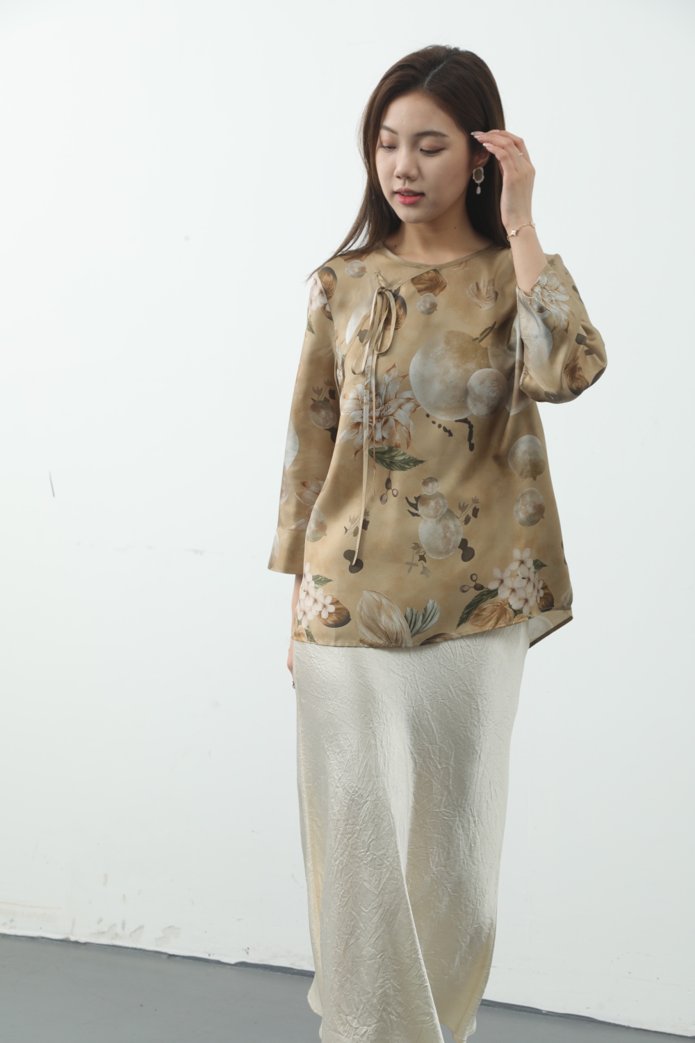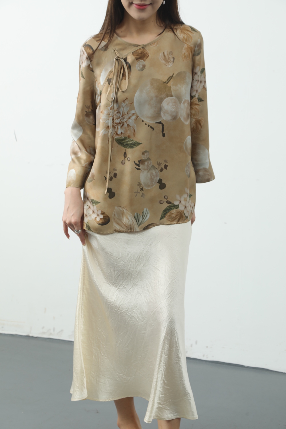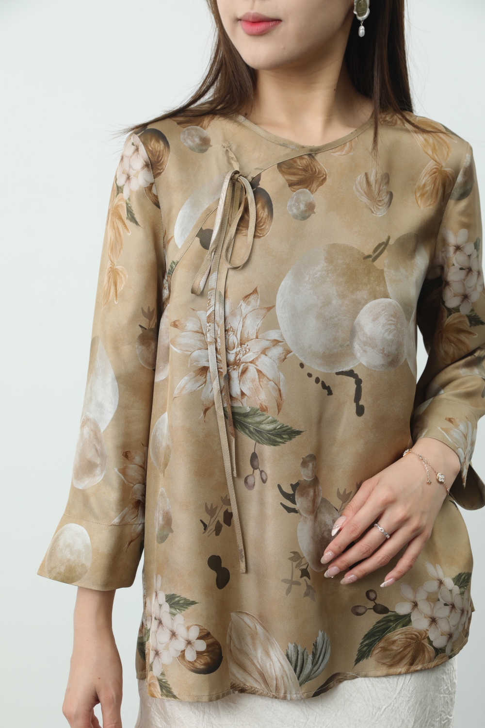 洛诗琳14703新中式印花上衣2025夏季改良圆领系带真丝衬衫1188