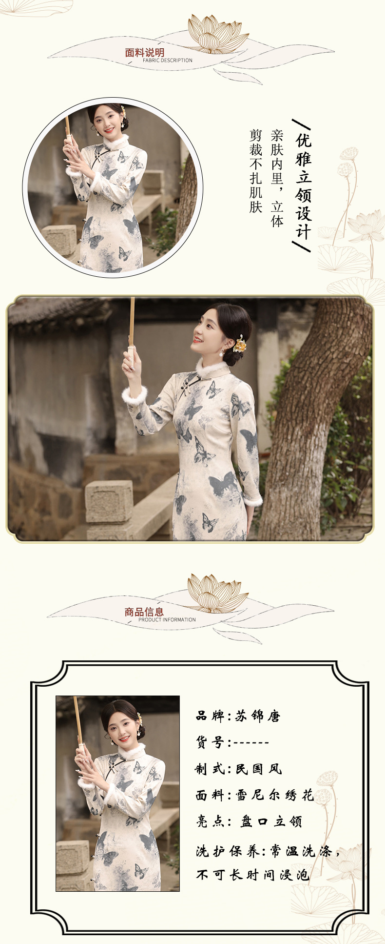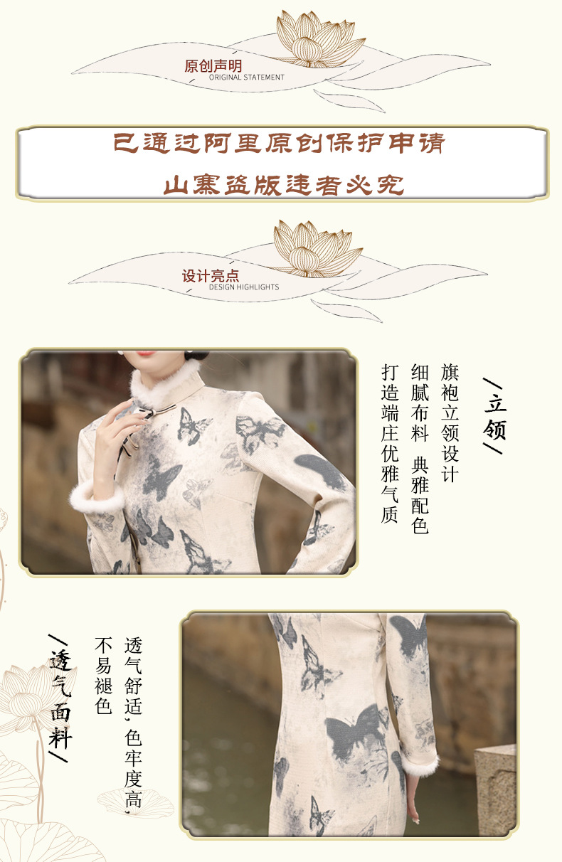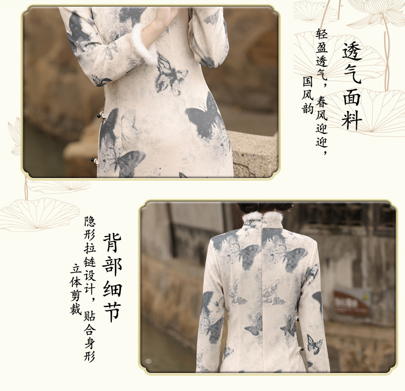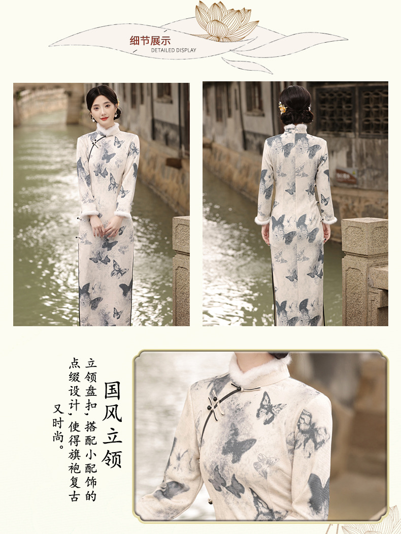 TX-399冬季新款加毛加厚圆襟长款改良旗袍水墨蝴蝶图案气质修身旗袍