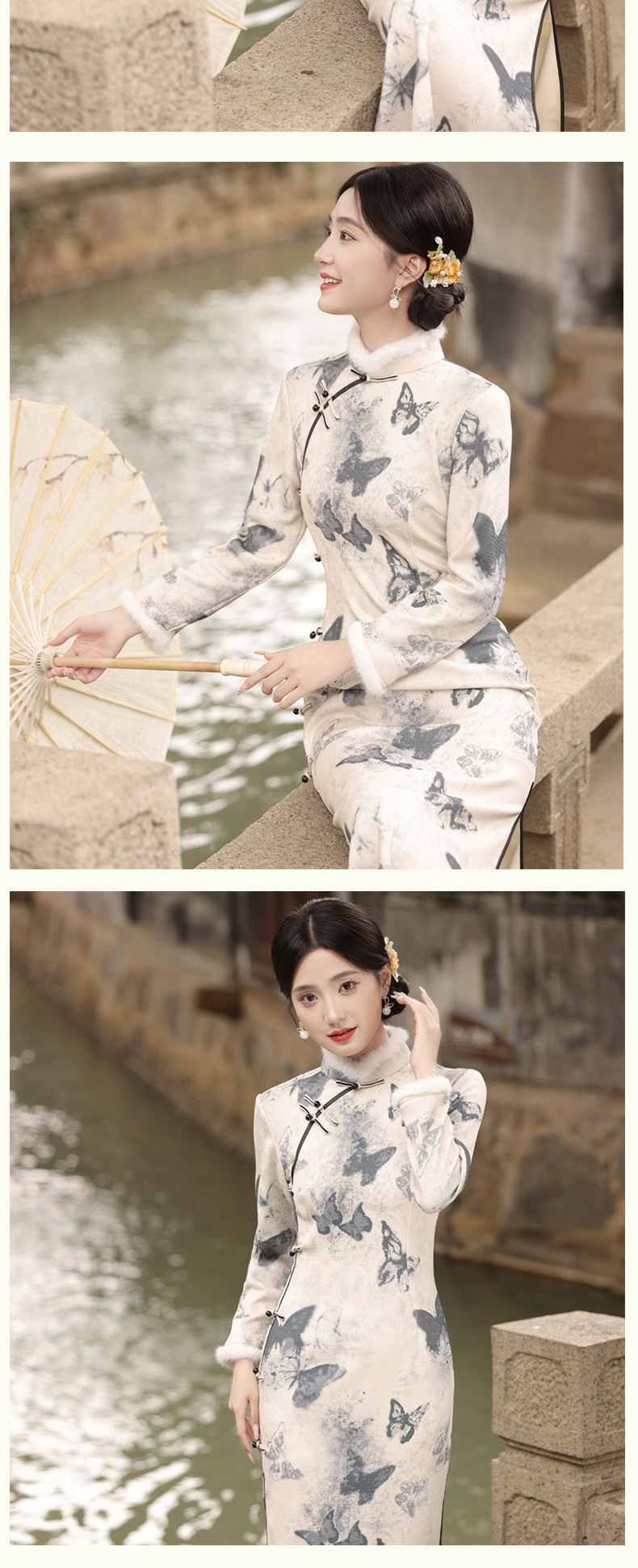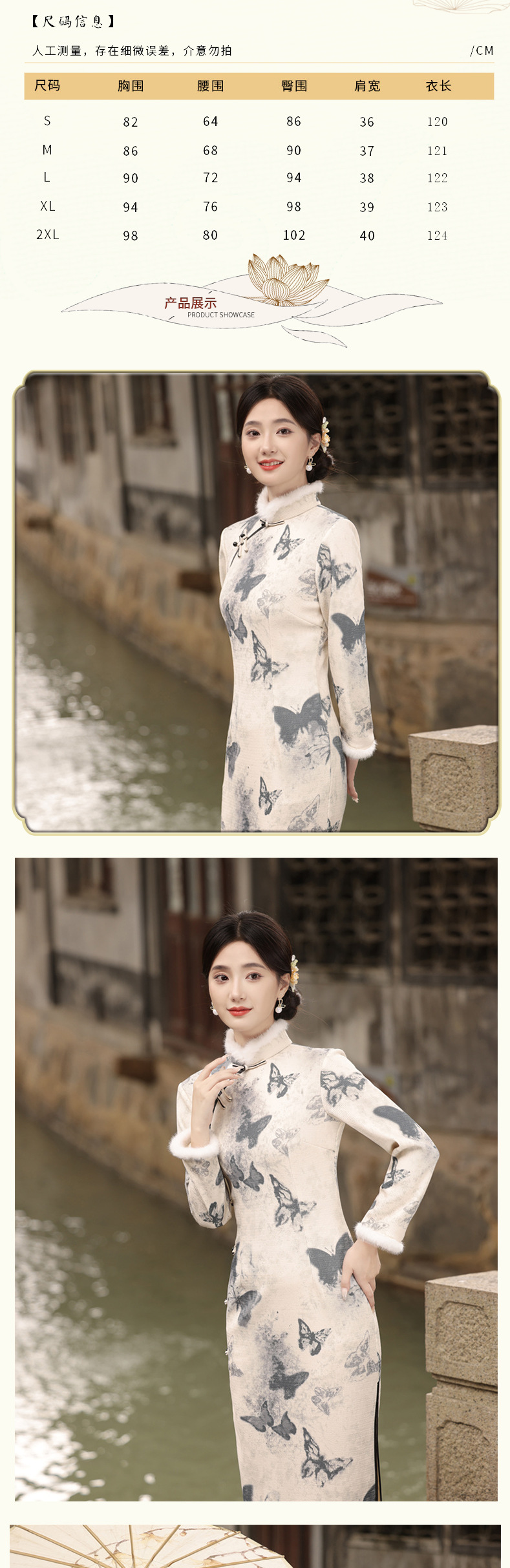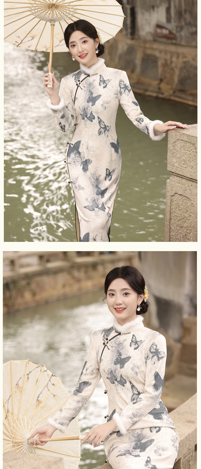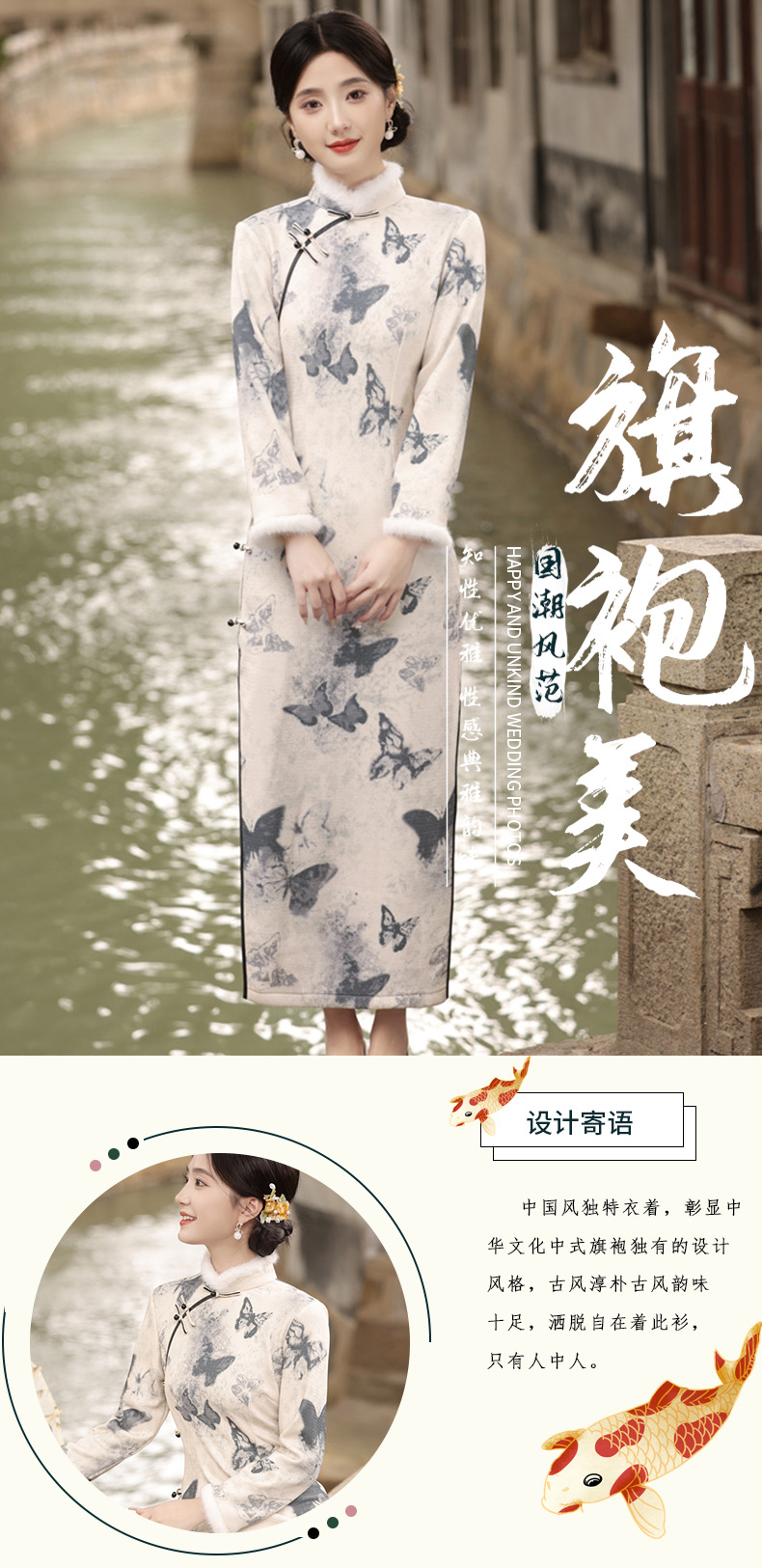 TX-399冬季新款加毛加厚圆襟长款改良旗袍水墨蝴蝶图案气质修身旗袍