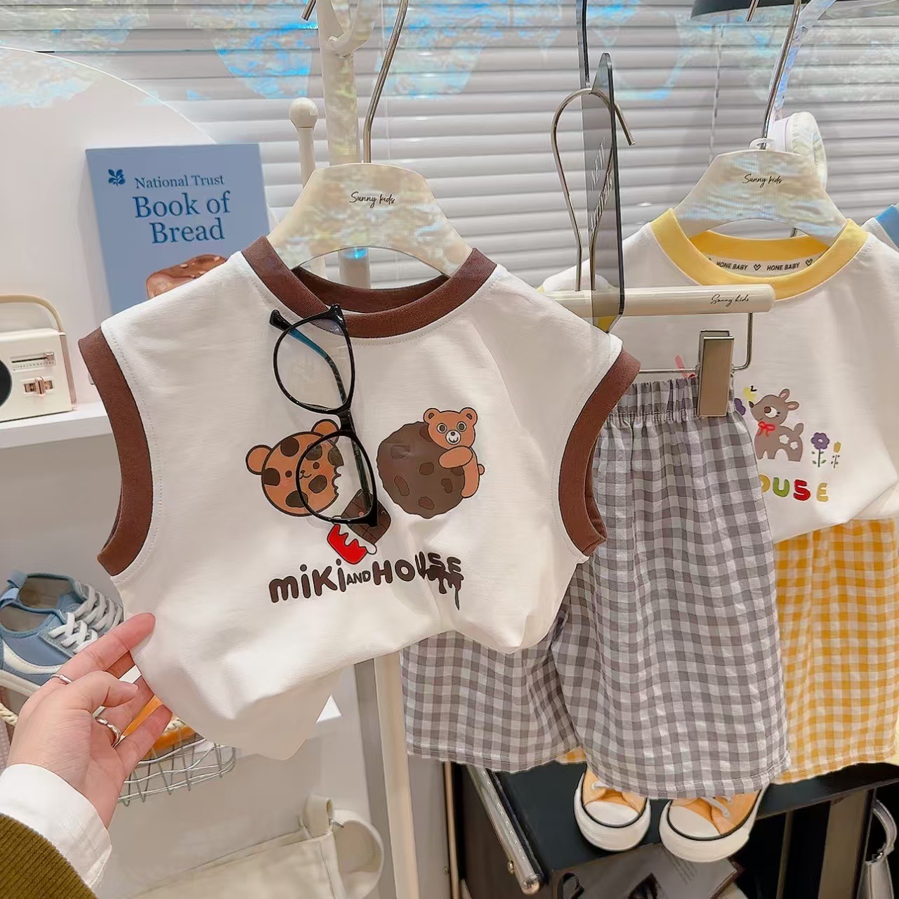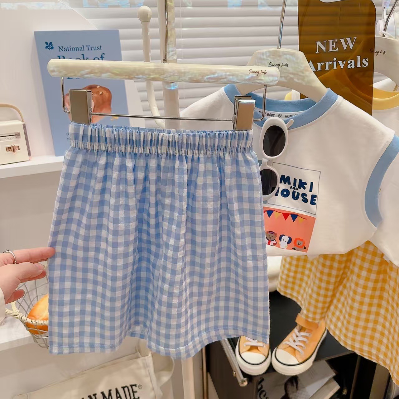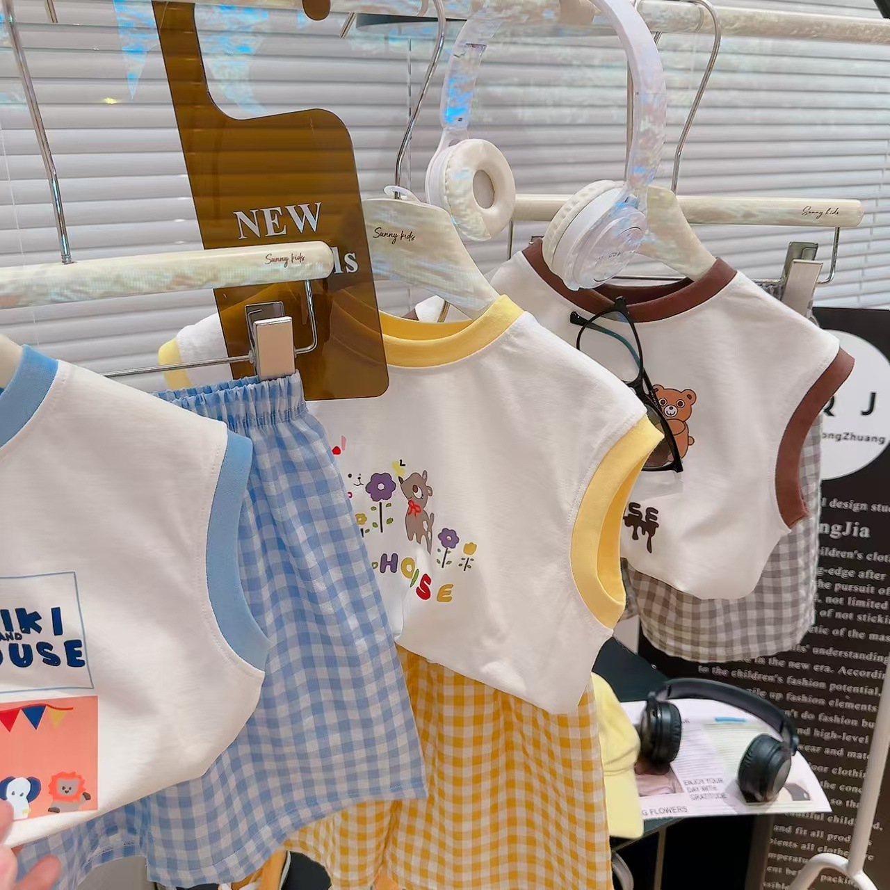 【格子T恤短裤套装,清凉百搭必备!】夏季新款百搭涂鸦 背心格子t恤短裤两件套 男女童套装 莱卡棉面料 舒适透气-QQ
