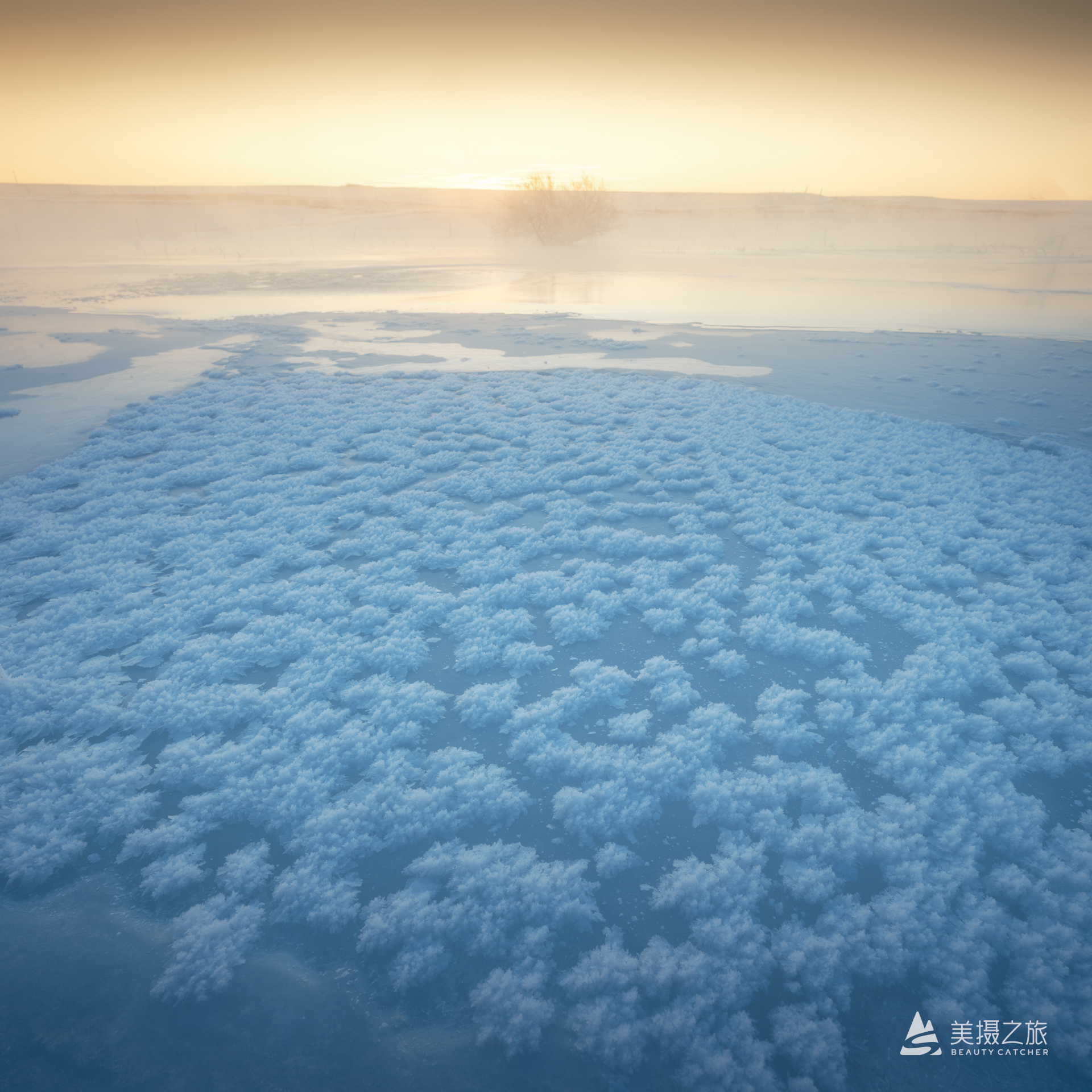 小河头唯美雪景日出创作,树挂、小溪、雪野、村落构图比例教学摄影及航拍实战教学创作。