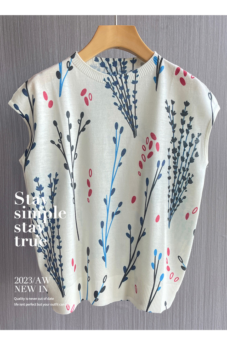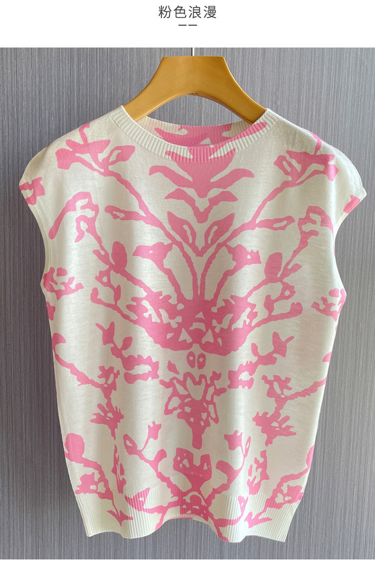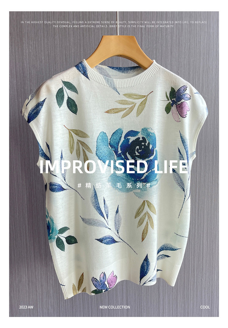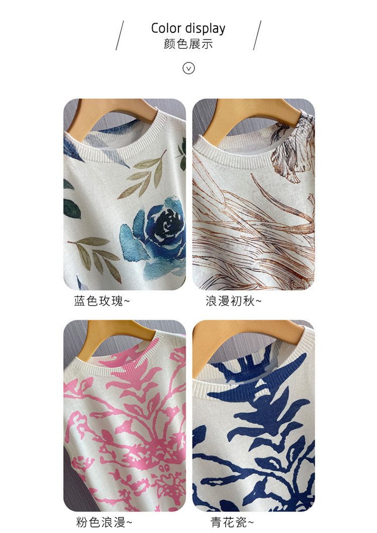 T恤潮薄款上衣,夏季圆领短袖女宽松套头羊毛针织印花半袖桑蚕丝QH-ZH2333
