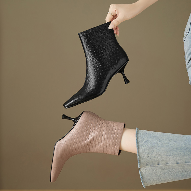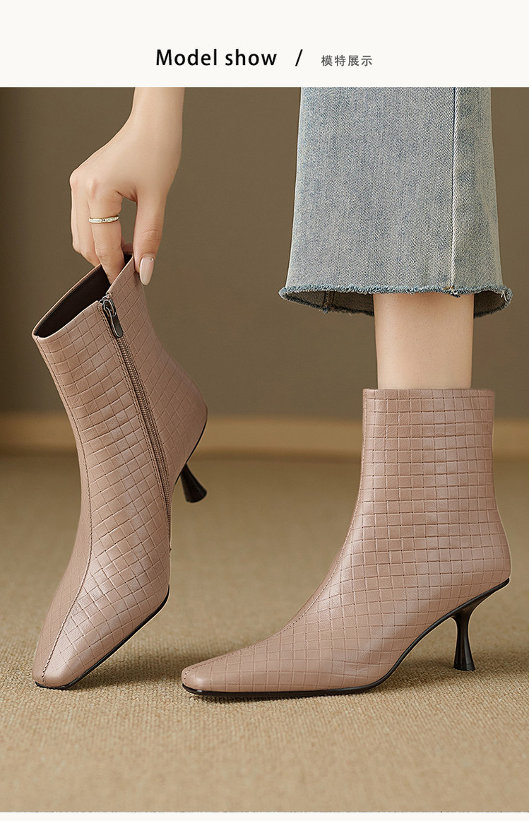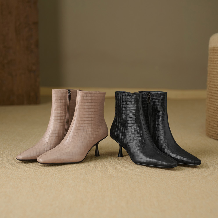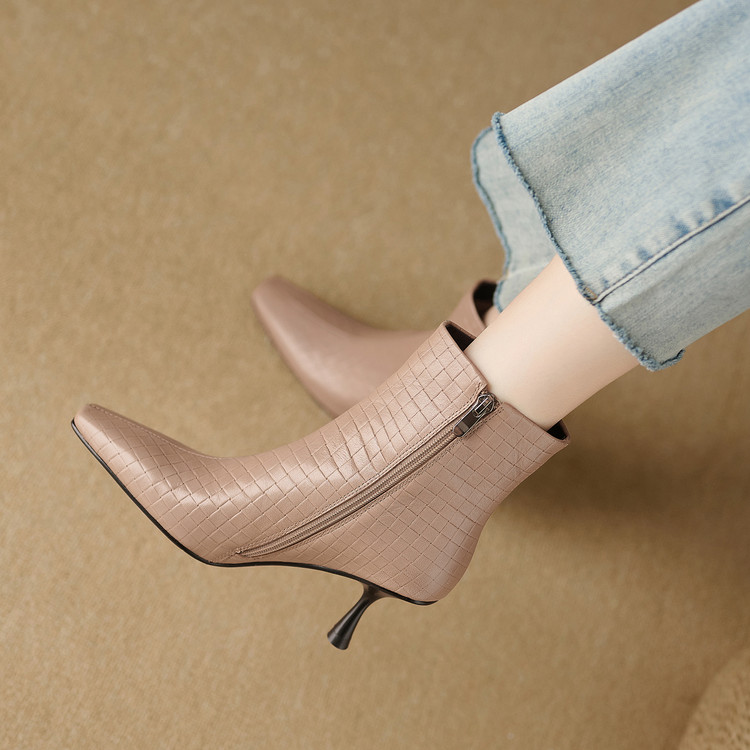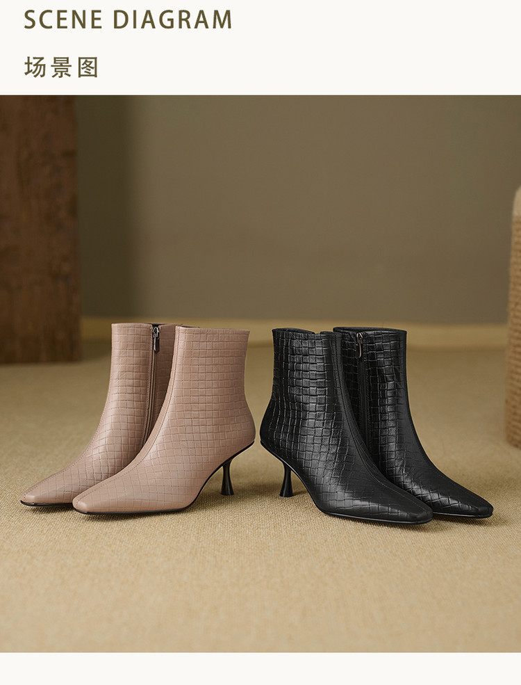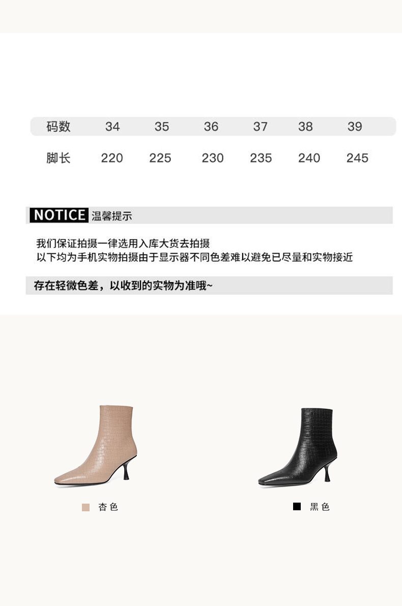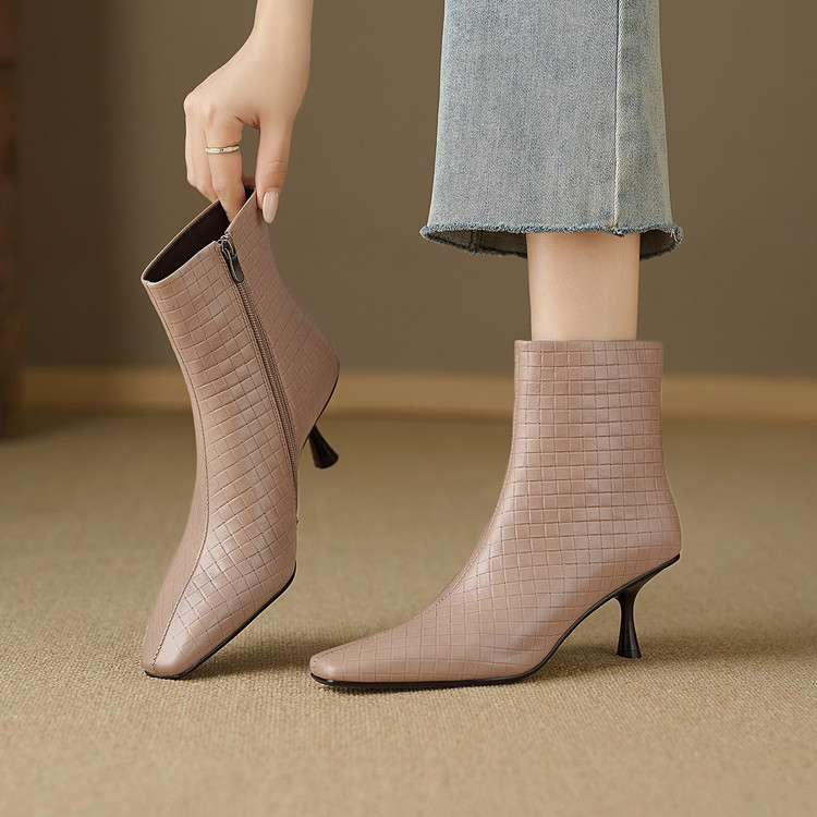 【预售5天】压花羊皮!杏色方头高跟短靴女新款真皮气质细跟侧拉链瘦瘦靴FDJ&YC-594