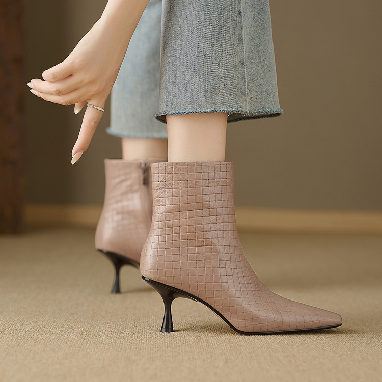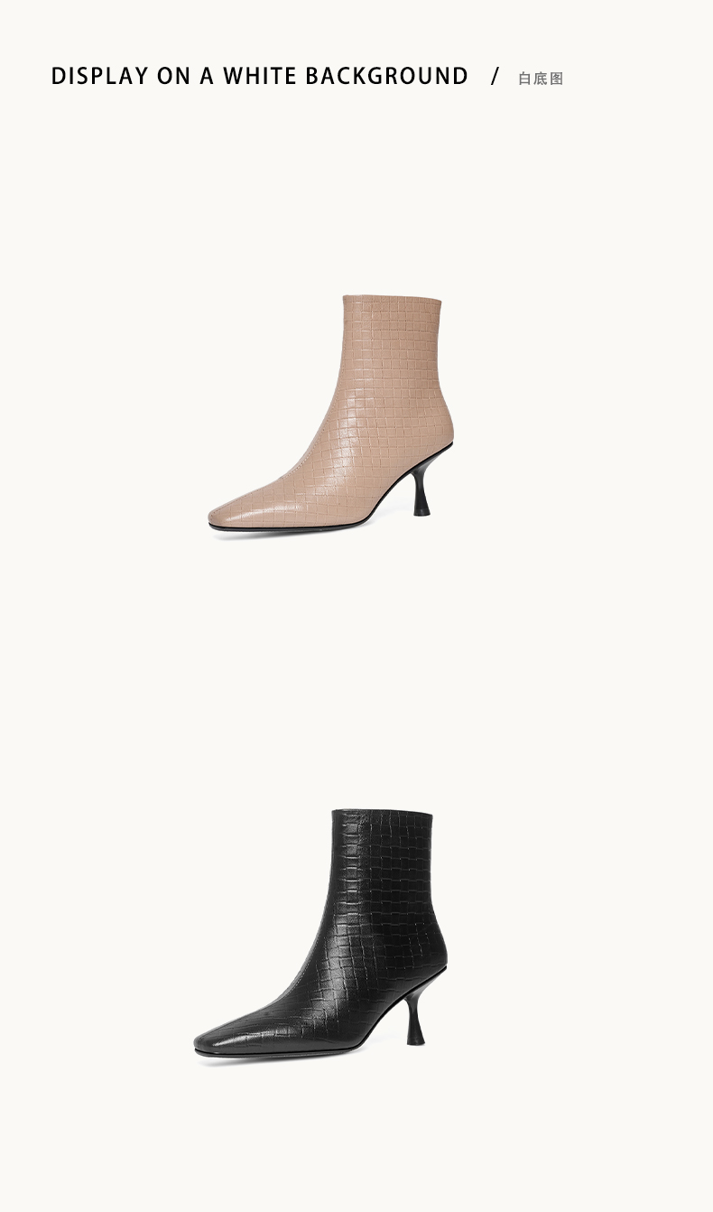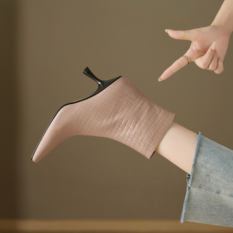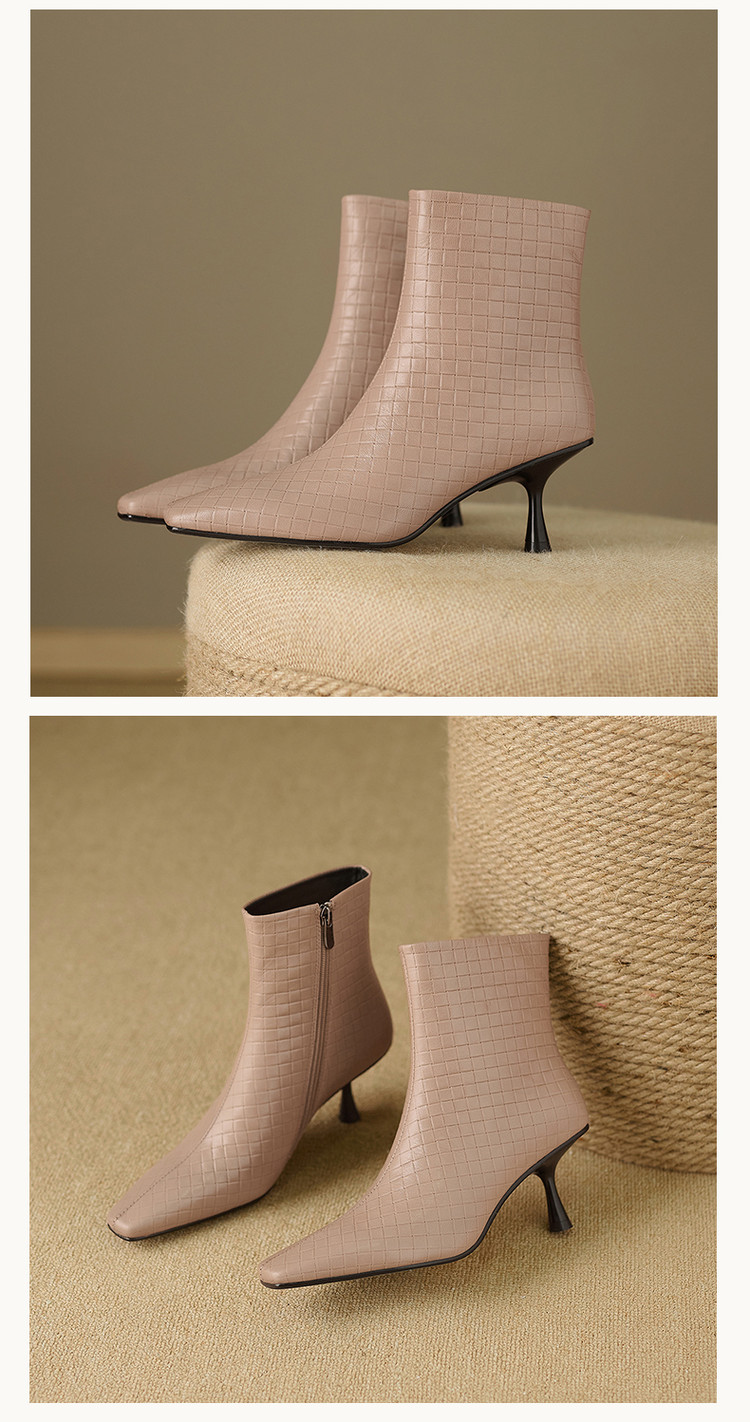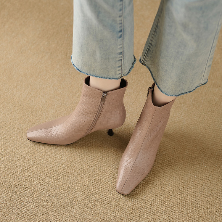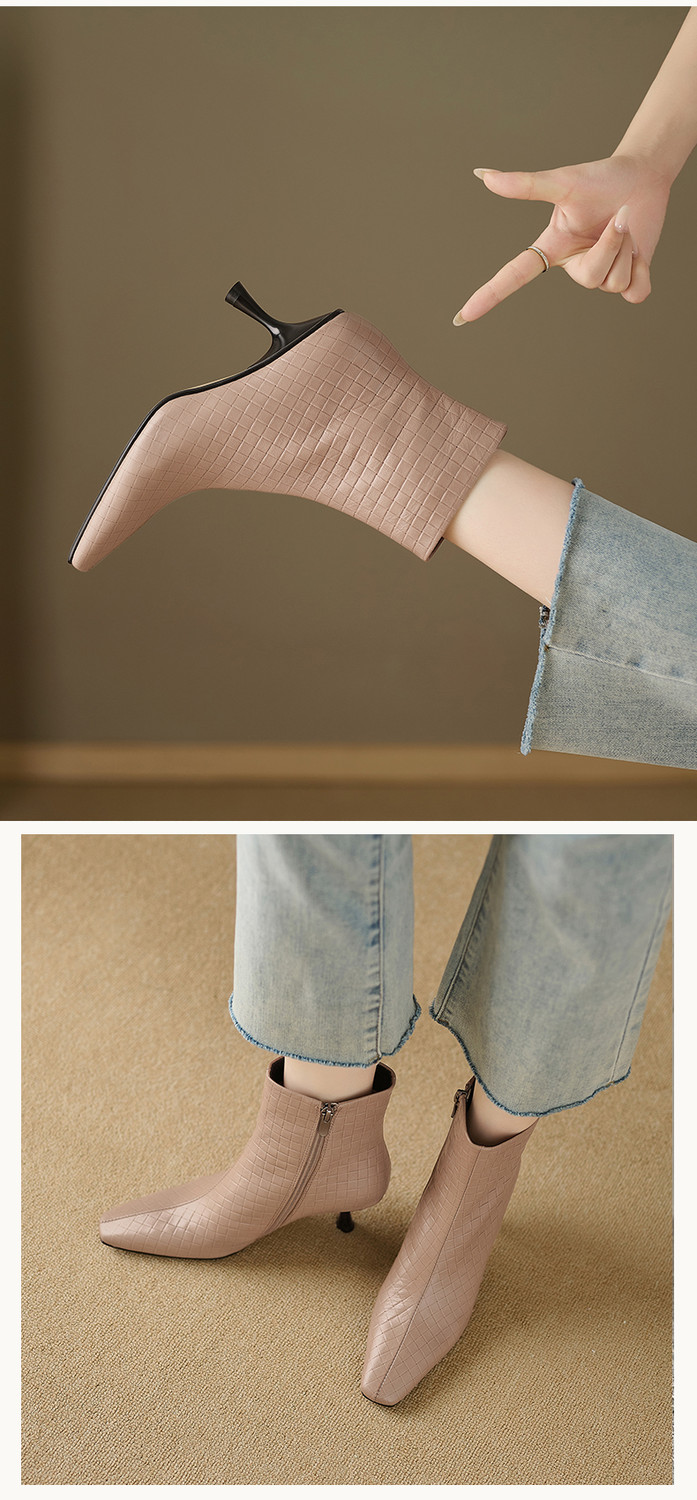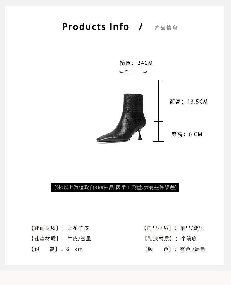 【预售5天】压花羊皮!杏色方头高跟短靴女新款真皮气质细跟侧拉链瘦瘦靴FDJ&YC-594