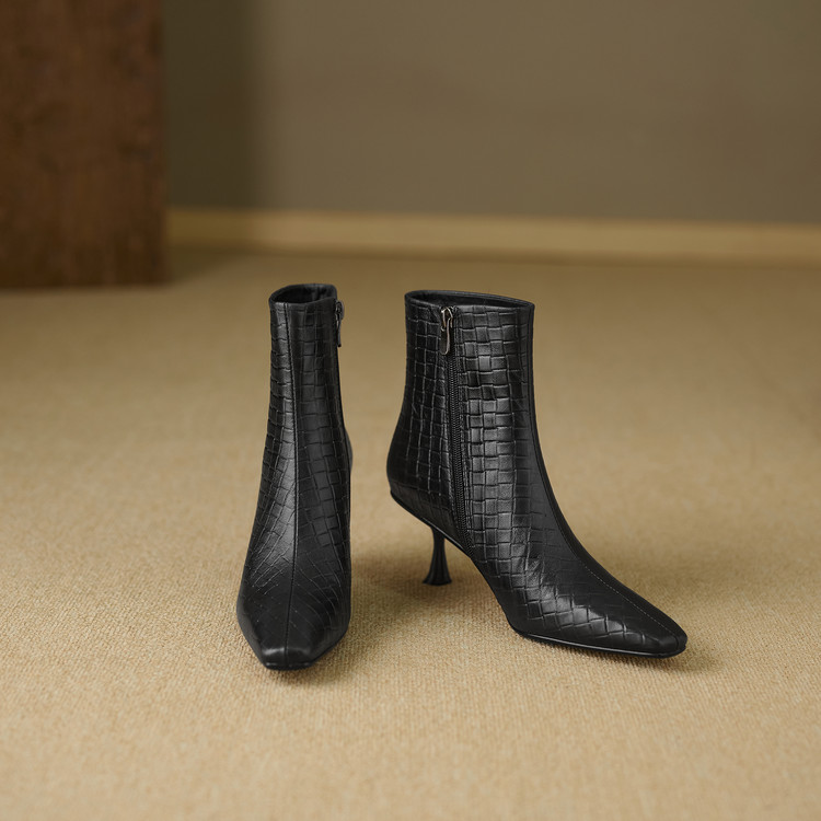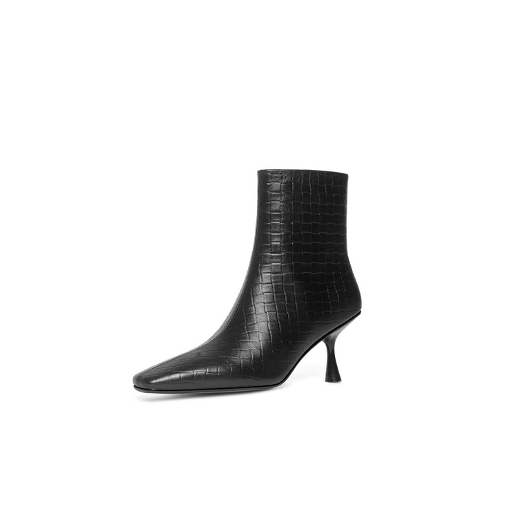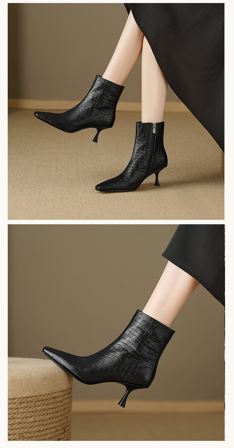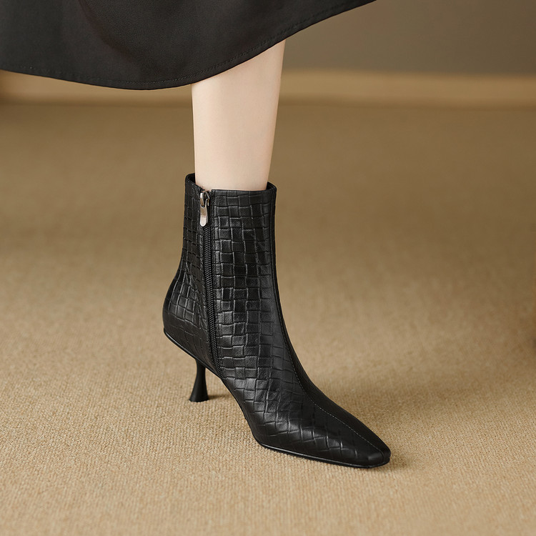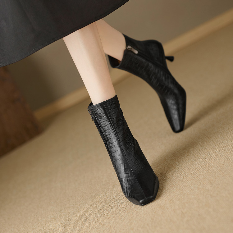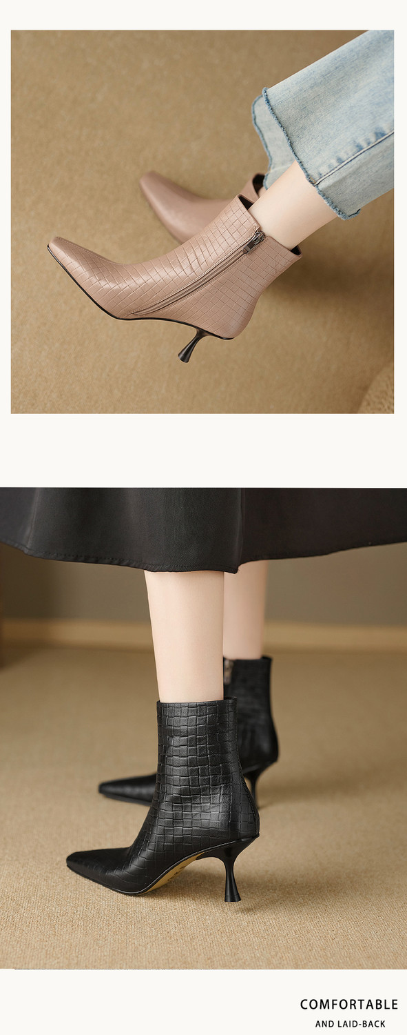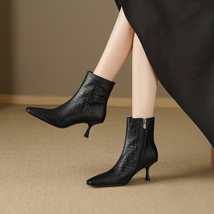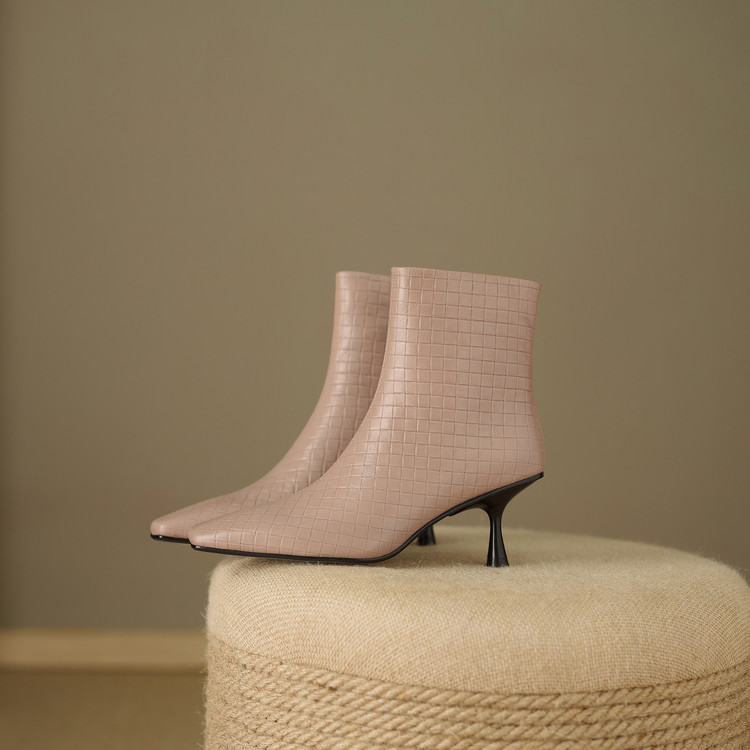 【预售5天】压花羊皮!杏色方头高跟短靴女新款真皮气质细跟侧拉链瘦瘦靴FDJ&YC-594