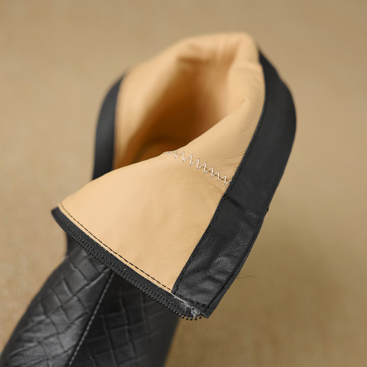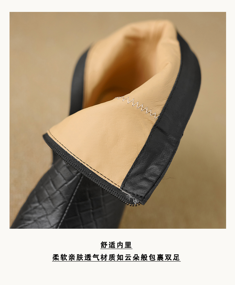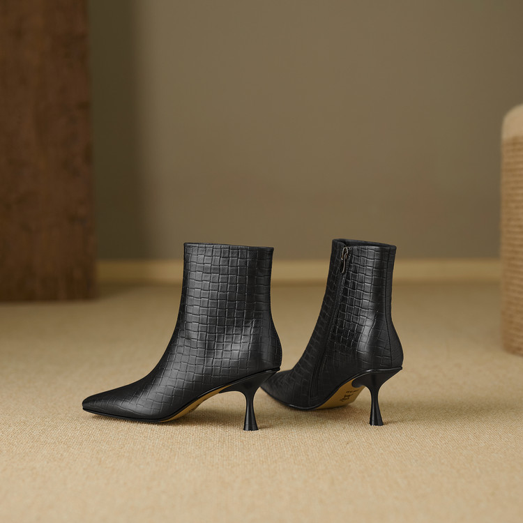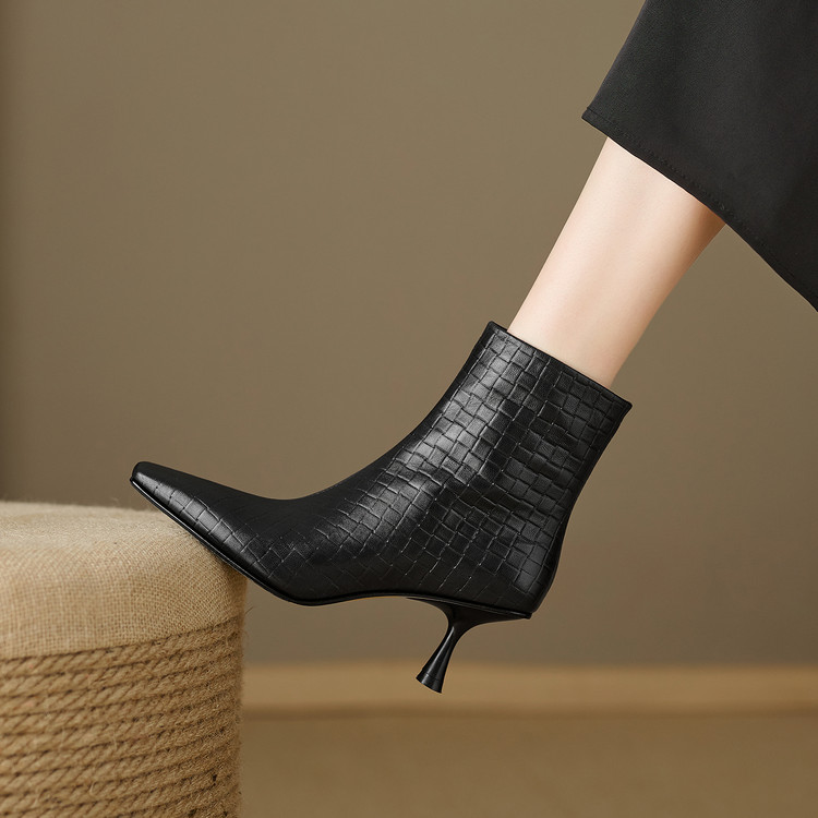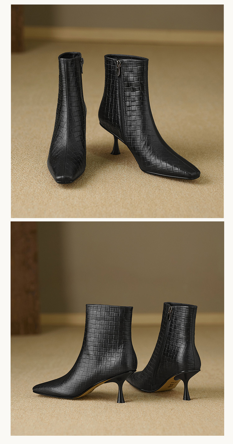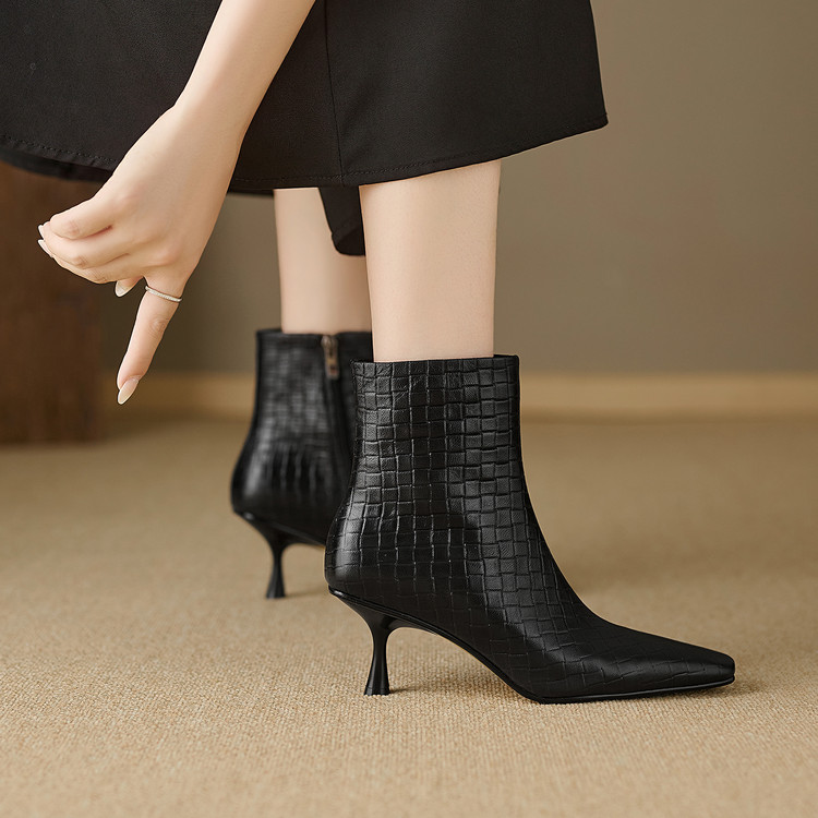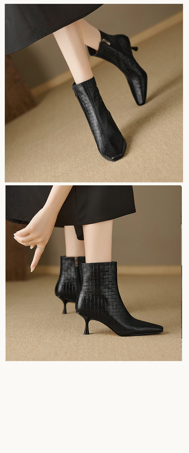 【预售5天】压花羊皮!杏色方头高跟短靴女新款真皮气质细跟侧拉链瘦瘦靴FDJ&YC-594