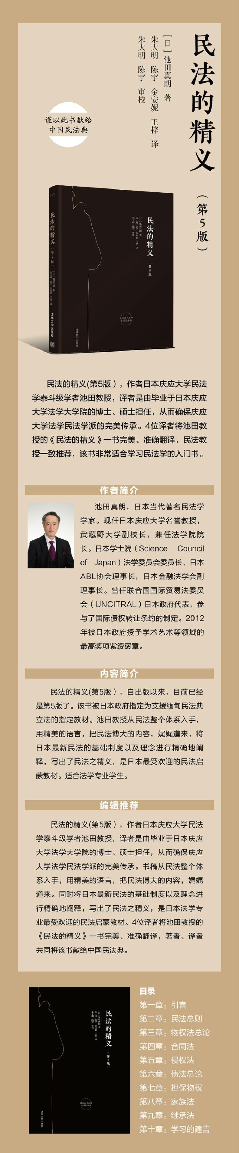 民法的精义(第5版),自出版以来,目前已经是第5版了。该书被日本政府定为支援缅甸民法典立法的定教材。池田教授从民法整个体系入手,用精美的语言,把民法博大的内容,娓娓道来,将日本新民法的基础制度以及理念进行精确地阐释,写出了民法之精义,是日本受欢迎的民法启蒙教材。适合法学专业学生。