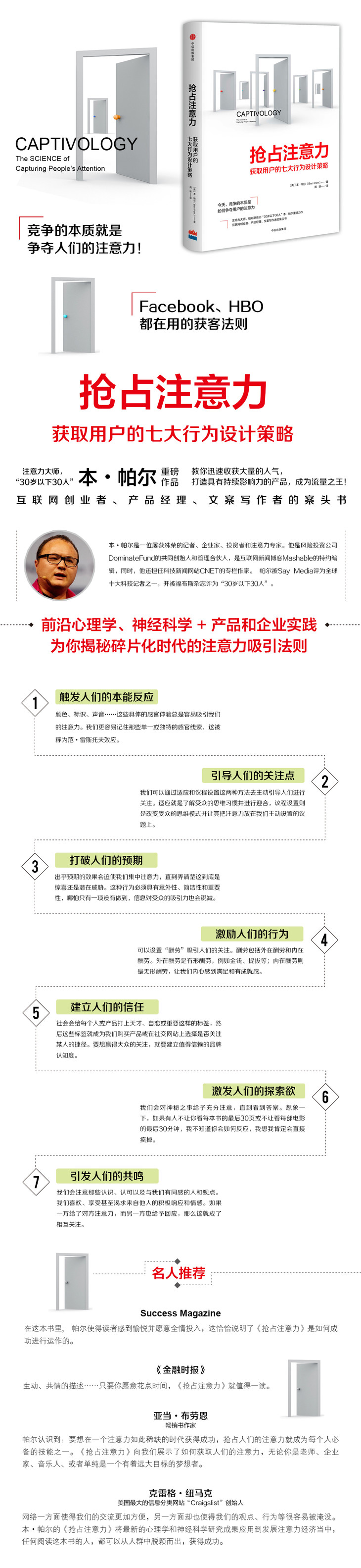 这背后都隐藏着用户注意力的行为设计机制。《抢占注意力》一书结合心理学、脑科学和行为设计学的新研究成果,揭开了人类注意力的秘密,从七个方面阐述了注意力的触发机制:自动机制、建构机制、解构机制、酬劳机制、声誉机制、秘密机制以及共识机制。这些机制激发了人类大脑的反应系统,通过单独运用以及组合运用,就可以捕获关注,俘获人心,打造具有持续影响力的产品。