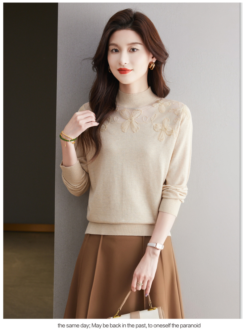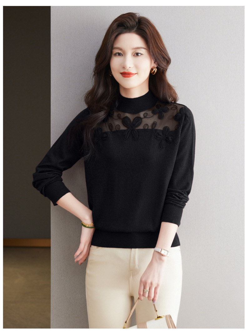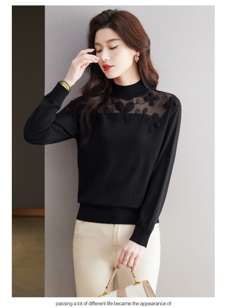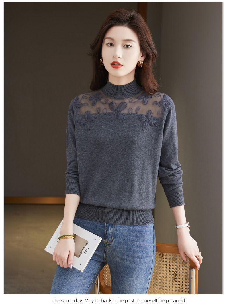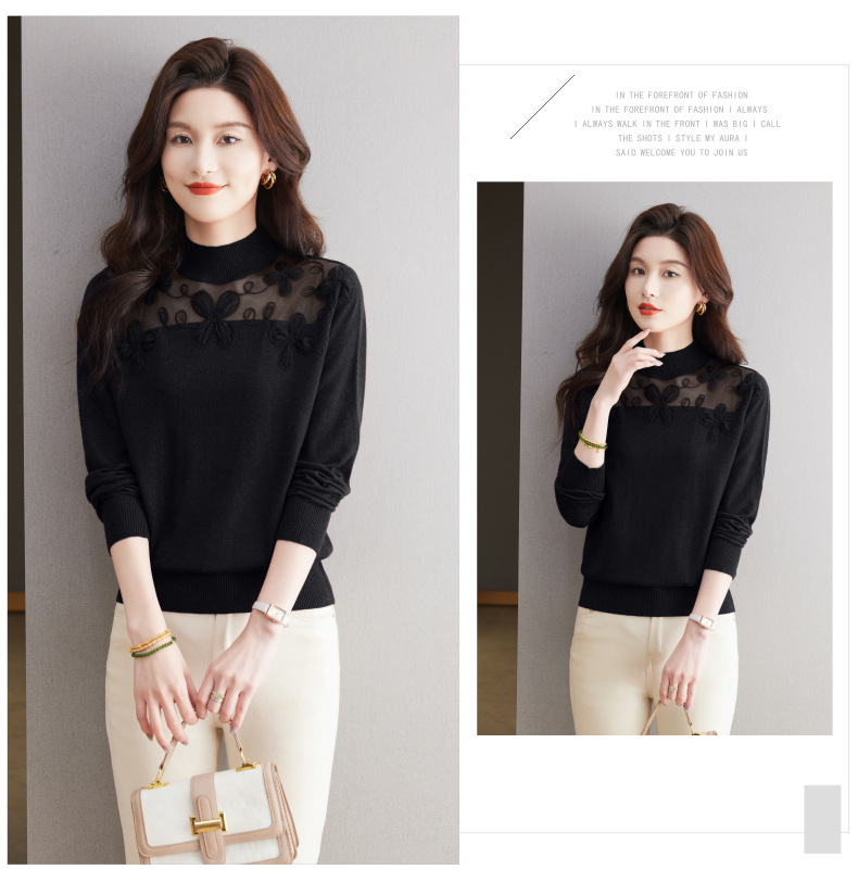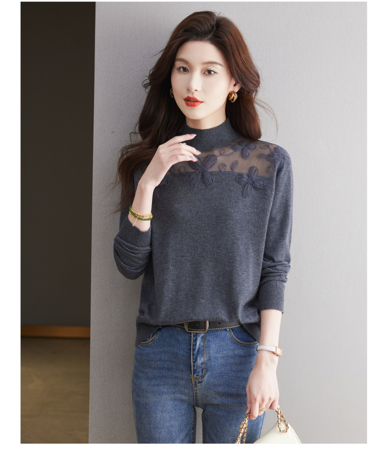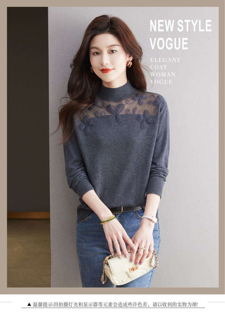 CC-17-2239春秋针织打底衫女士2024新款洋气时尚蕾丝刺绣花内搭长袖t恤上衣