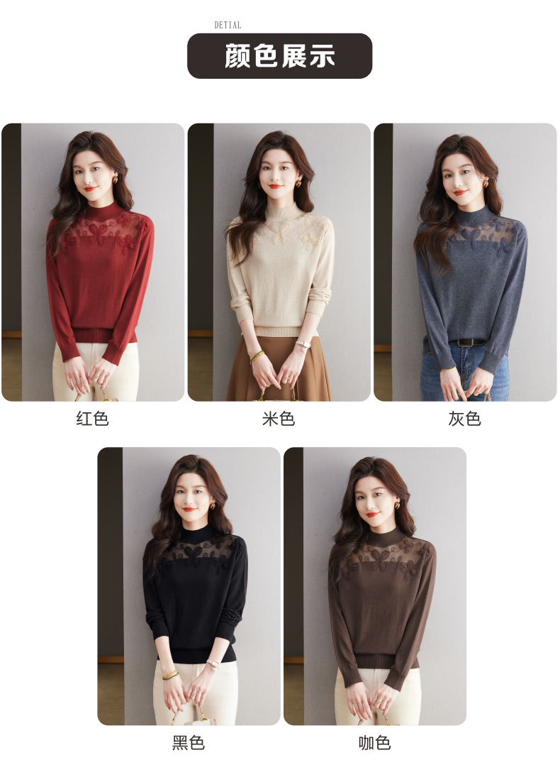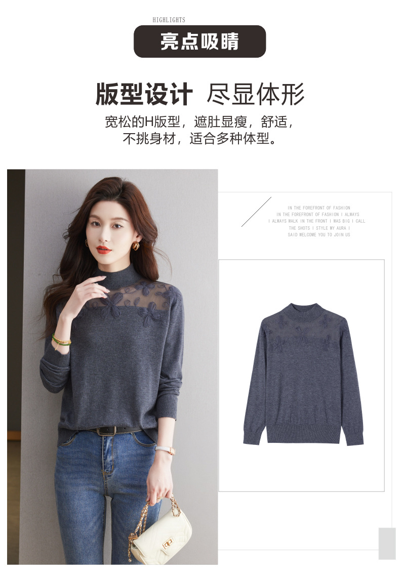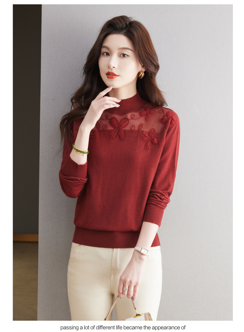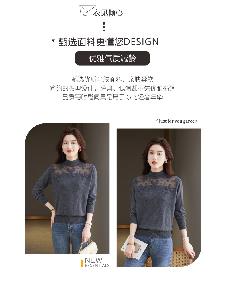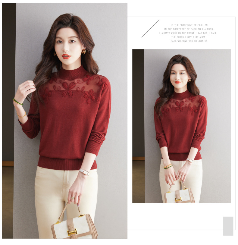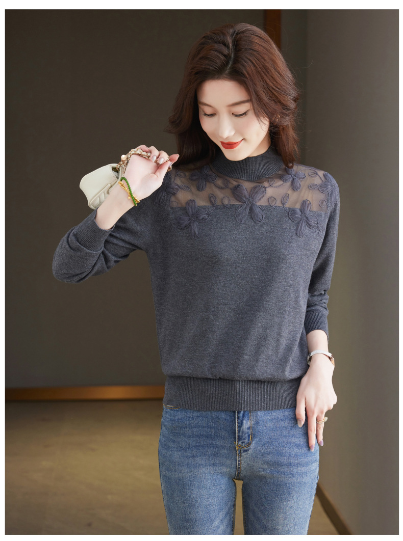 CC-17-2239春秋针织打底衫女士2024新款洋气时尚蕾丝刺绣花内搭长袖t恤上衣