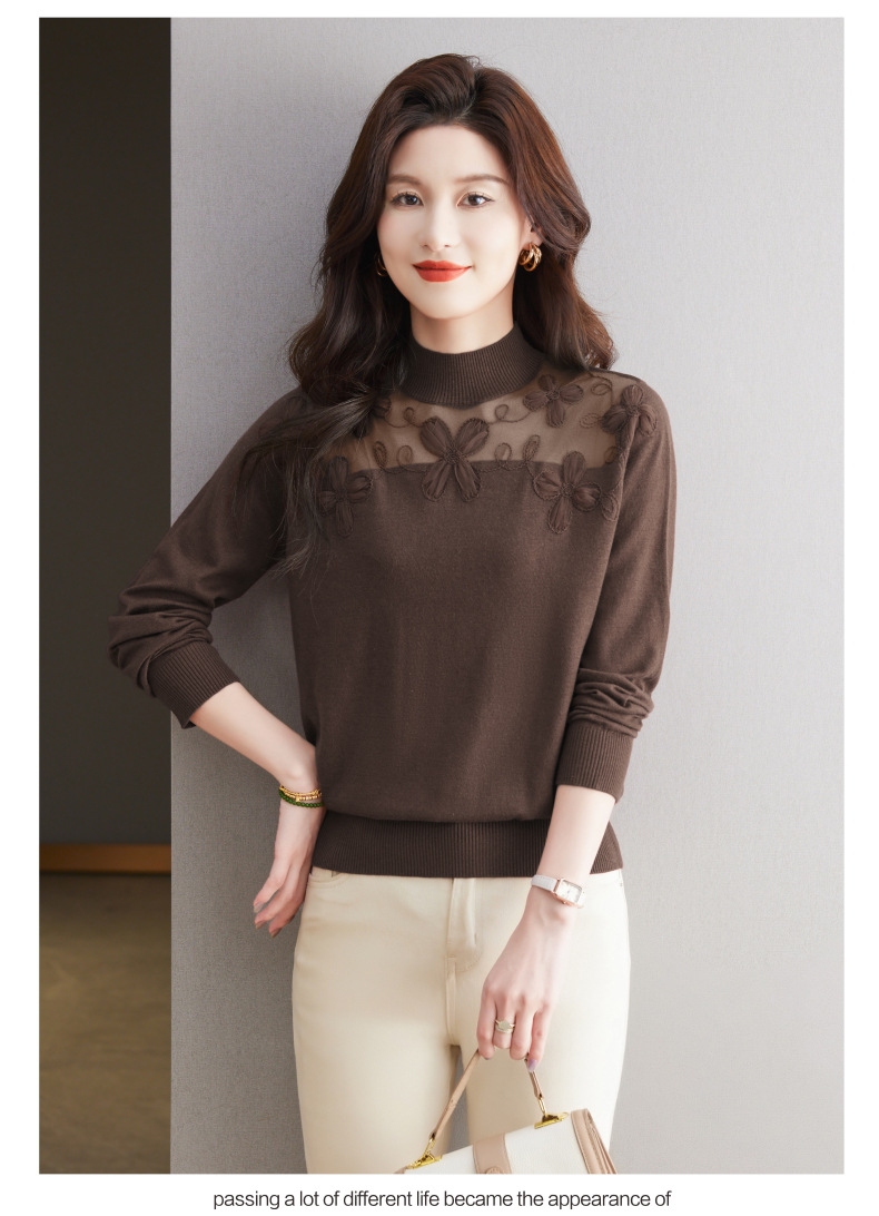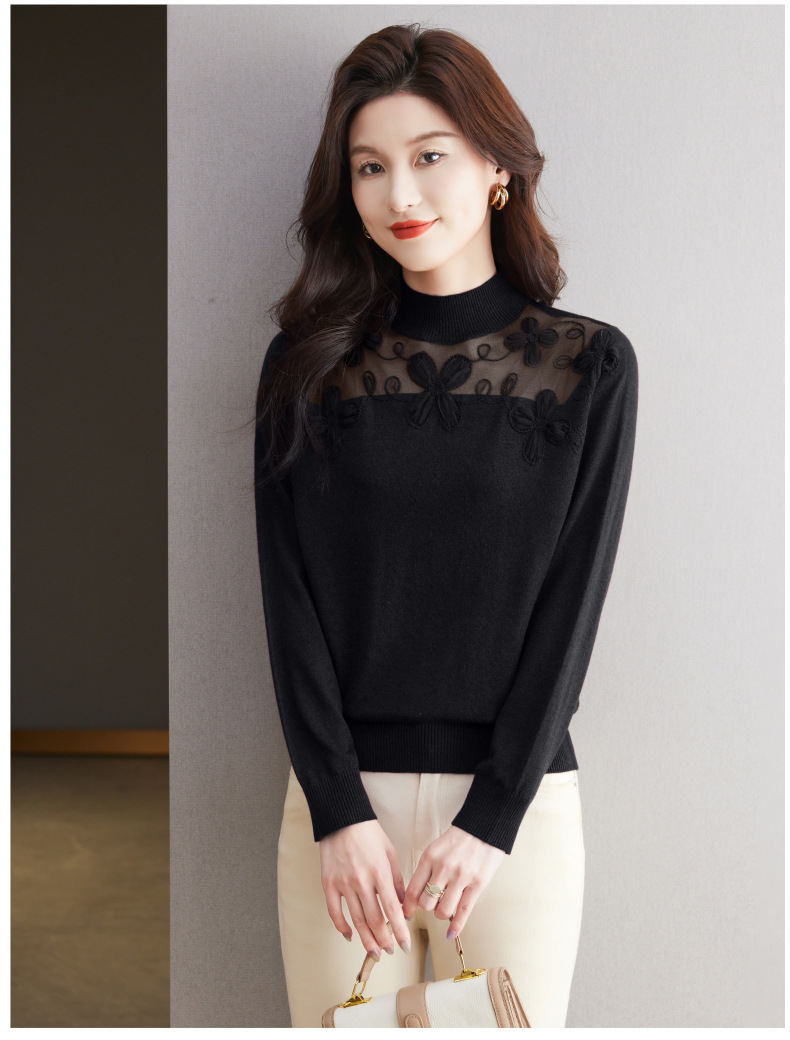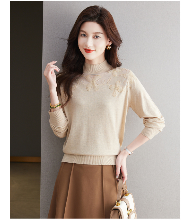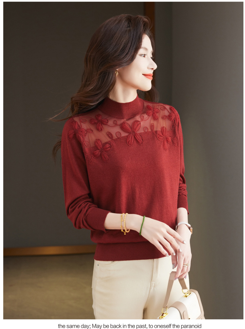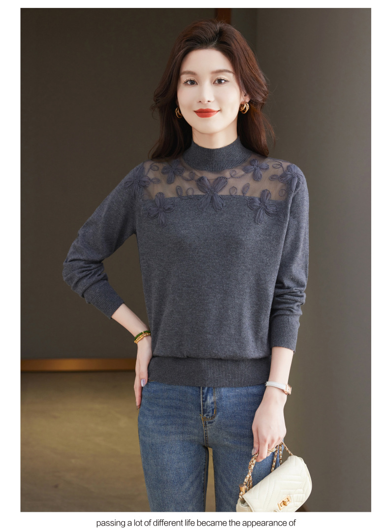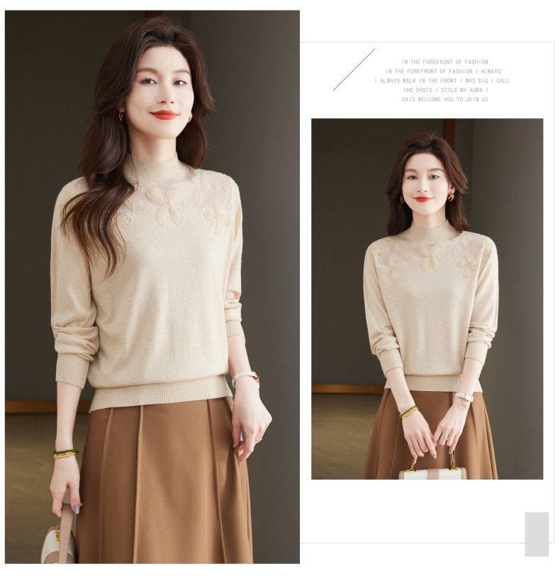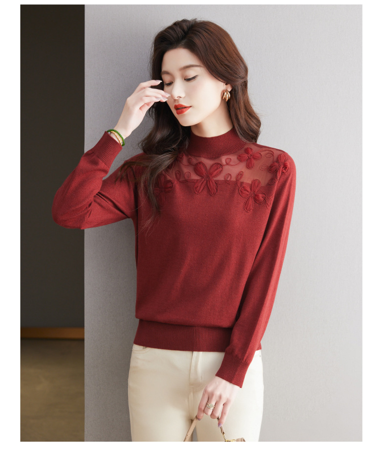 CC-17-2239春秋针织打底衫女士2024新款洋气时尚蕾丝刺绣花内搭长袖t恤上衣