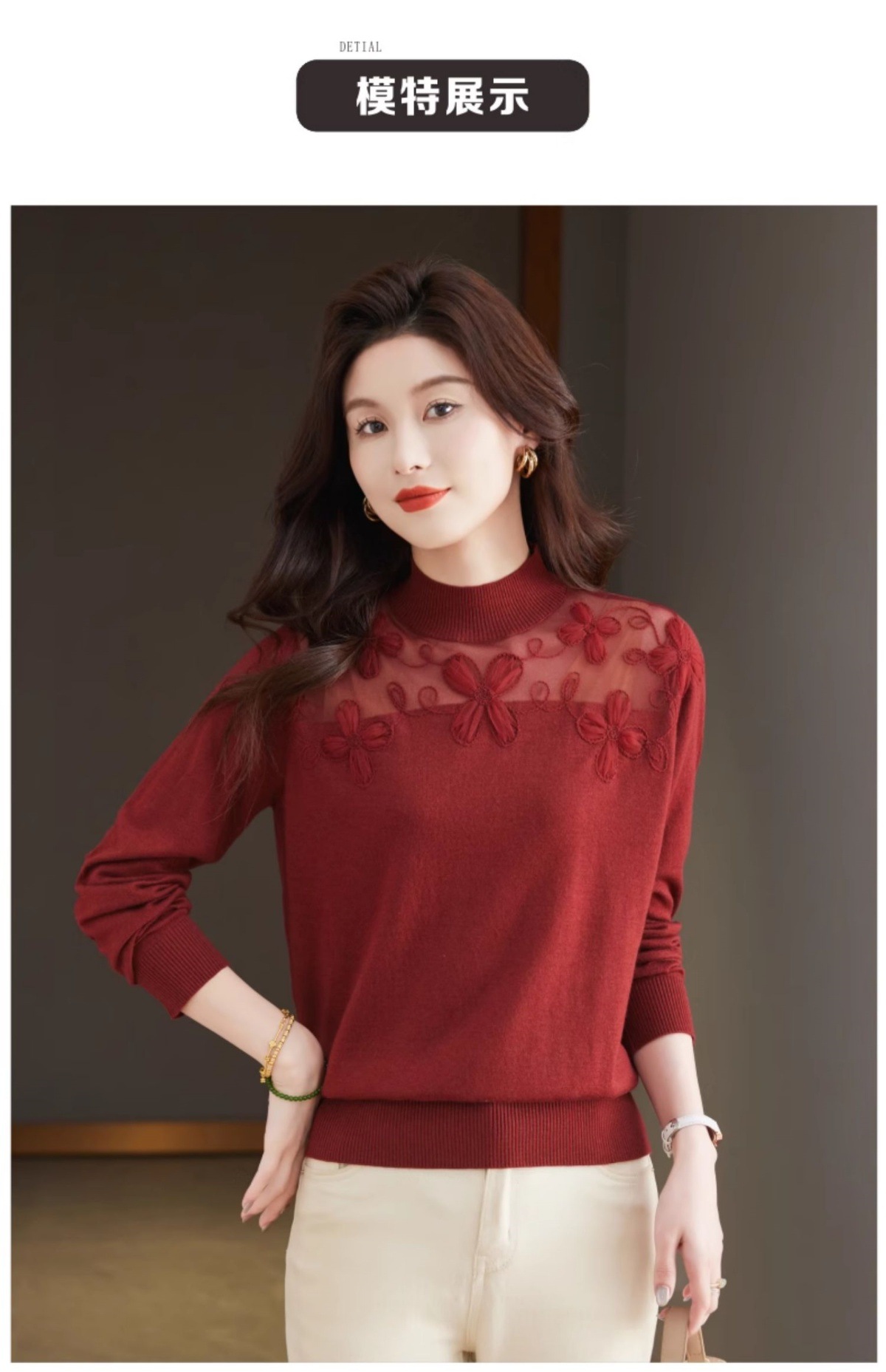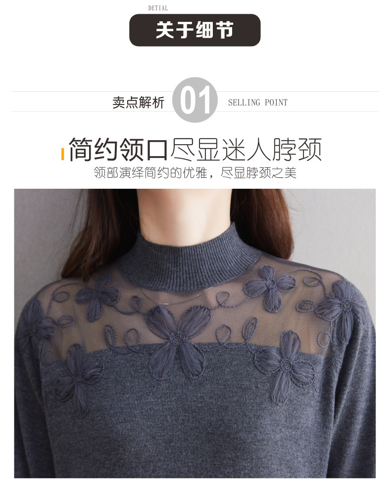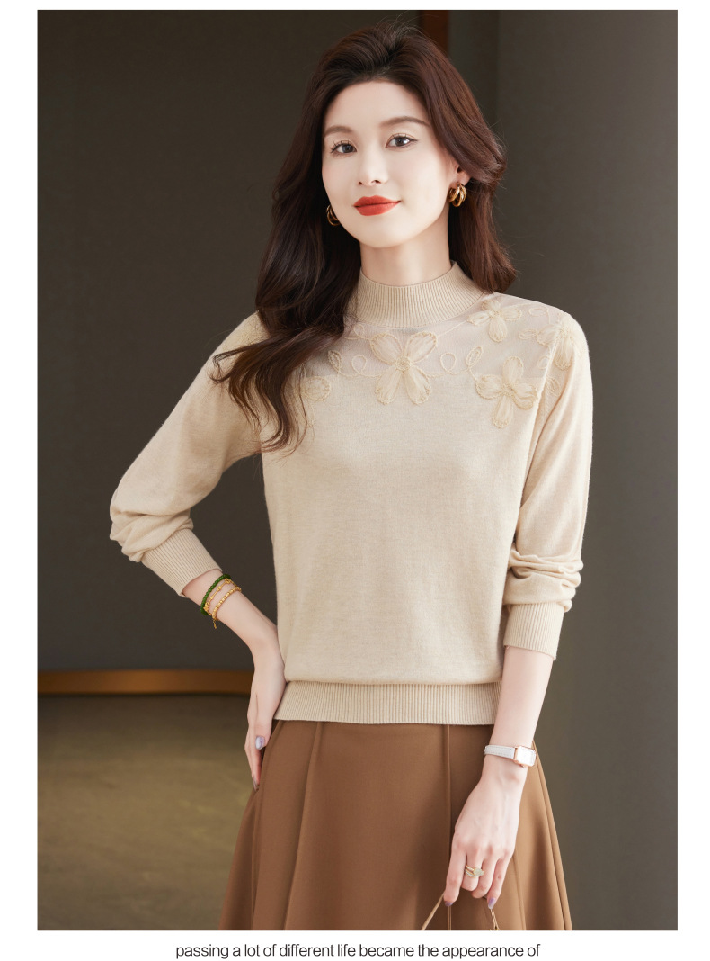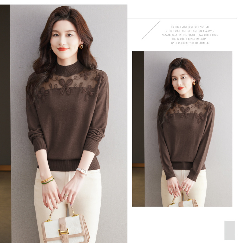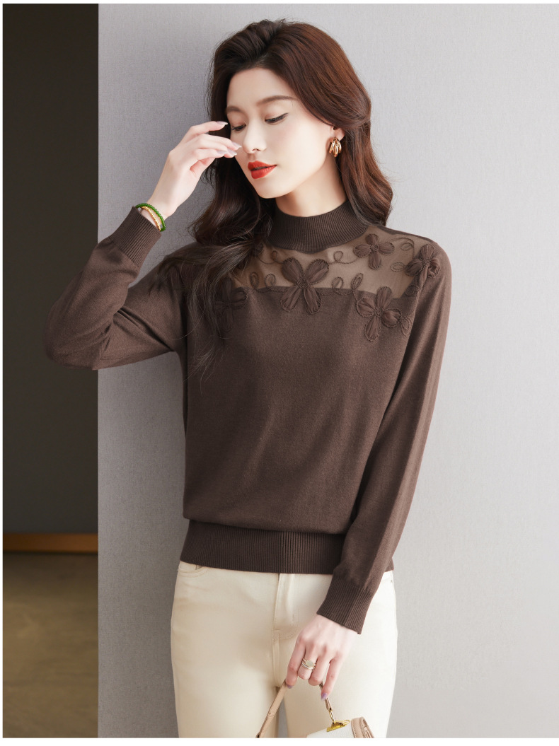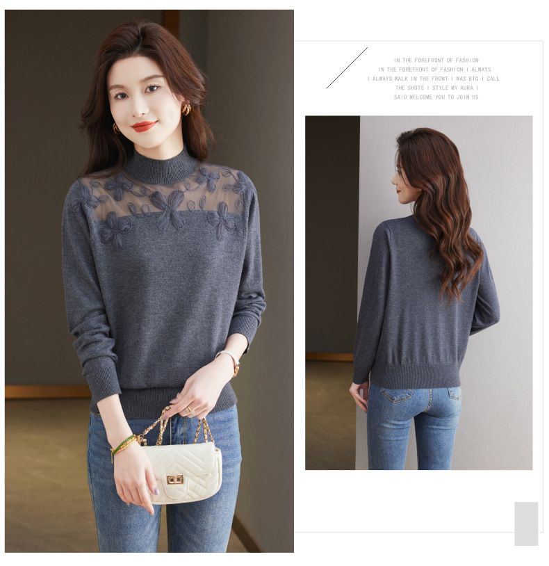 CC-17-2239春秋针织打底衫女士2024新款洋气时尚蕾丝刺绣花内搭长袖t恤上衣