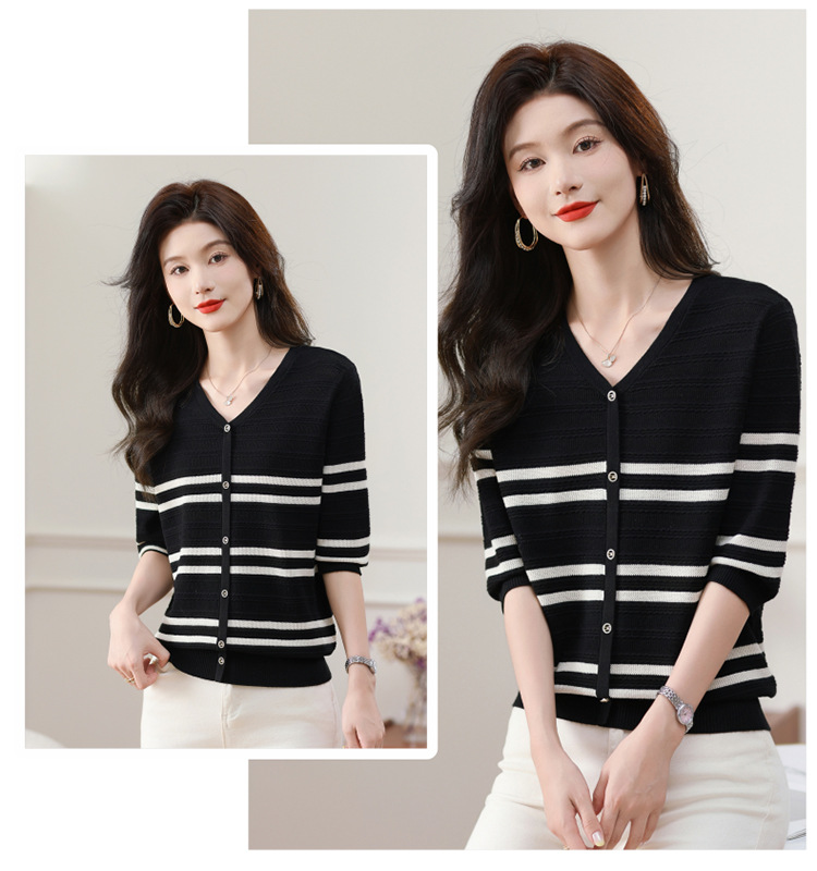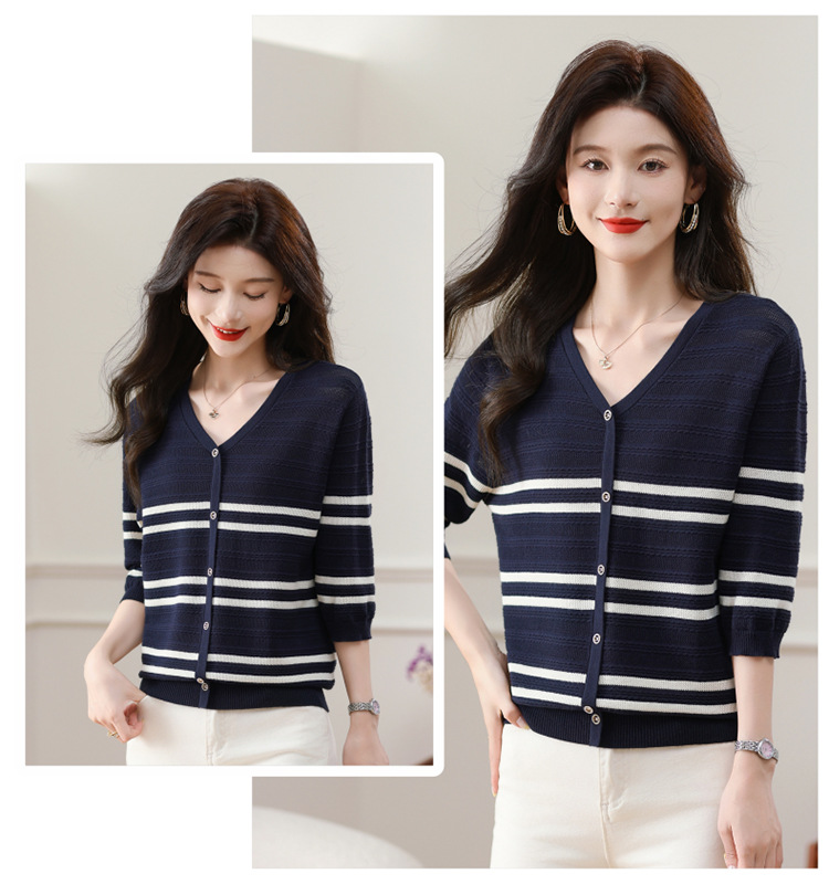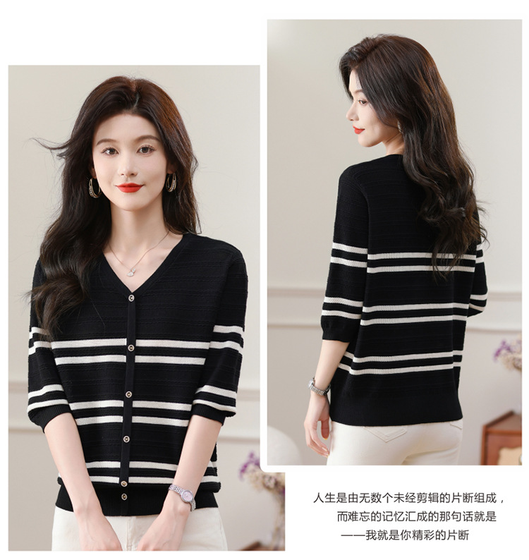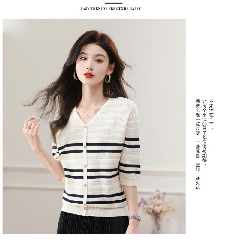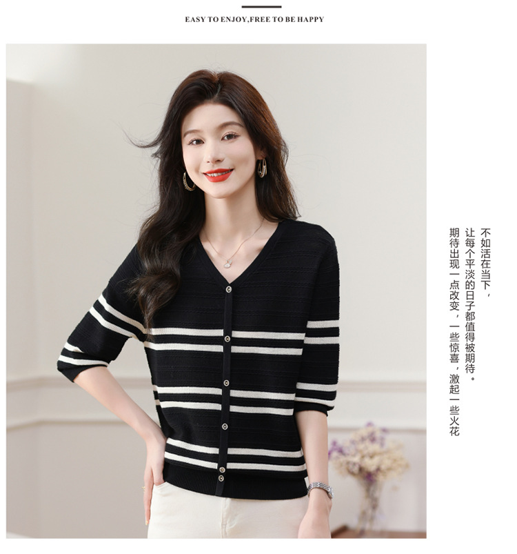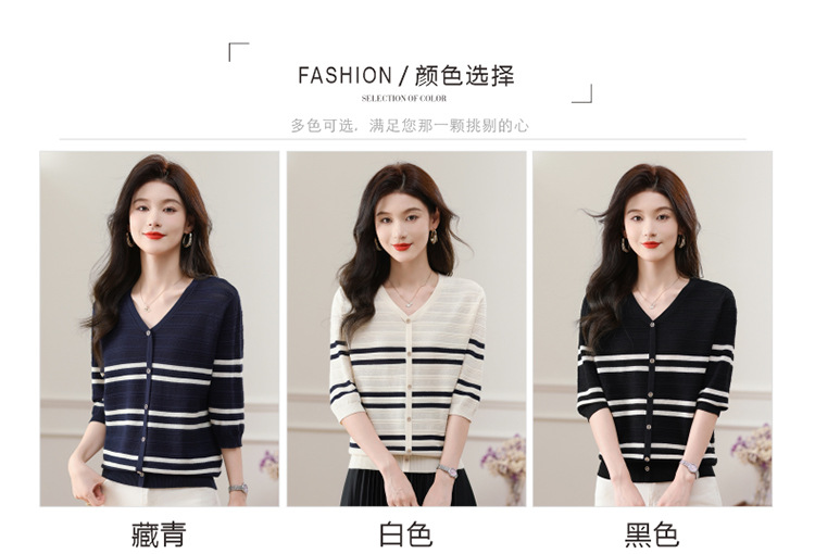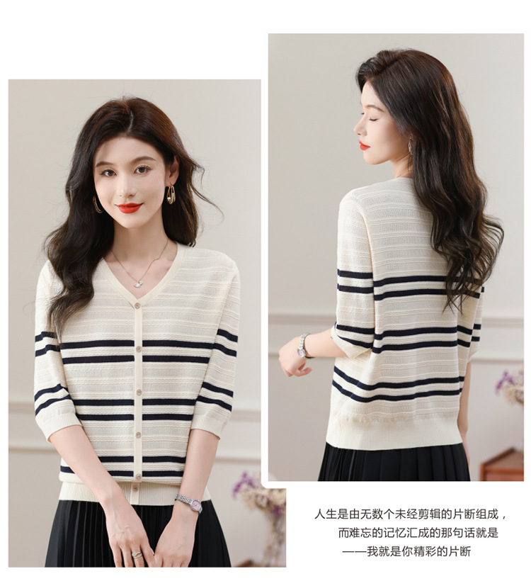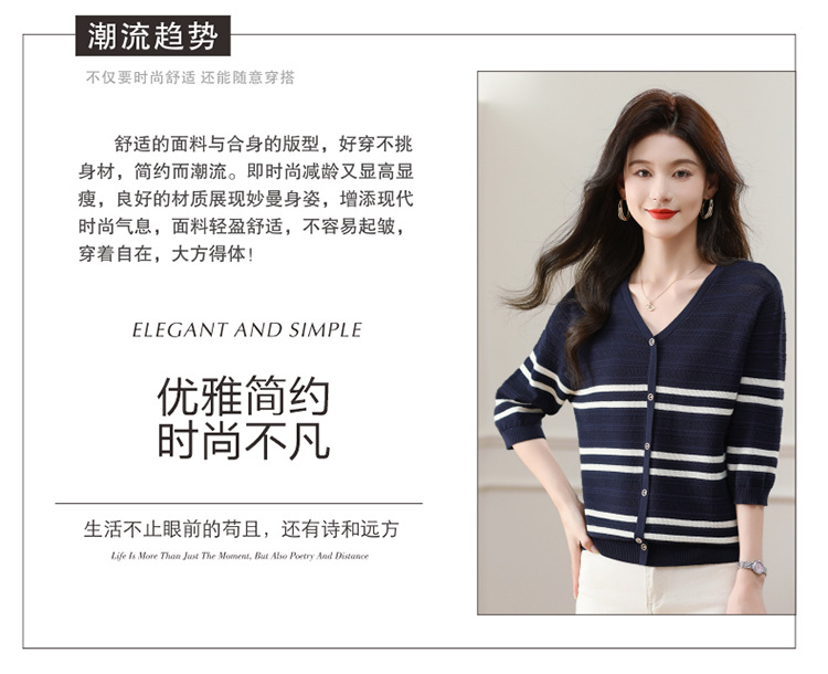 CC-5-6006小香风条纹针织衫中袖t恤女2024早秋装薄款时尚洋气七分袖上衣