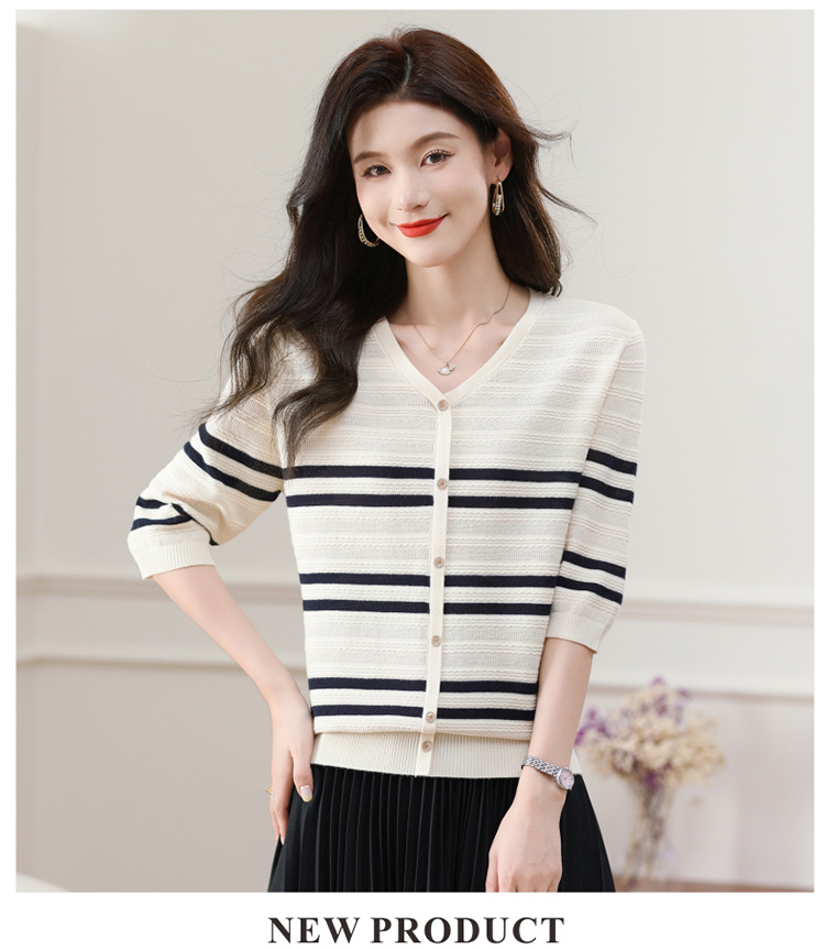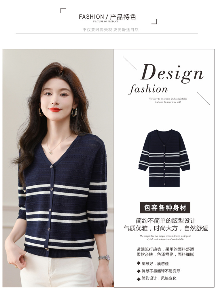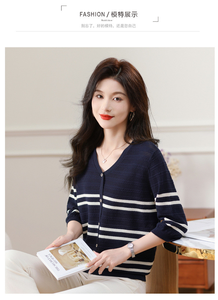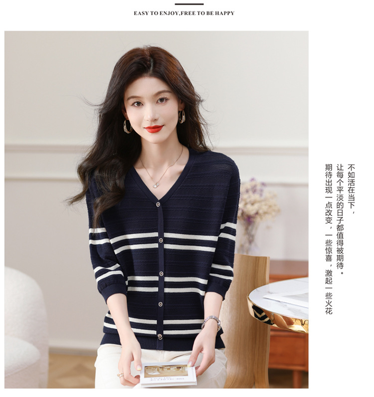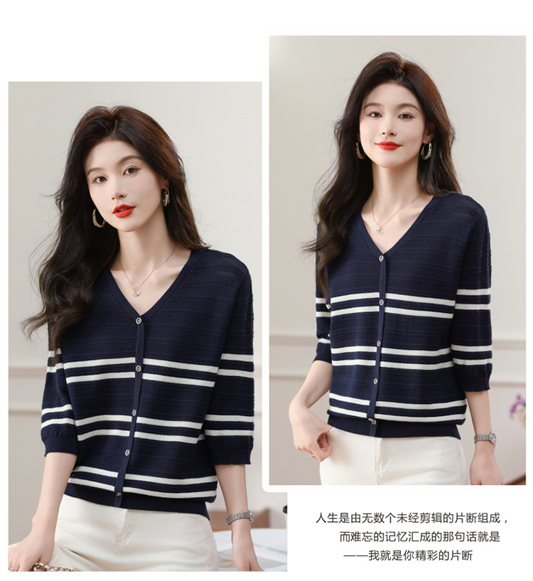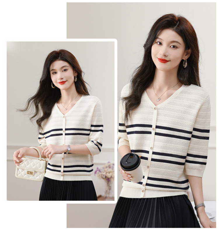 CC-5-6006小香风条纹针织衫中袖t恤女2024早秋装薄款时尚洋气七分袖上衣