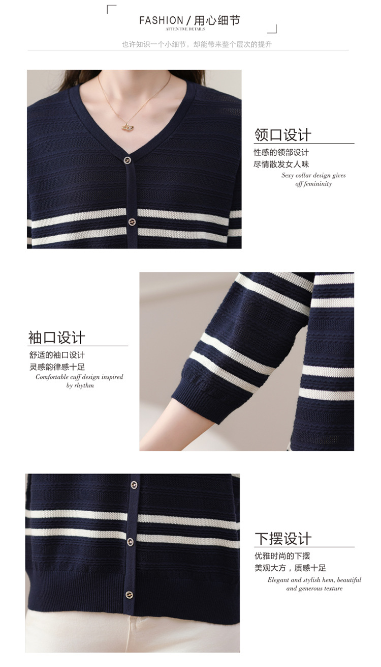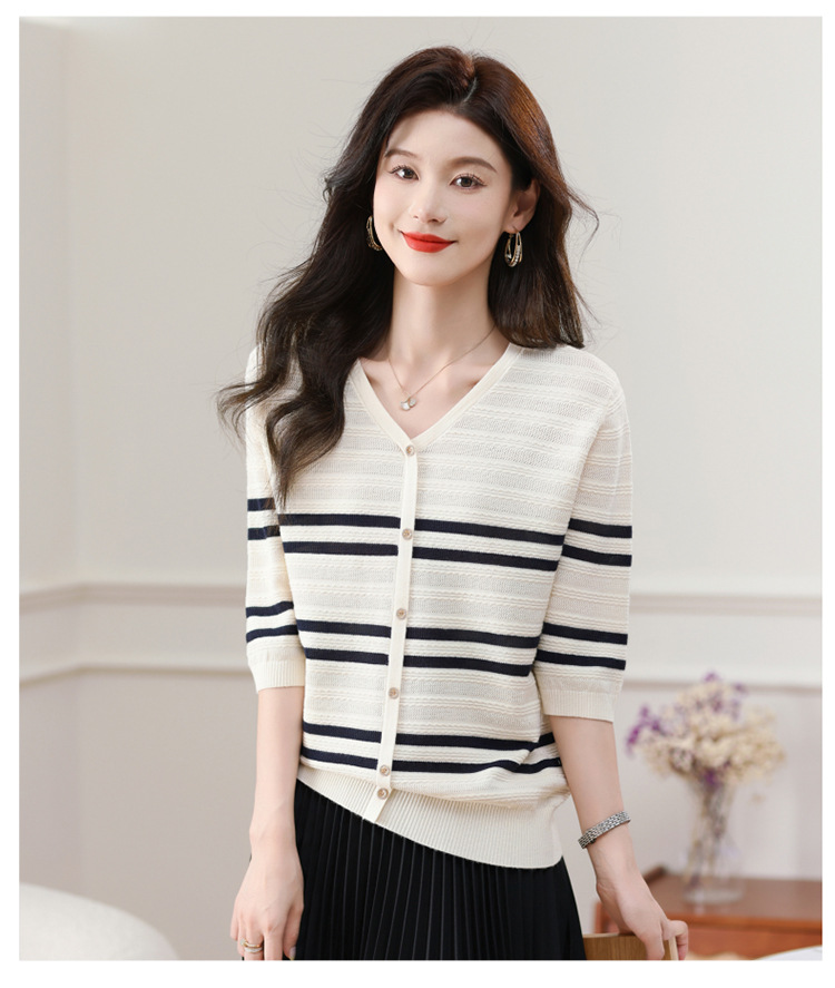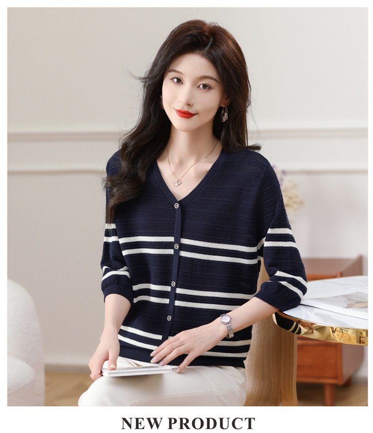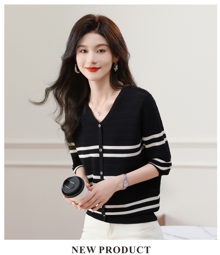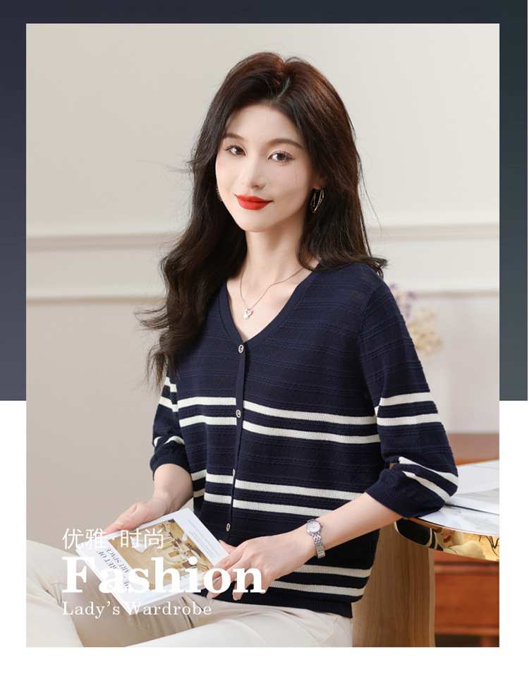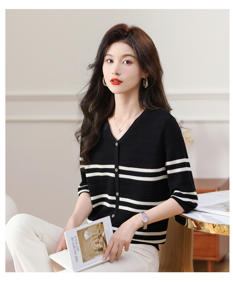 CC-5-6006小香风条纹针织衫中袖t恤女2024早秋装薄款时尚洋气七分袖上衣