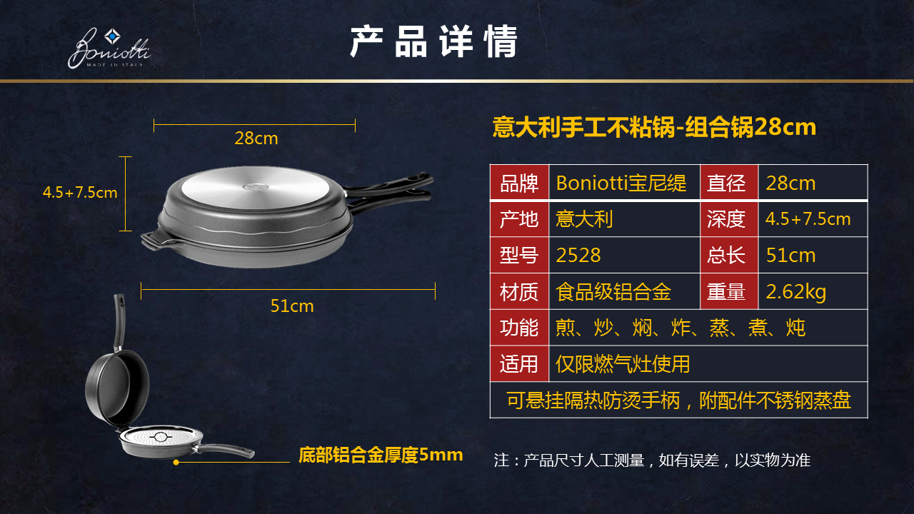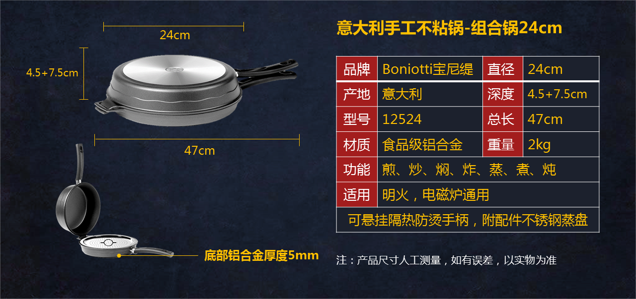 【煎炒蒸全能】Boniotti宝尼缇意大利不粘锅多功能组合锅24cm 煎锅+炒锅+蒸锅 赠蒸架
