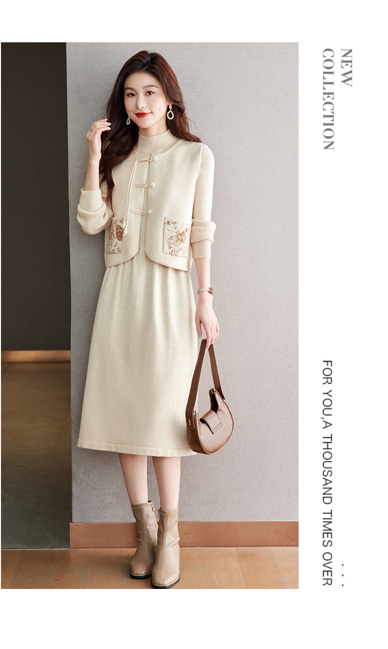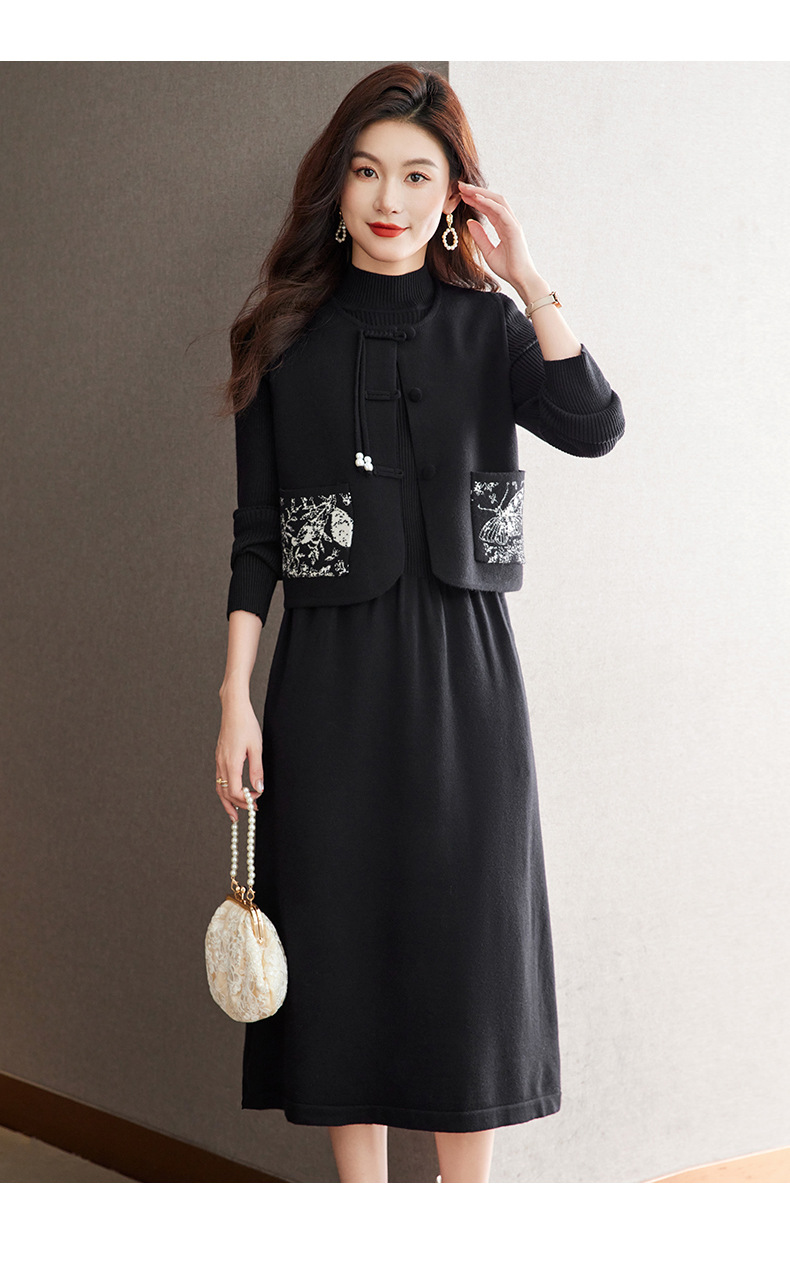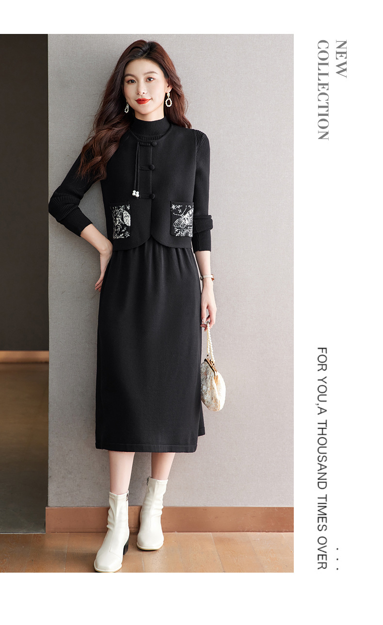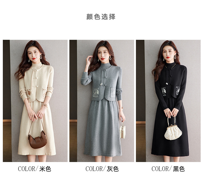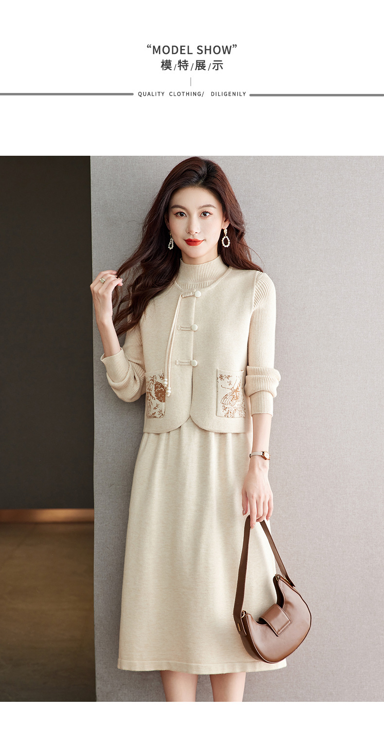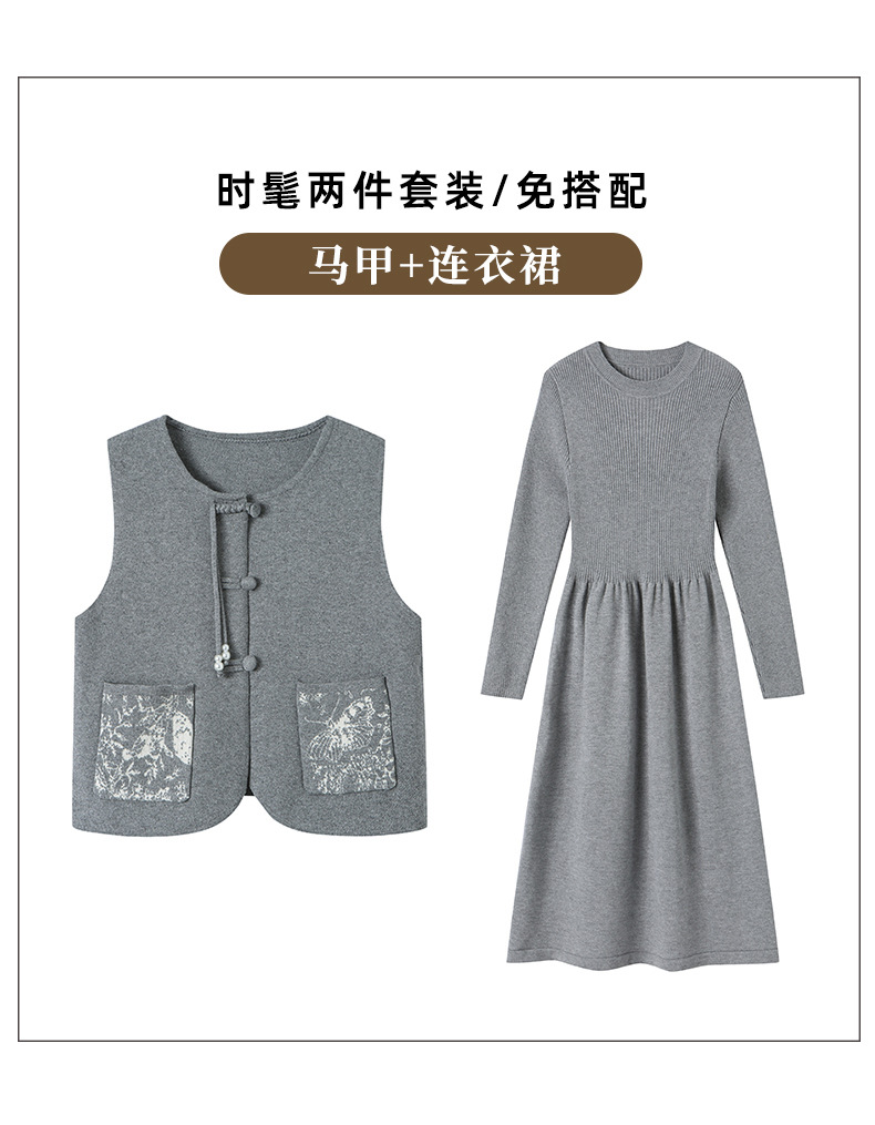 秋冬季国风马甲羊毛针织修身连衣裙两件套2024法式中长款套装裙CC&22-1305