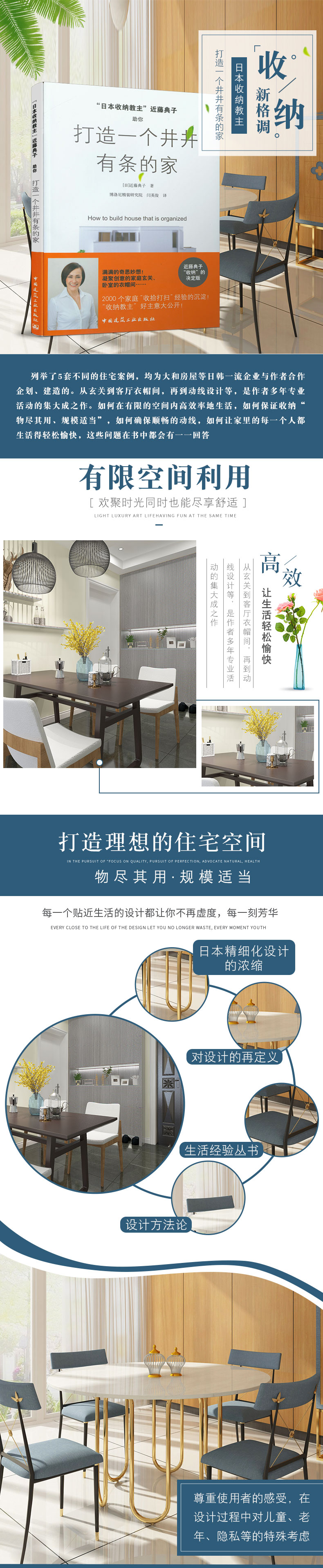 书列举了5套不同的住宅案例,均为大和房屋等日韩企业与作者合作企划、建造的。从玄关到客厅衣帽间,再到动线设计等,是作者多年专业活动的集大成之作。如何在有限的空间内高效率地生活,如何保证收纳“物尽其用、规模适当”,如何确保顺畅的动线,如何让家里的每一个人都生活得轻松愉快,这些问题在书中都会有一一回答。