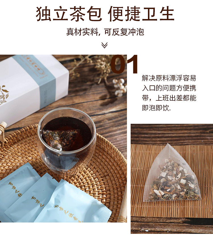 用法用量:每日一次,一次一包,70°温开水浸泡10分钟即可饮用。