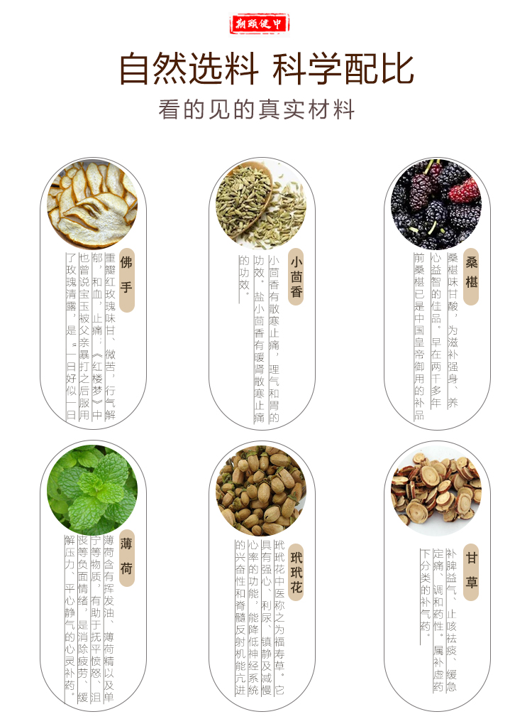 配料:佛手,玳玳花,小茴香,薄荷,桑椹,甘草