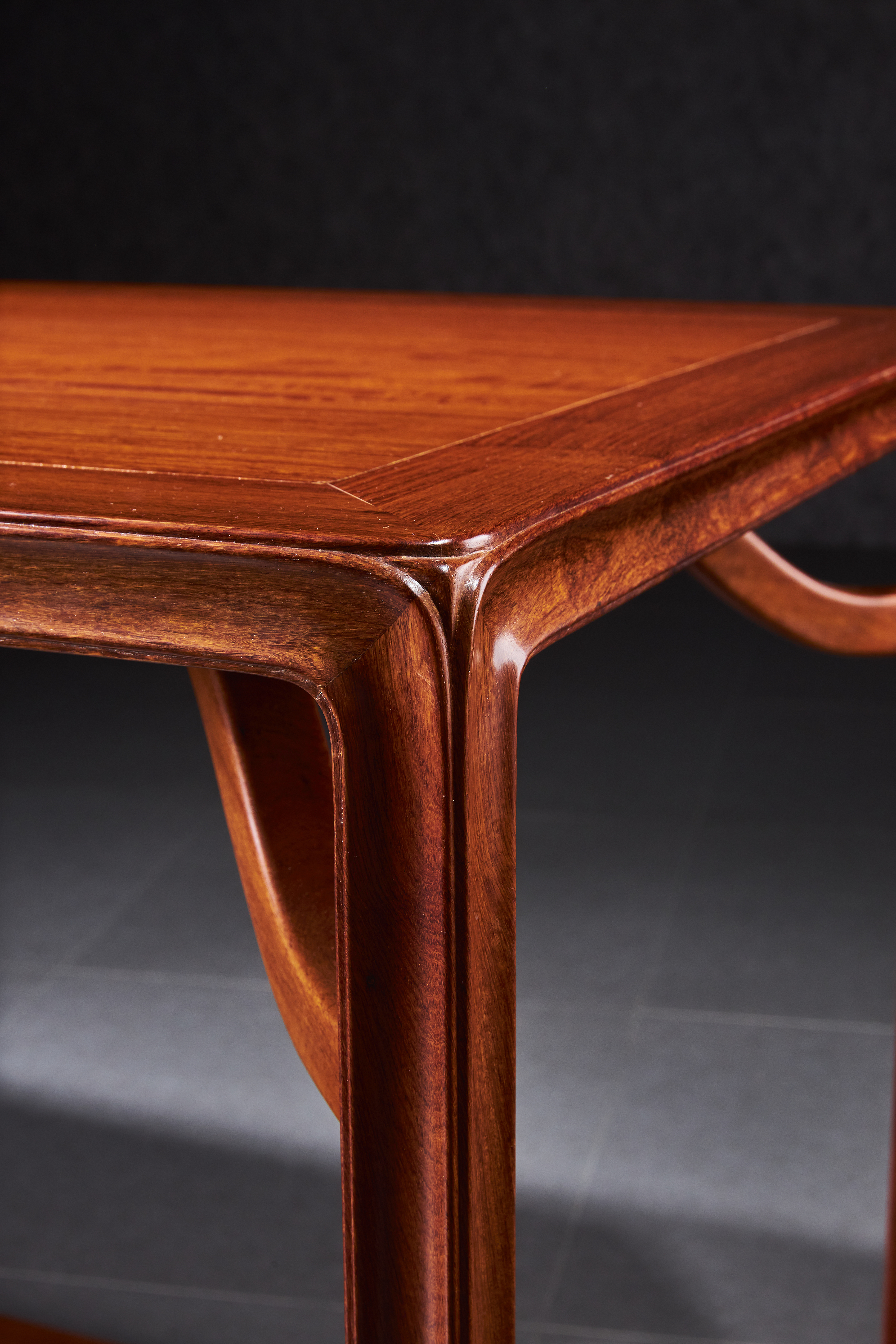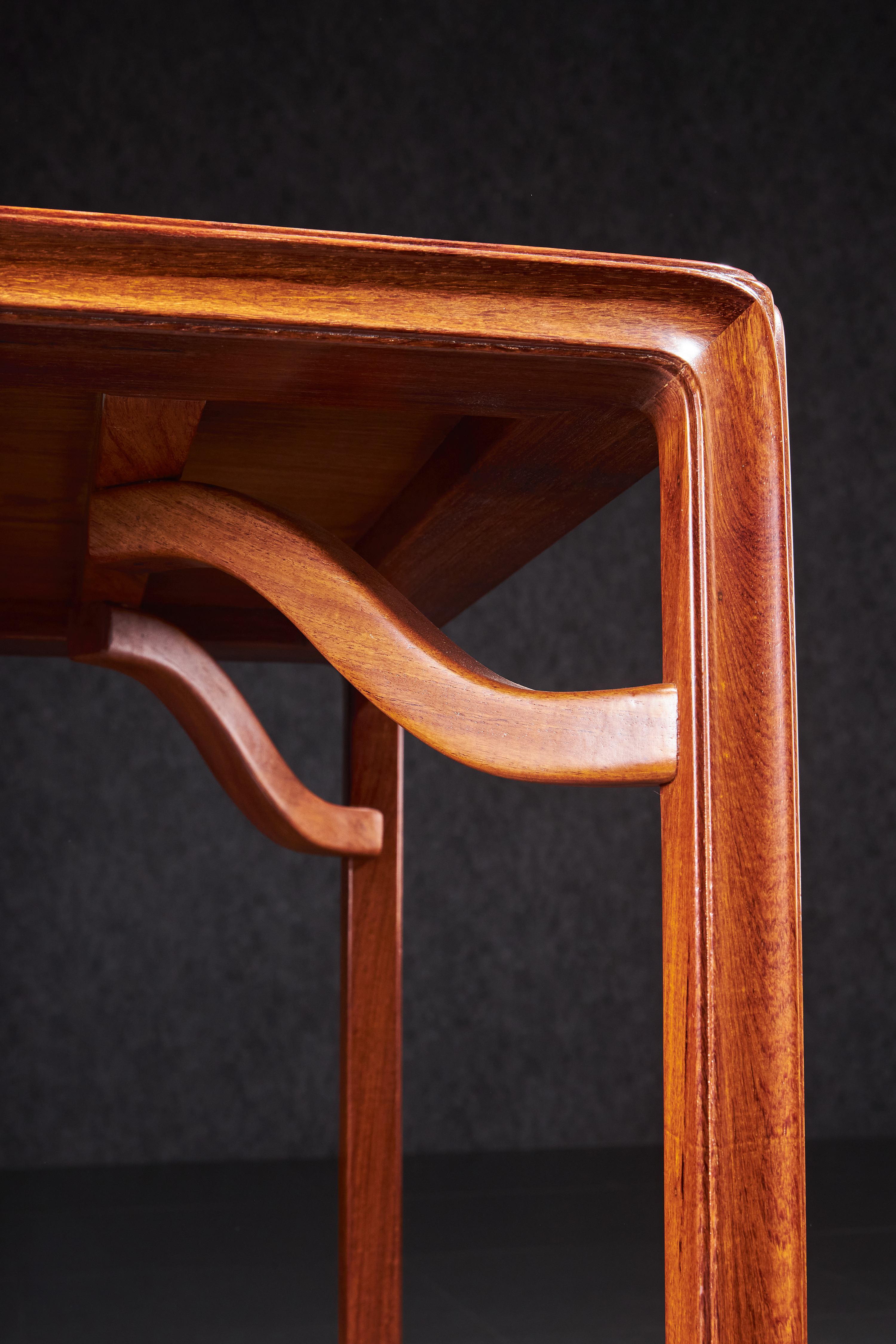 桌面攒边平镶面心,面下接菱形三弯霸王枨,使桌下空敞可收纳方凳,无束腰无牙角,边抹立面、腿足与托泥均打洼、交圈、踩委角线,线脚汇集处修出弧面,既巧妙消去锐利之感,又合理保护尖角处不易磕损。