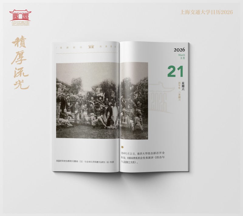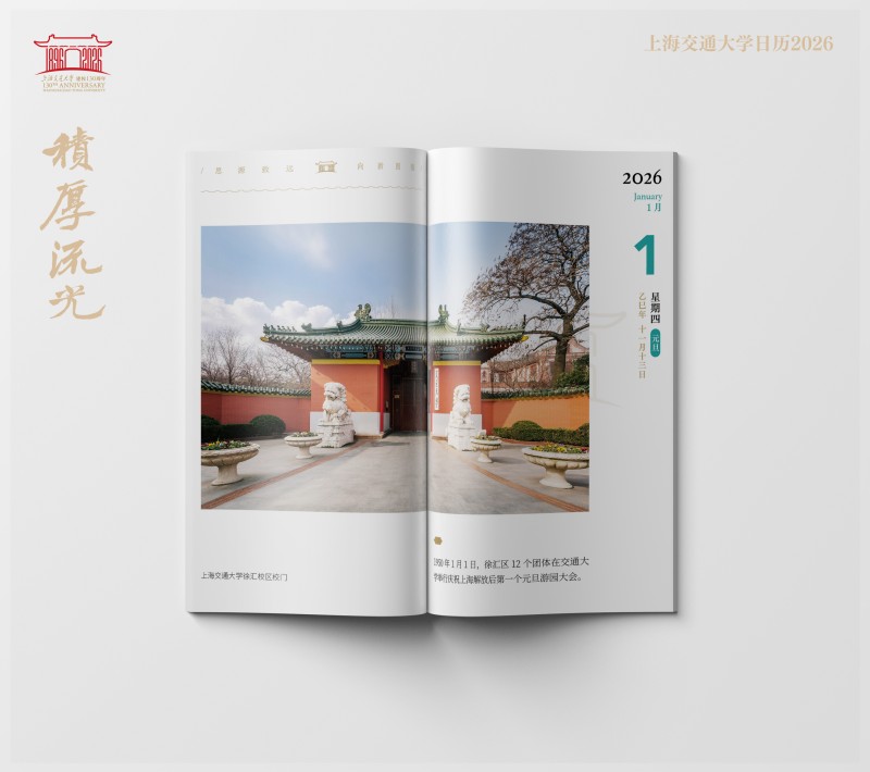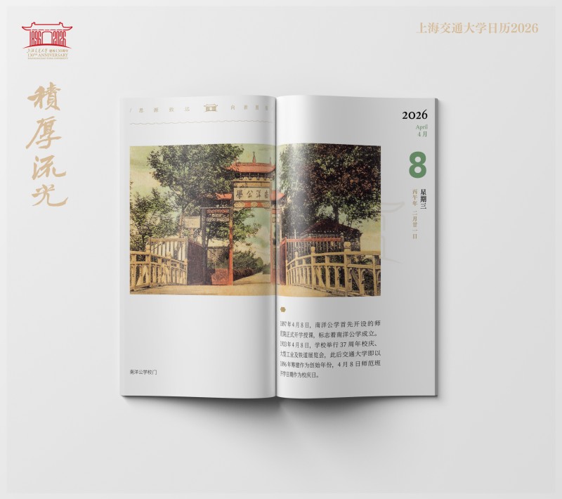 《积厚流光:上海交通大学日历2026》选取学校历史上发生的重要事件或相关的人物、建筑等,一日一记,图文并茂。日历内容选自学校档案文博管理中心所藏资料以及《上海交通大学史》《上海交通大学纪事》《上海交通大学年鉴》《三个世纪的跨越:从南洋公学到上海交通大学》《南洋筑韵》等校史图书,以365个历史剪影展现学校发展历程中的精彩瞬间,勾画出学校自1896年建校至2025年底共130年波澜壮阔的长卷。