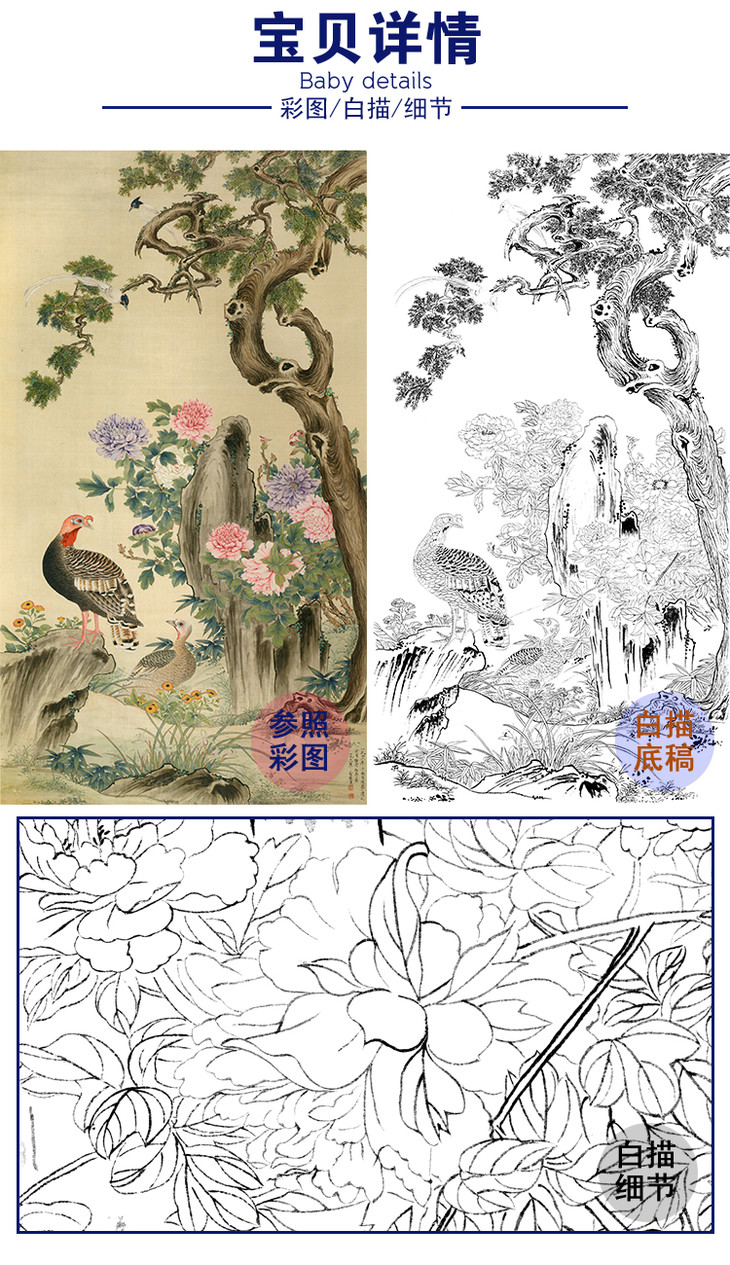 竖幅工笔花鸟白描底稿-俞致贞《牡丹柏寿图》-多种白描尺寸可选-JV09