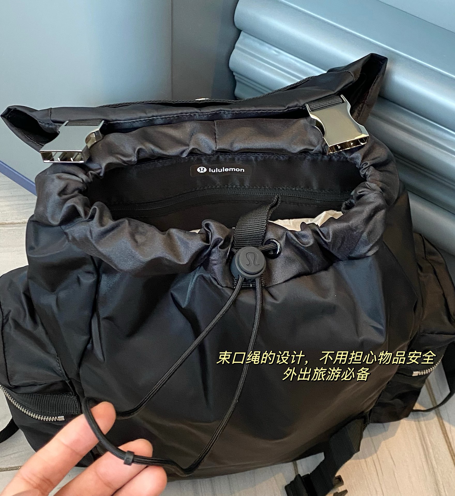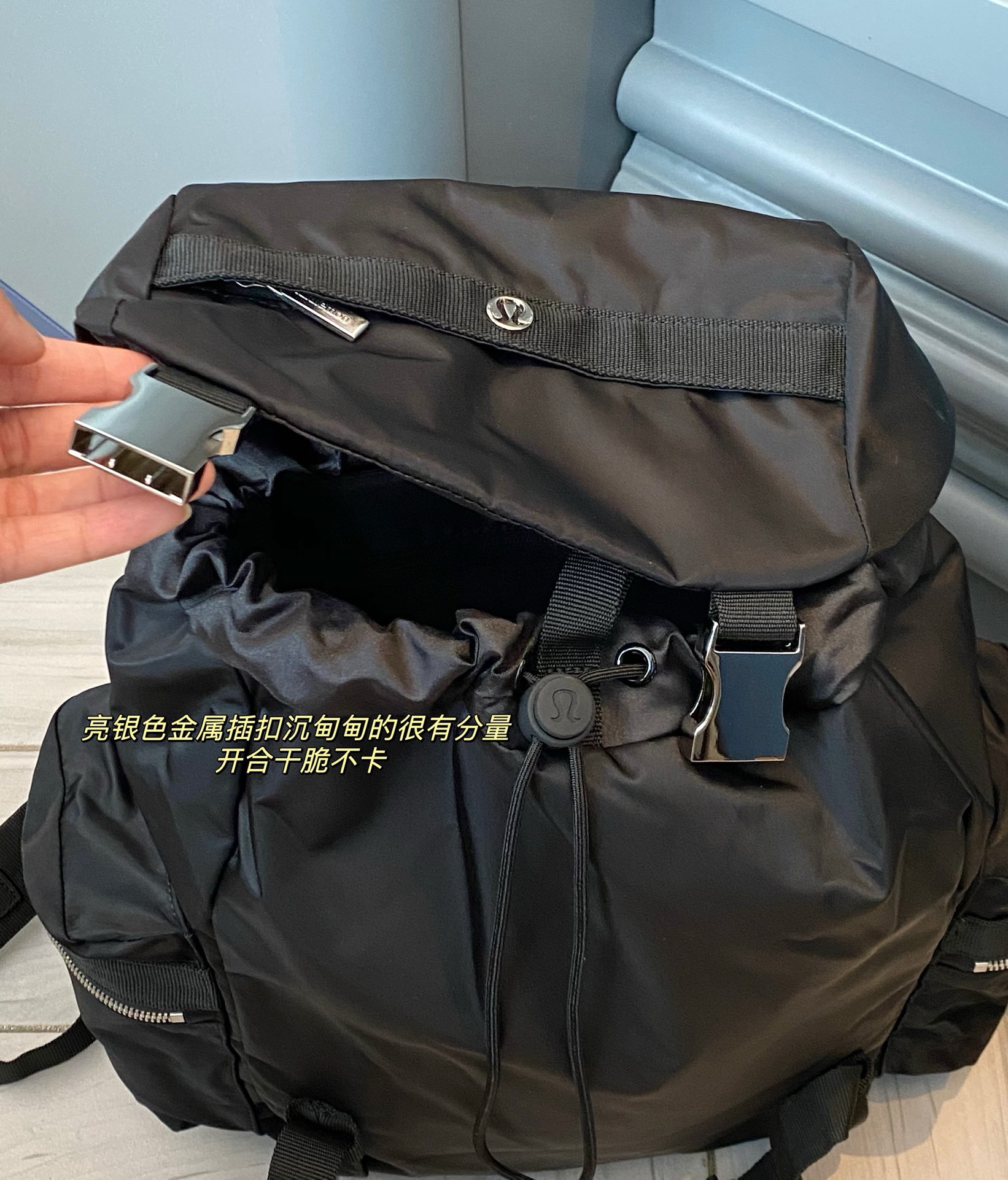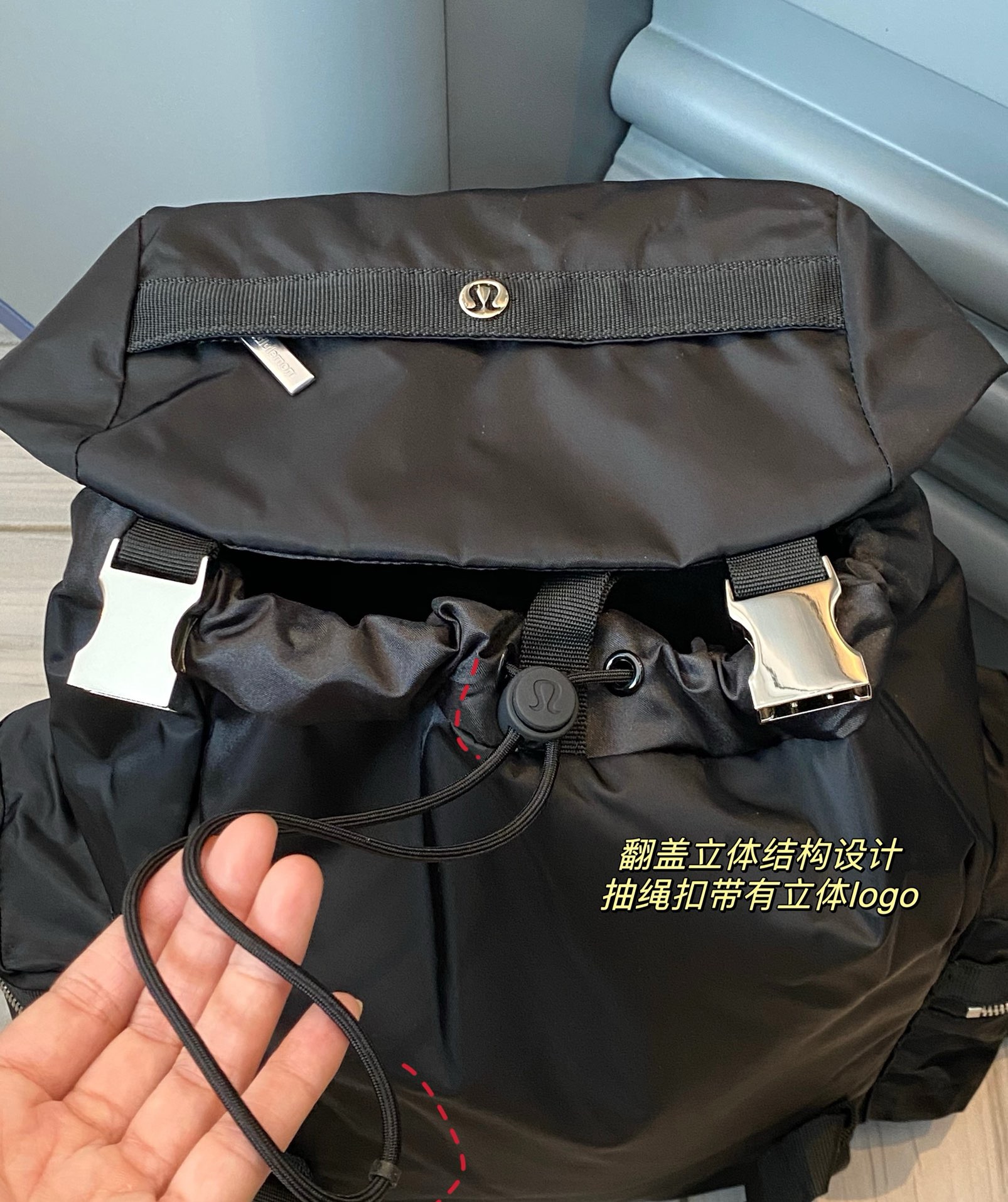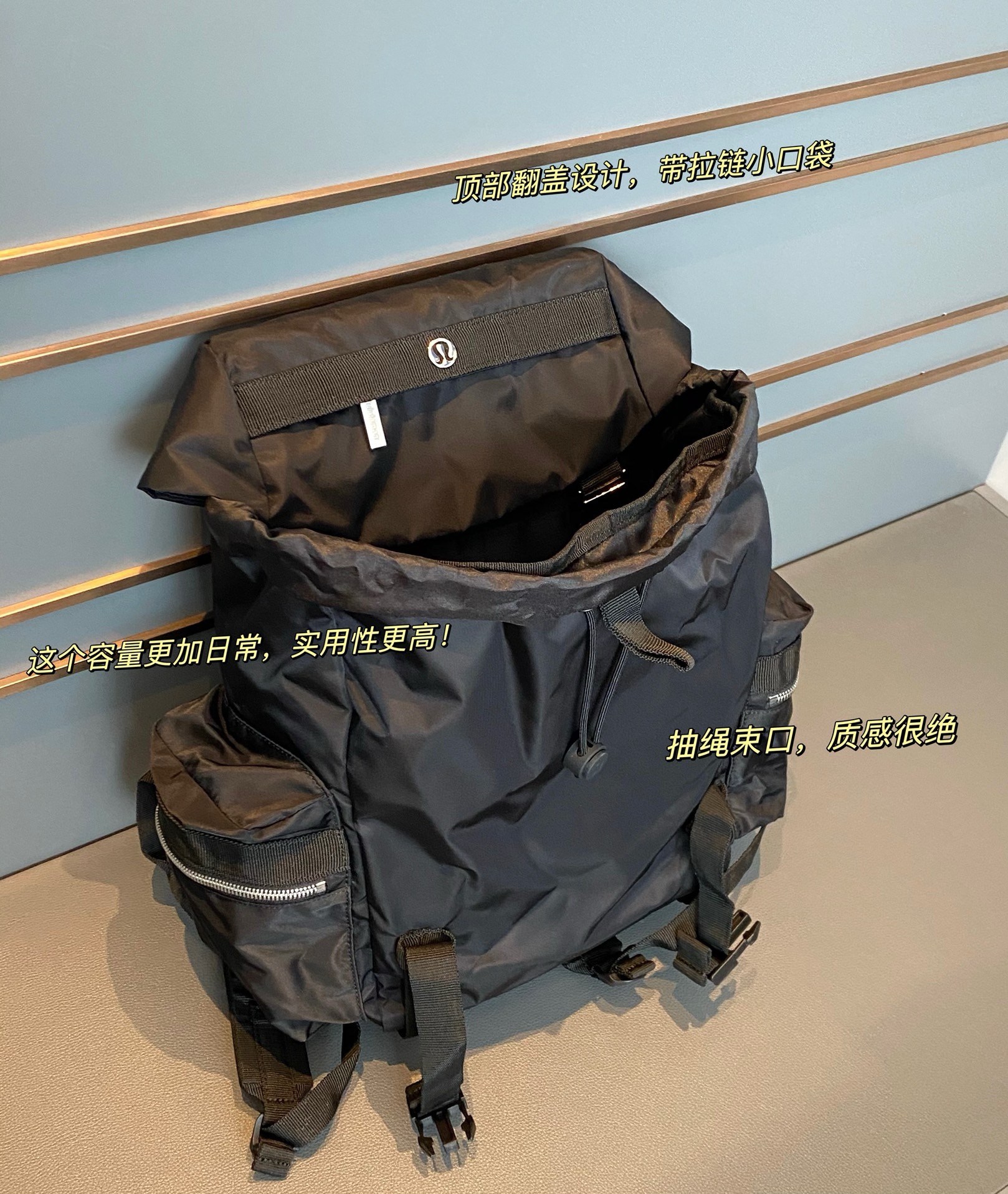 整体的设计就很lulu风,不管是配色还是包型整体看上去非常简约!但是细节功能一点不简单哈!