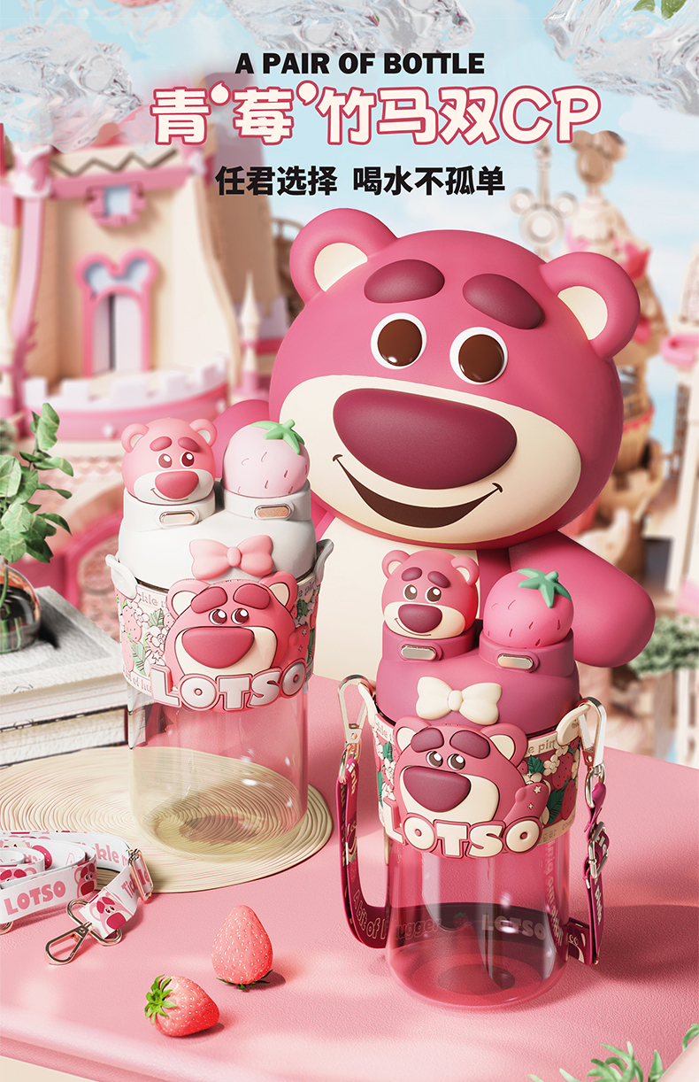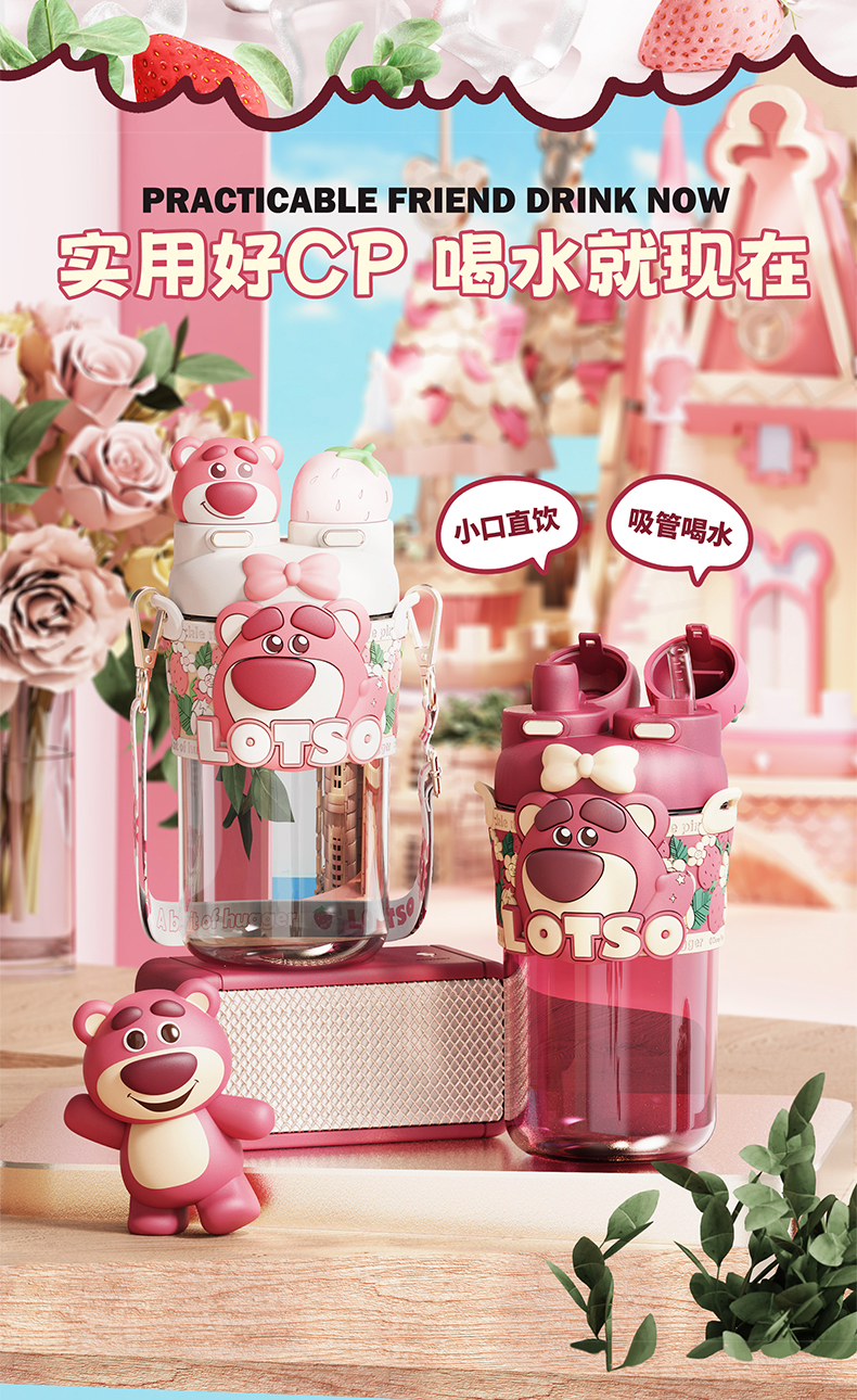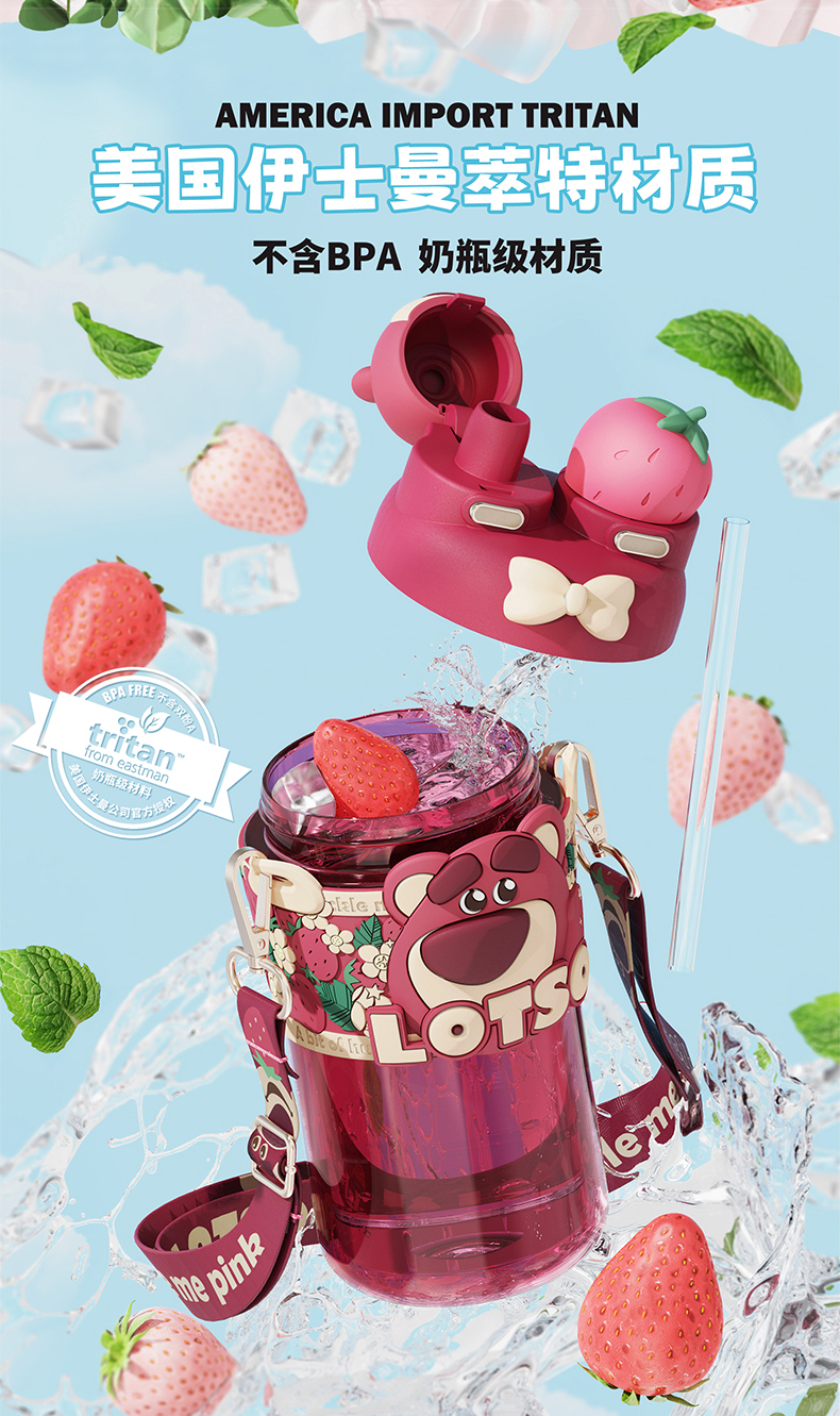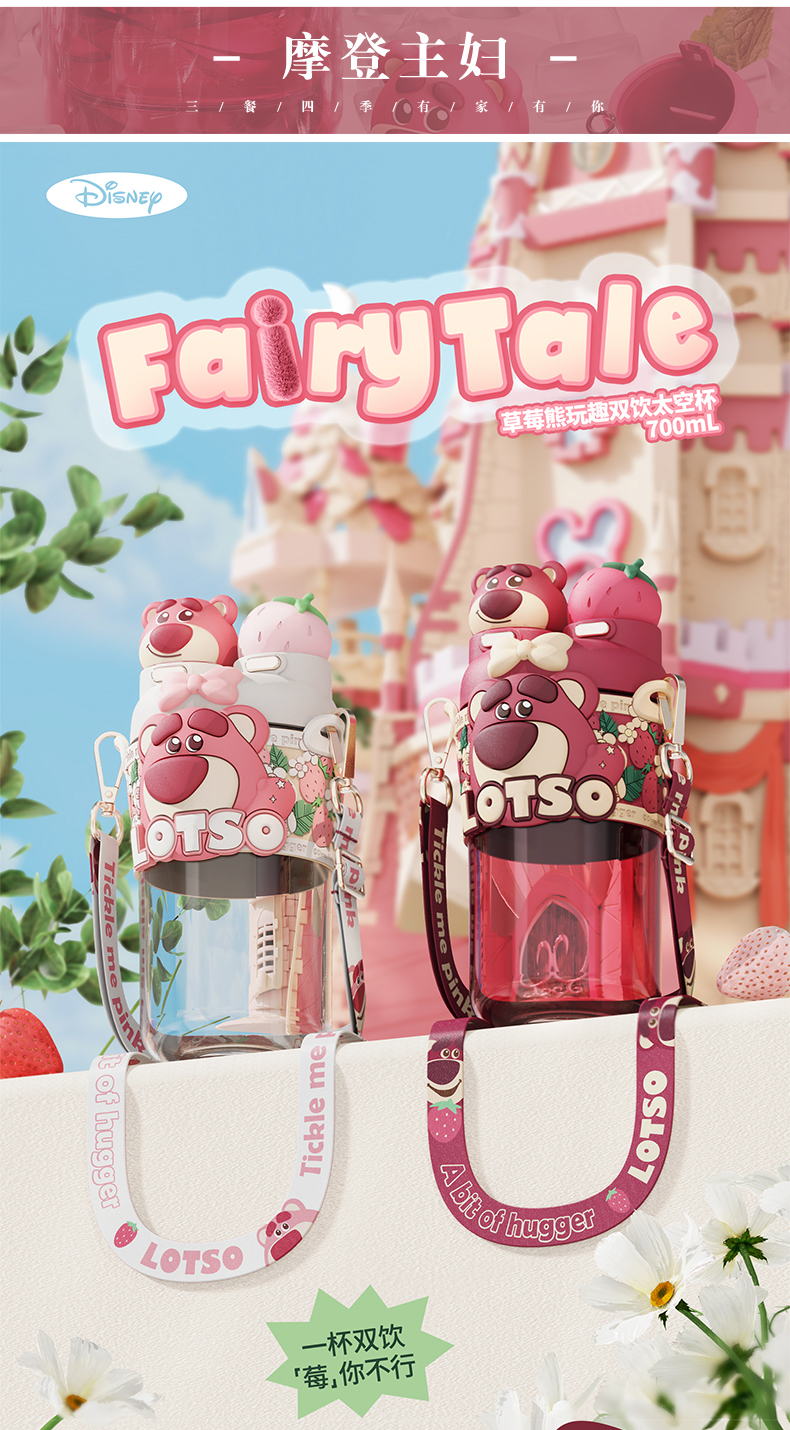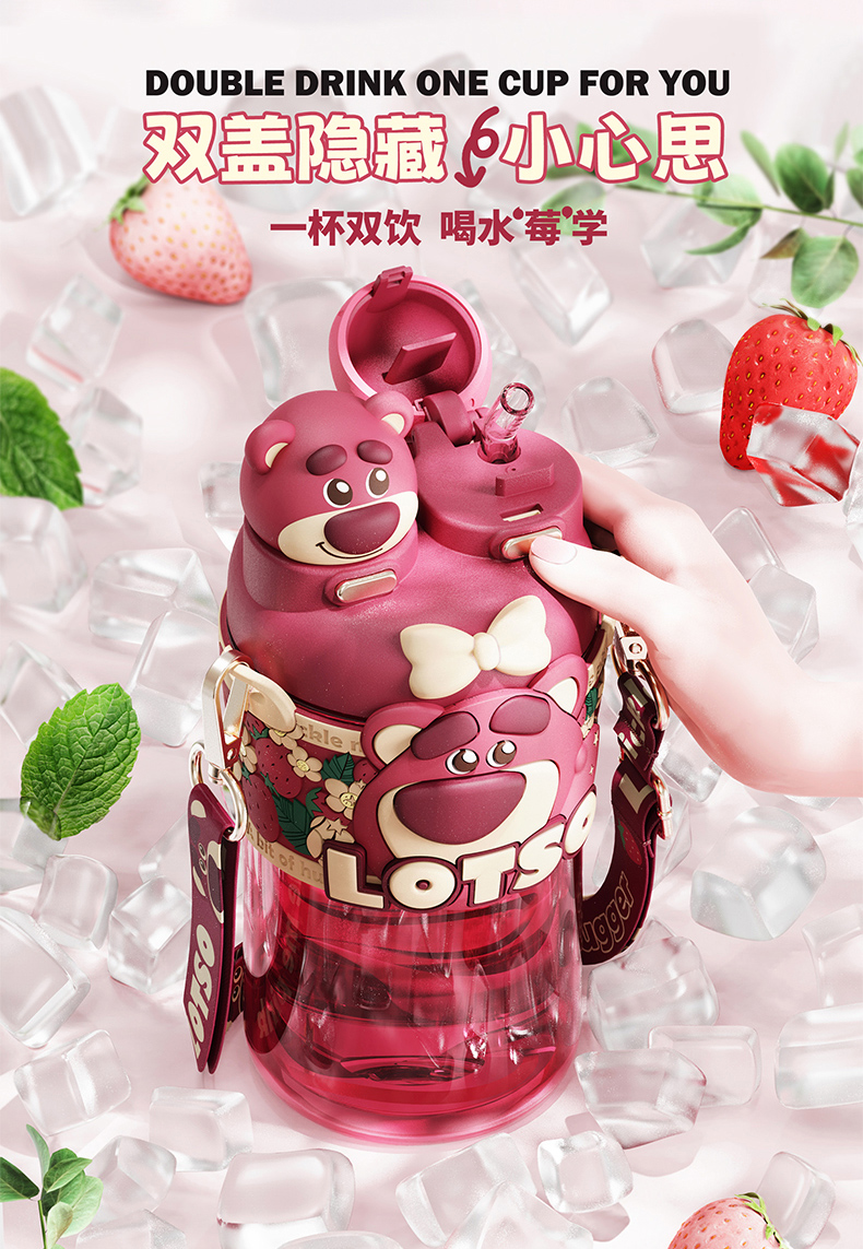 摩登主妇迪士尼草莓熊双饮杯儿童水杯上学专用水壶便携式吸管杯子