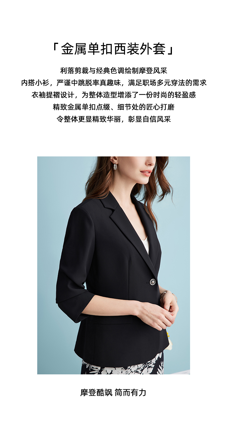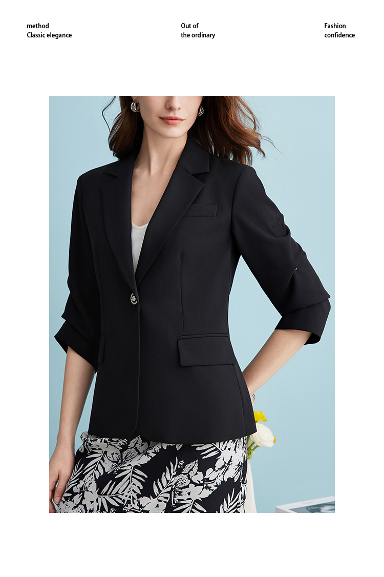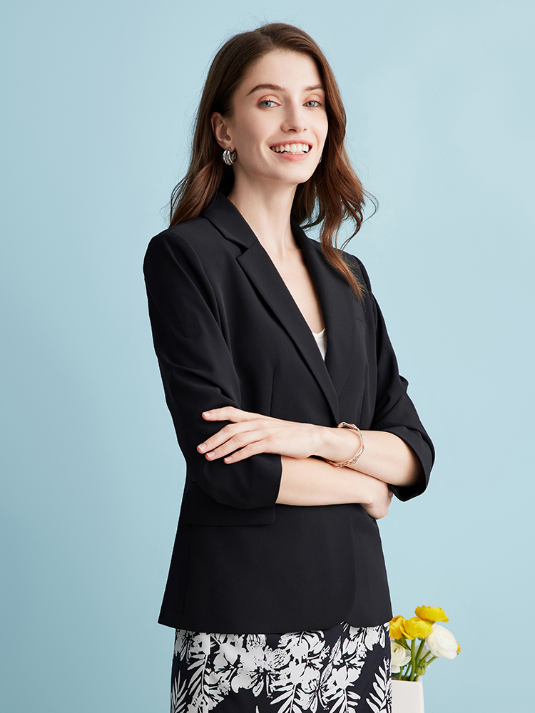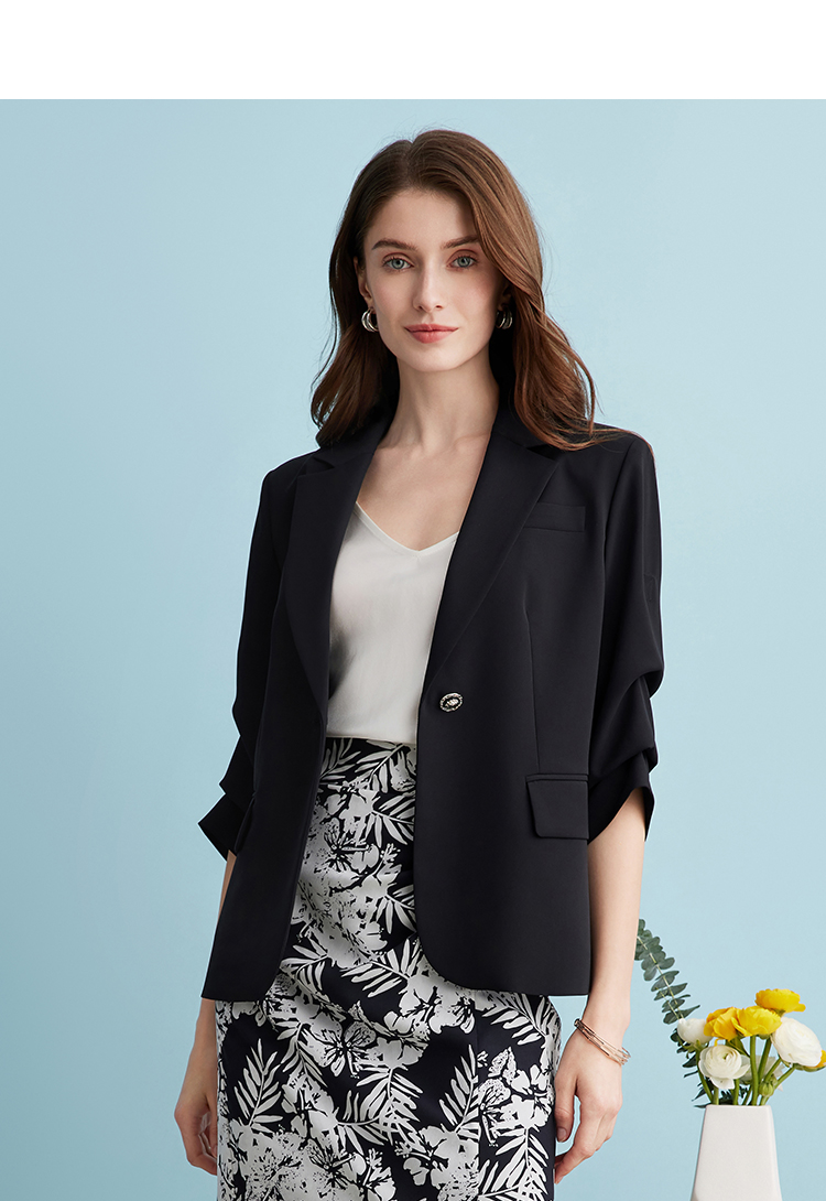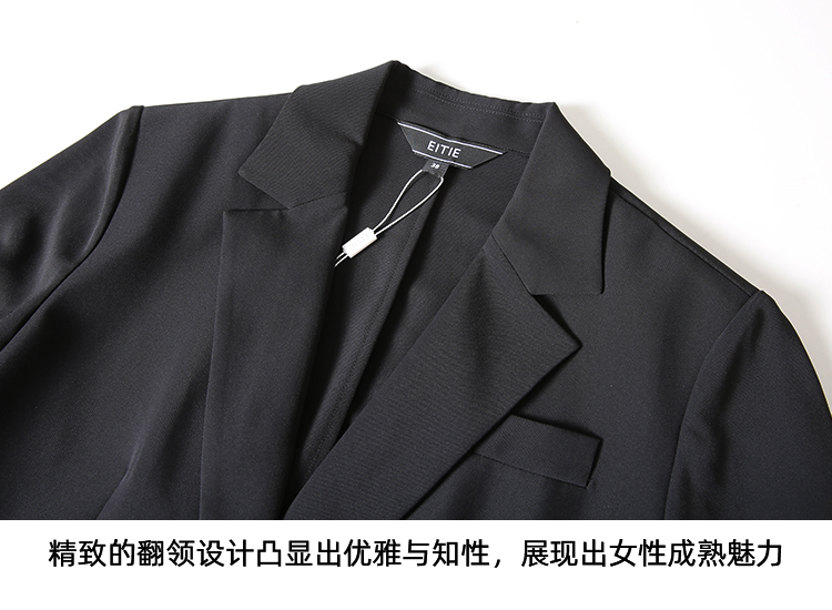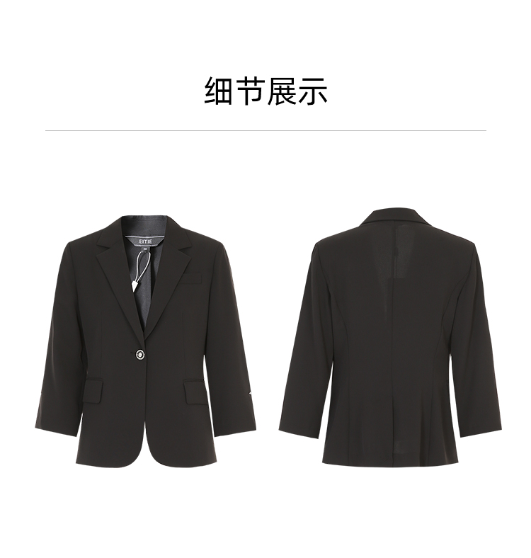 EITIE爱特爱气质干练通勤抽褶七分袖黑色修身西装外套夏新款B2403302