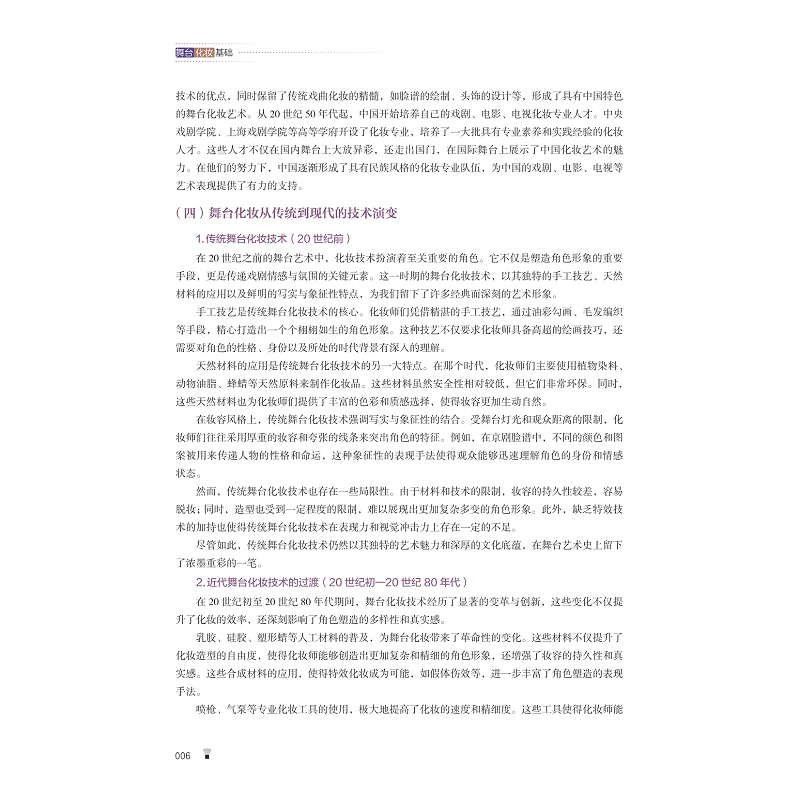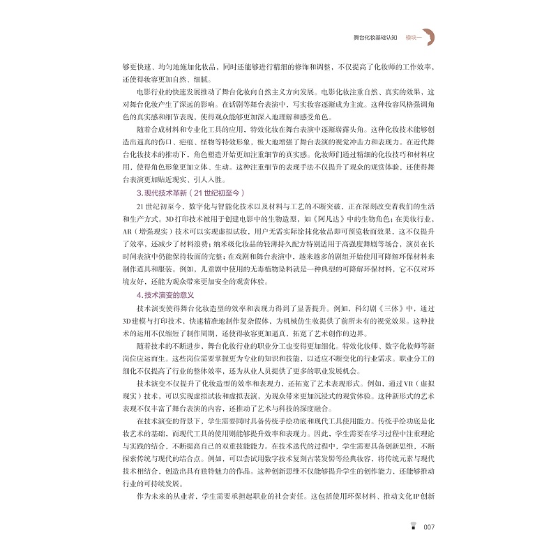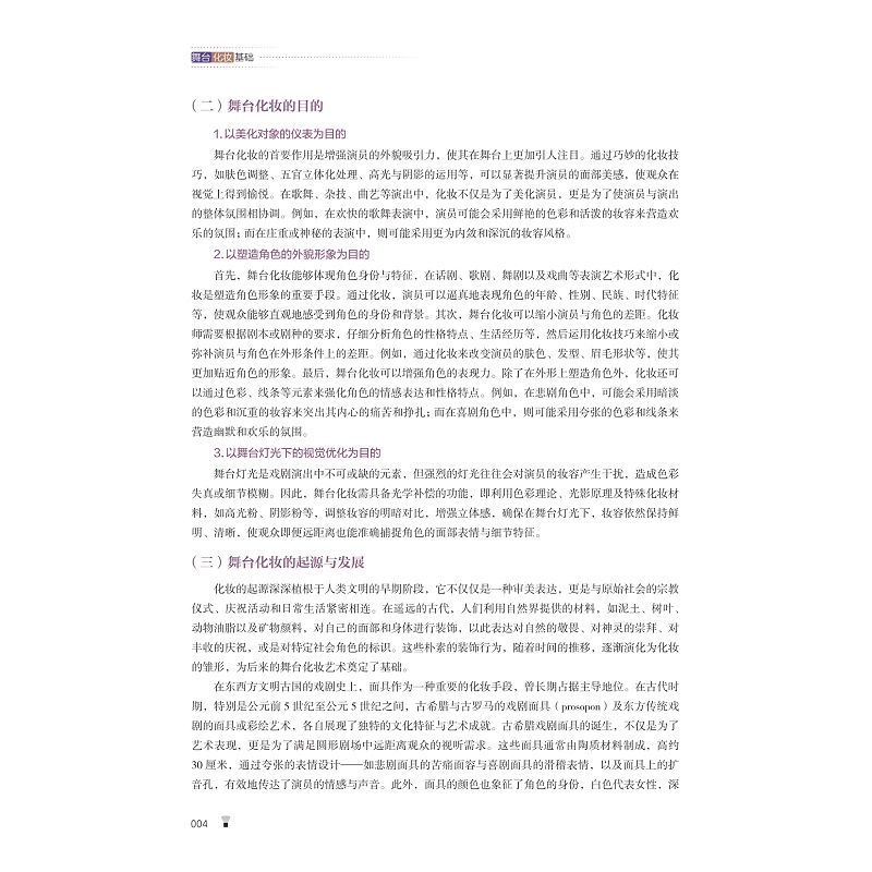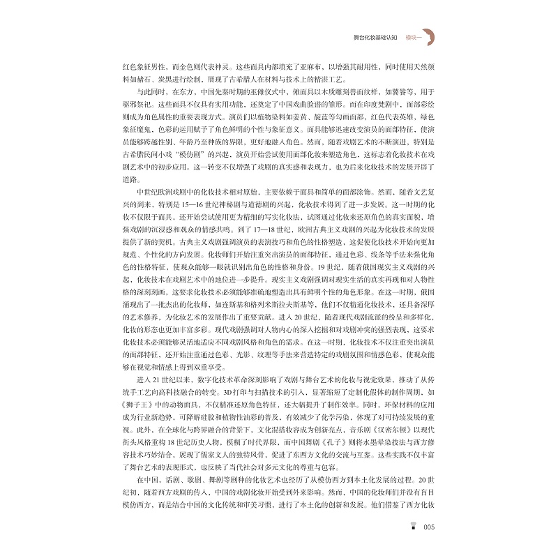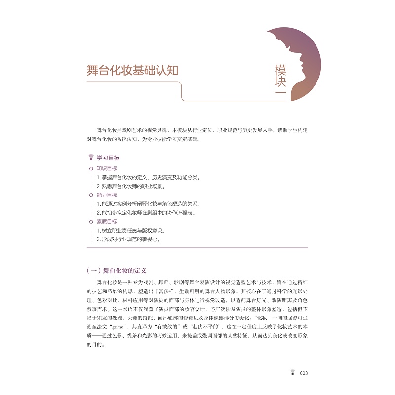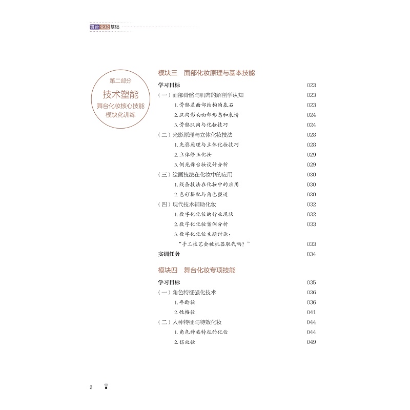本教材从舞台人物形象设计专业的特点出发,重视和加强技法基础教育的同时改进和加强训练方法,针对舞台不同演出类型的特点,紧密围绕人物形象设计优秀经典案例进行导入和分析,使表现技法知识与专业知识紧密联系。教材分为舞台化妆基础理论、话剧化妆表现技法、歌剧化妆表现技法、舞剧化妆表现技法、音乐剧化妆表现技法、儿童剧化妆表现技法、T台化妆表现技法、综艺活动化妆表现技法八个单元。每个单元通过不同剧种的化妆特点、化妆方法、化妆步骤与技巧、实训案例、课后讨论与作业等环节,环环紧扣,突出课程教学的直观性和可操作性。本教材注重体现时代精神,挖掘深蕴的人文内涵,加强读者应用能力和技能训练,力求教学内容和教材结构的创新。