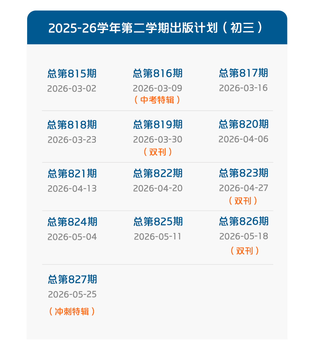 本学期出版计划共包含5期合刊。其中3期为双刊,定价6.4元,出版日期分别:3月30日、4月27日、5月18日;1期为中考特辑,定价19.2元,出版日期为2026年3月9日;1期为中考冲刺特辑,定价16元,出版日期为2026年5月25日。