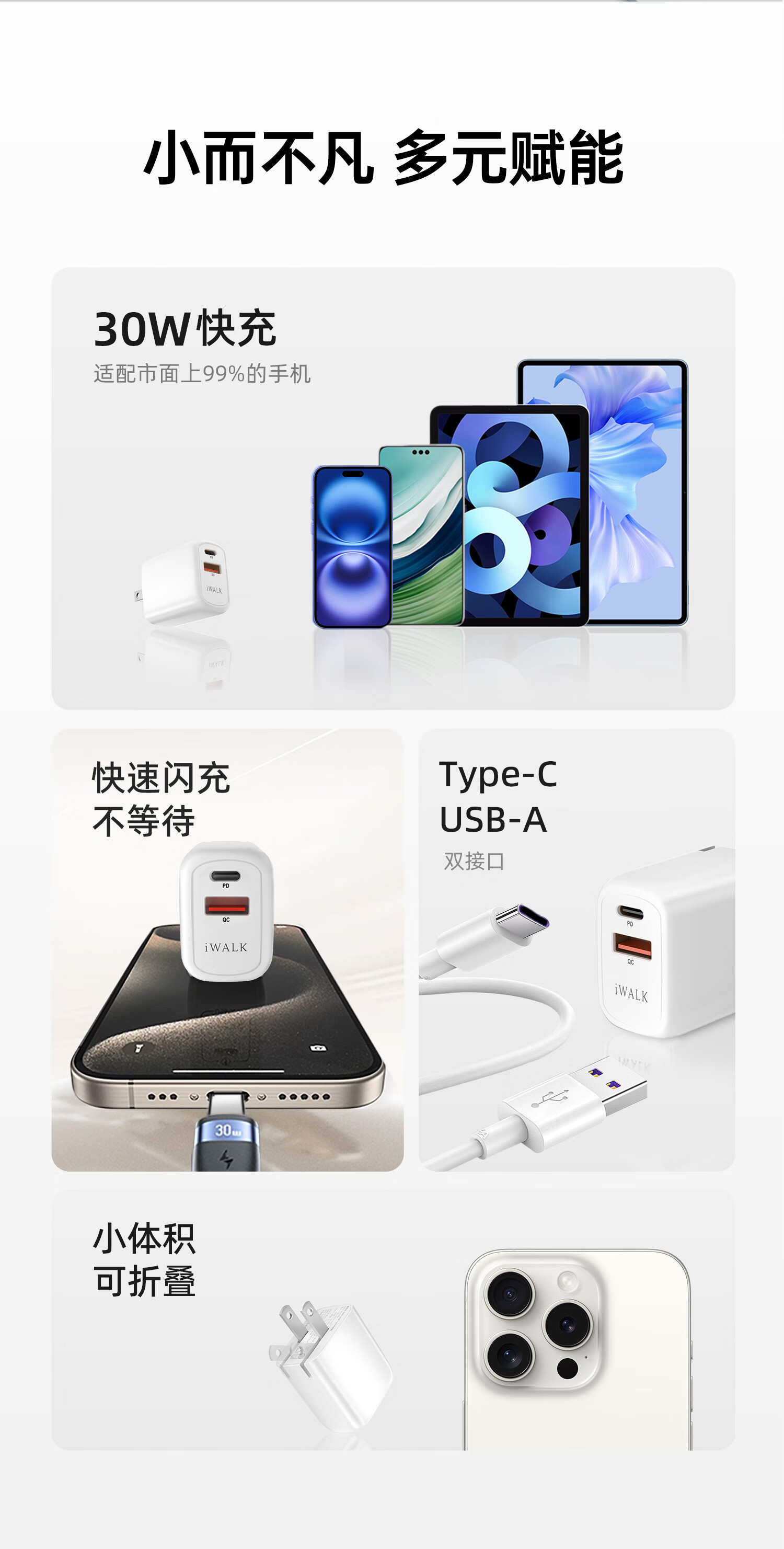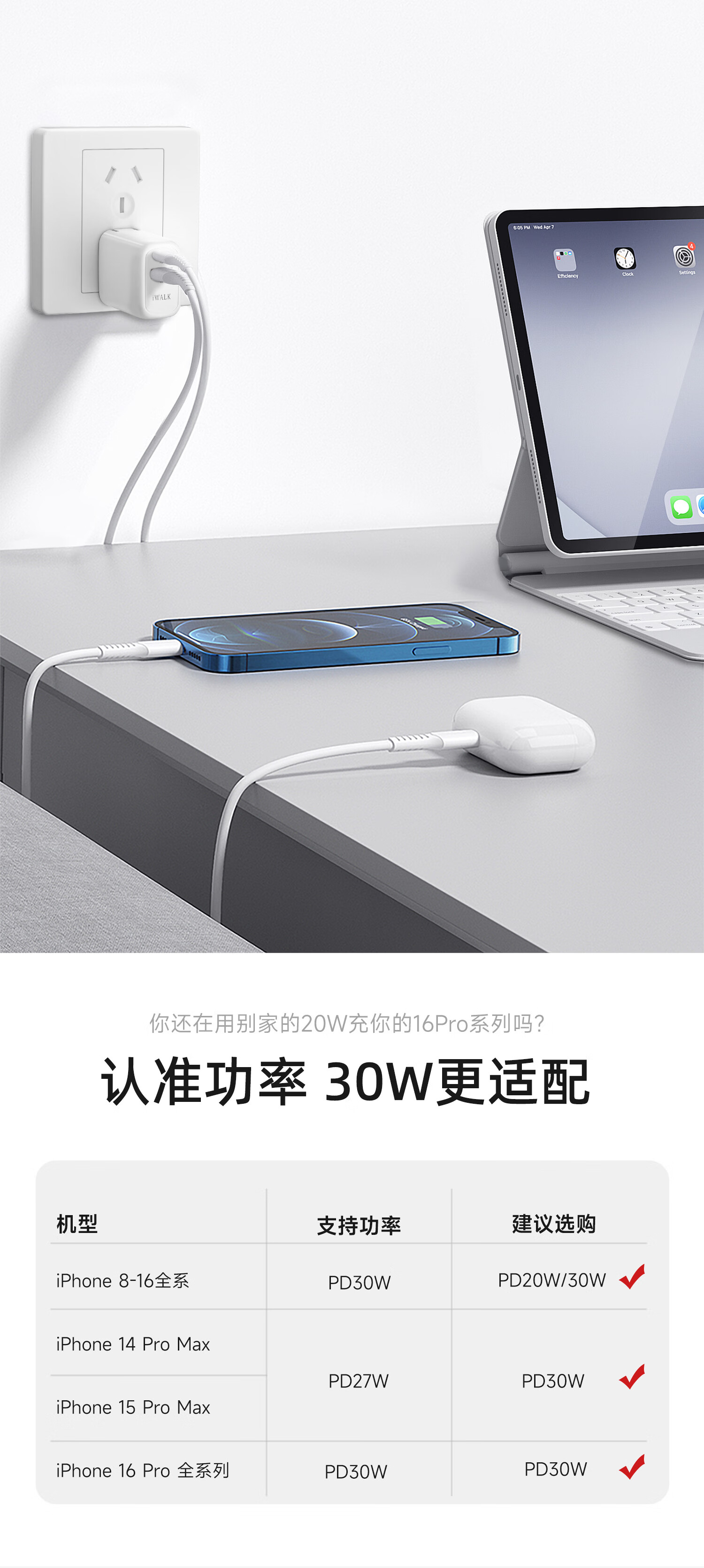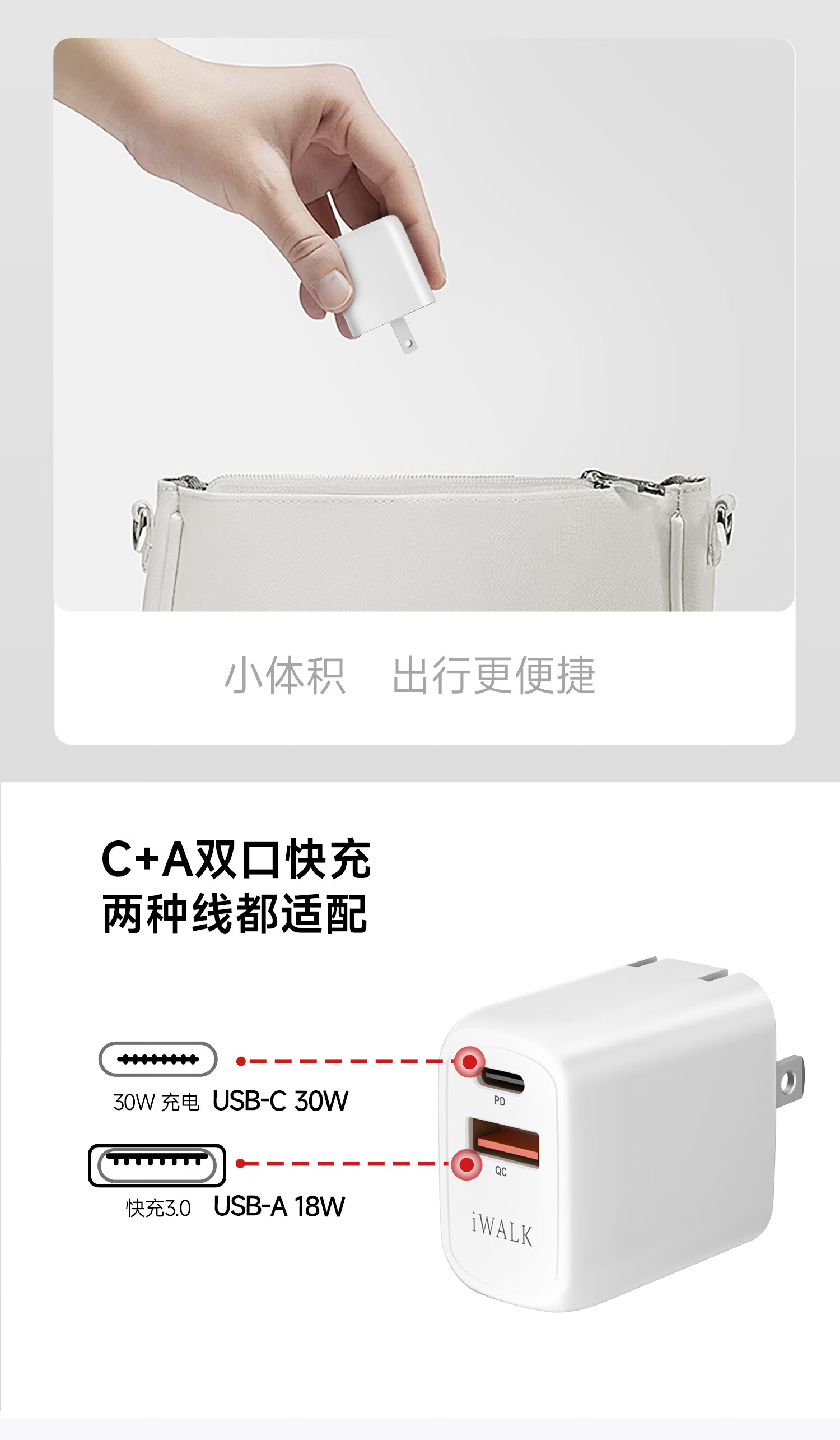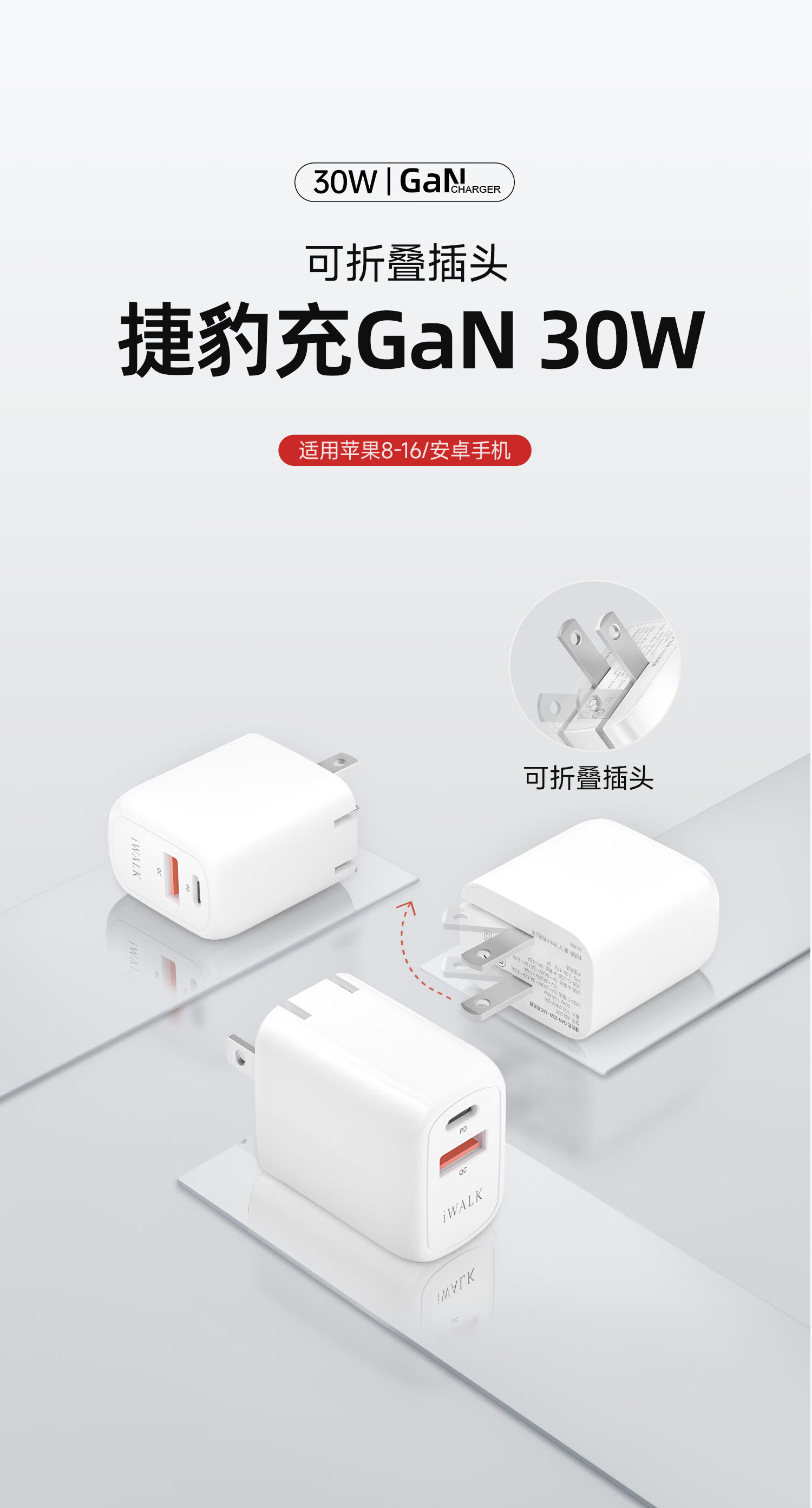 爱沃可(iWALK)苹果16/15充电器ADL027 30W氮化镓iPhone16ProMax快充头兼容PD20W适用华为小米苹果ipad平板手机快充头 经典白