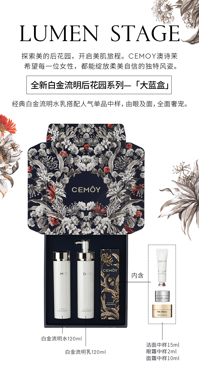【品名】澳洲CEMOY澳诗茉 白金(经典)水乳礼盒 后花园系列大蓝盒含旅行装 【规格】120ml*2瓶 旅行装:15ml洁面+10ml面霜+2ml眼霜 【产地】澳洲 【保质期】3年 【发货包装】独立包装盒 【发货地】湖南 【发货快递】圆通,中通,申通,邮政,韵达等随机发 【不发货区域】新疆、西藏、港澳台 【发货时效】48-72小时,周末节假日顺延 |