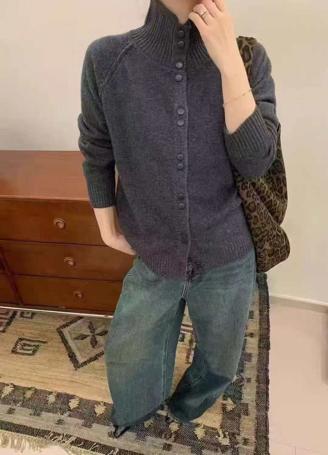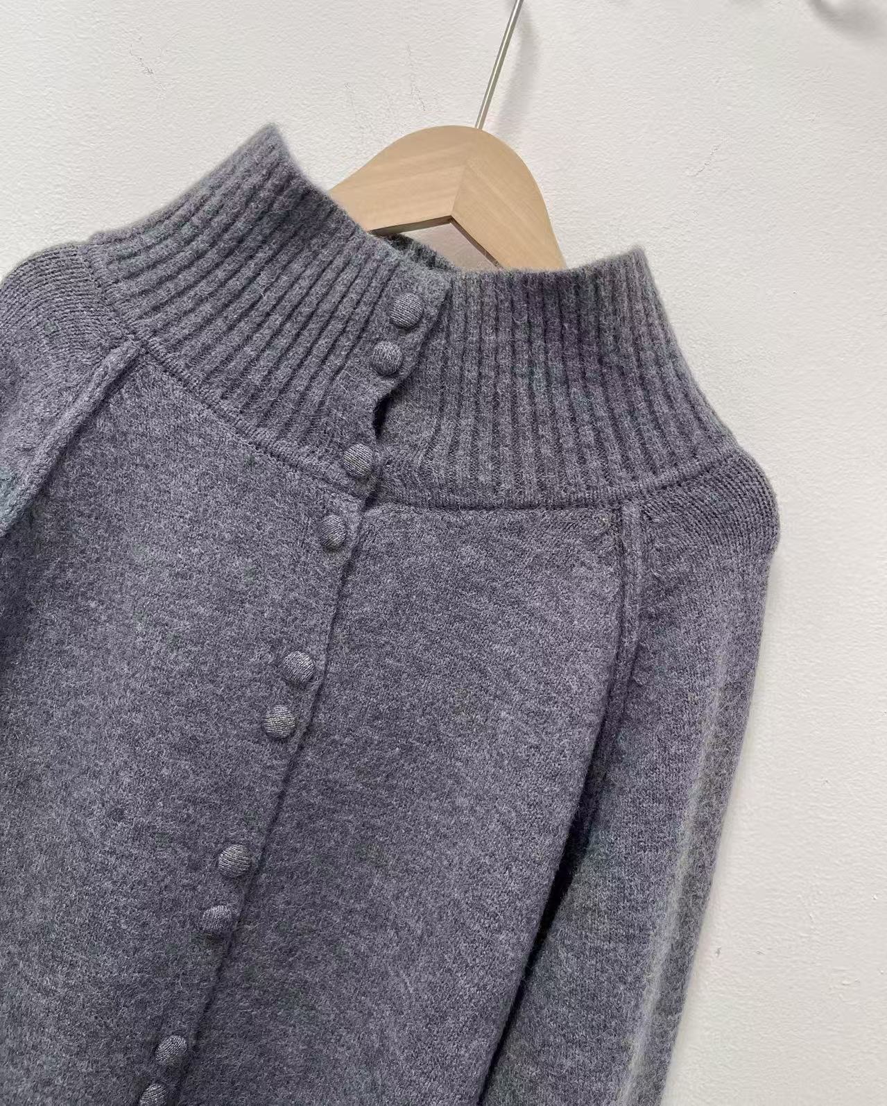 自营【超美针织衫】M08灰色高领超有气质宽松休闲开衫毛衣-喜出