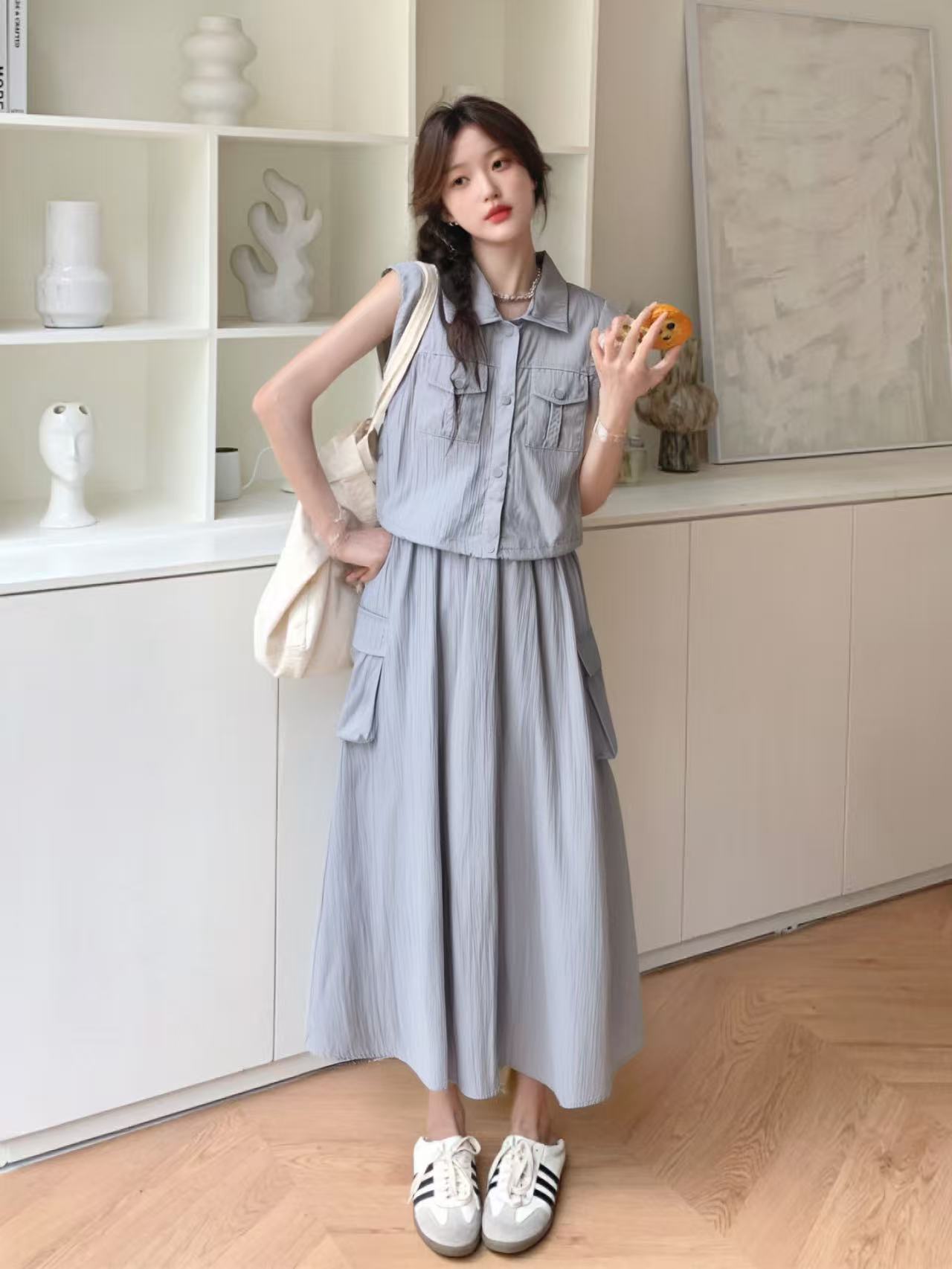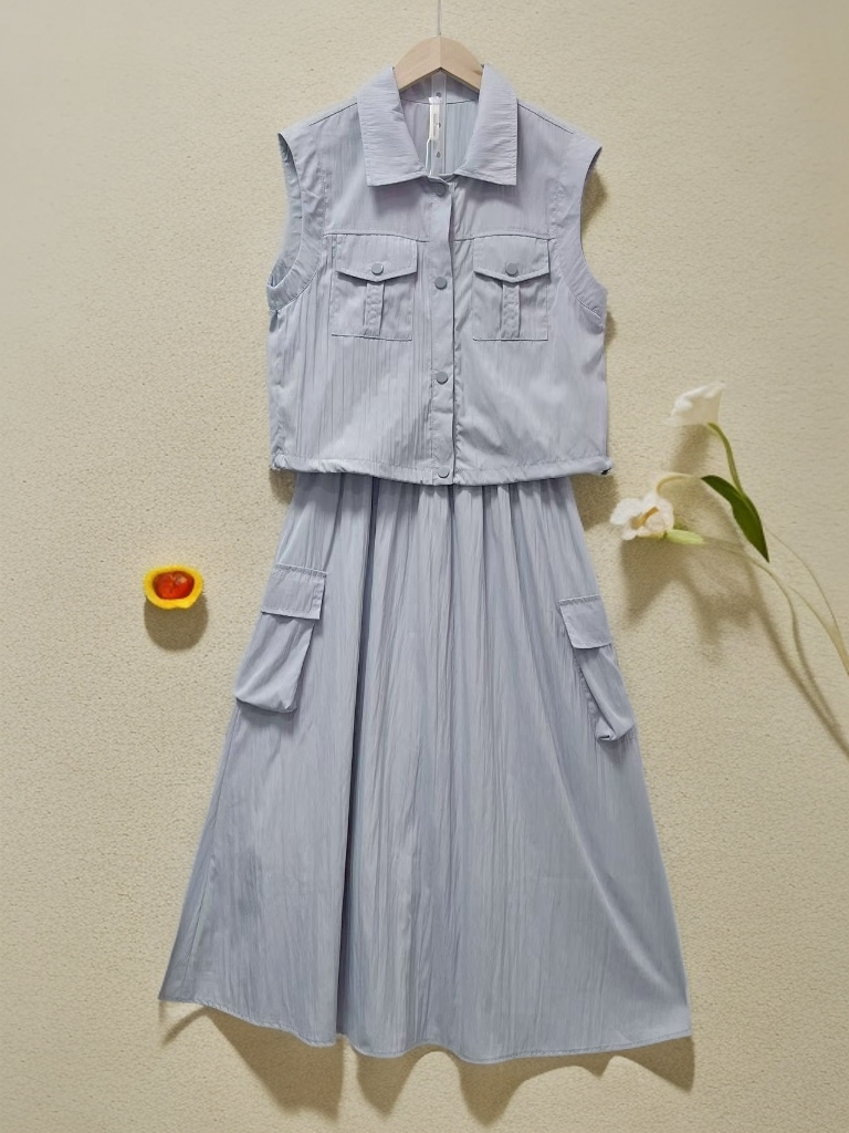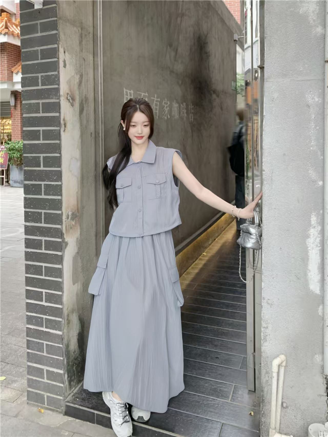 套装【韩系2025】838灰蓝超美色系工装风无袖上衣➕半身裙-喜出