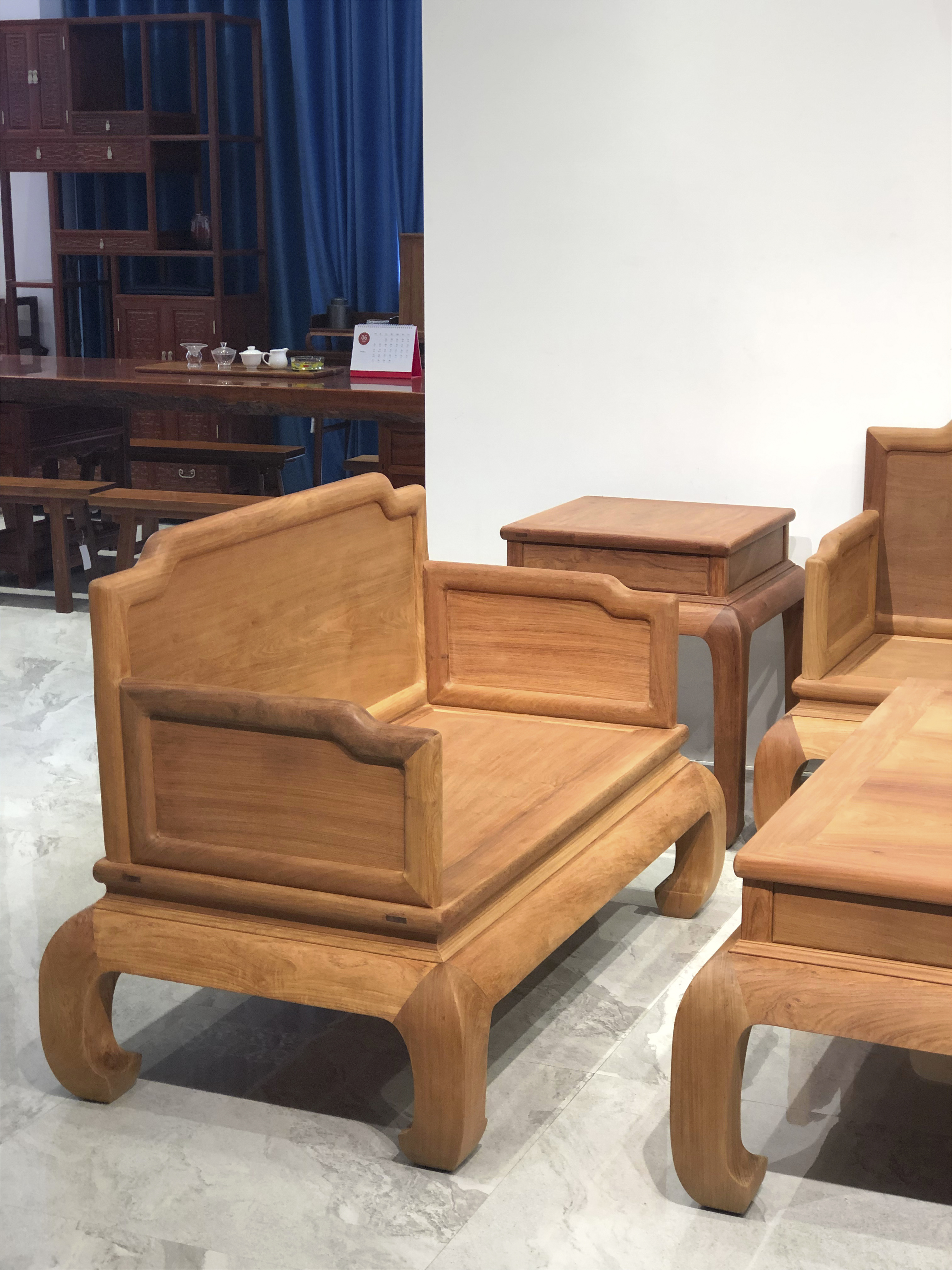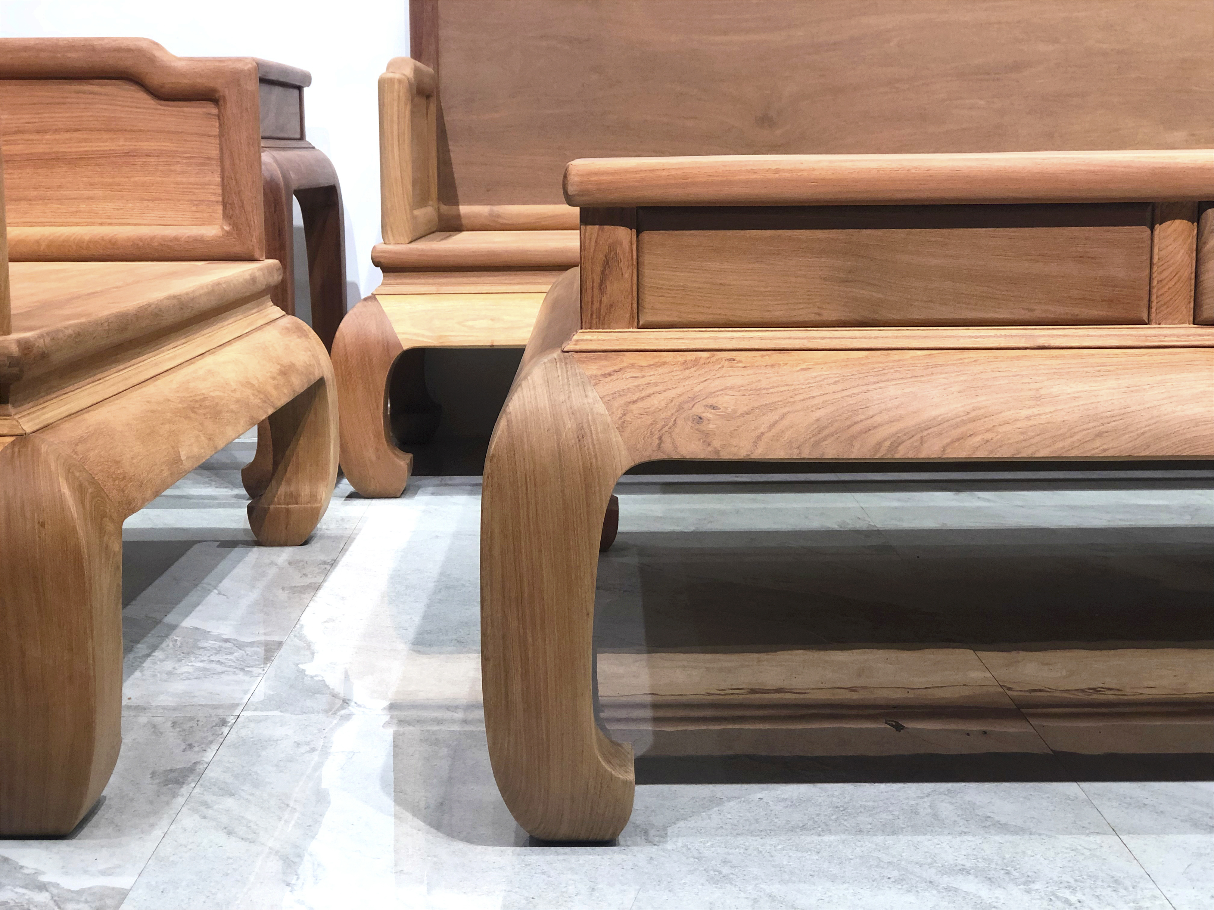 沙发是经典的明式风格,三屏风式,三面围板均为独板,背板两角,,面攒框镶板,边沿冰盘沿,有束腰,厚材腿足内翻马蹄足,牙板中间光素无纹,木纹流畅自然,榫卯做工精严,造型内敛简约,然坚实有力,无甚繁复的修饰,增添了一层淡雅的韵致。