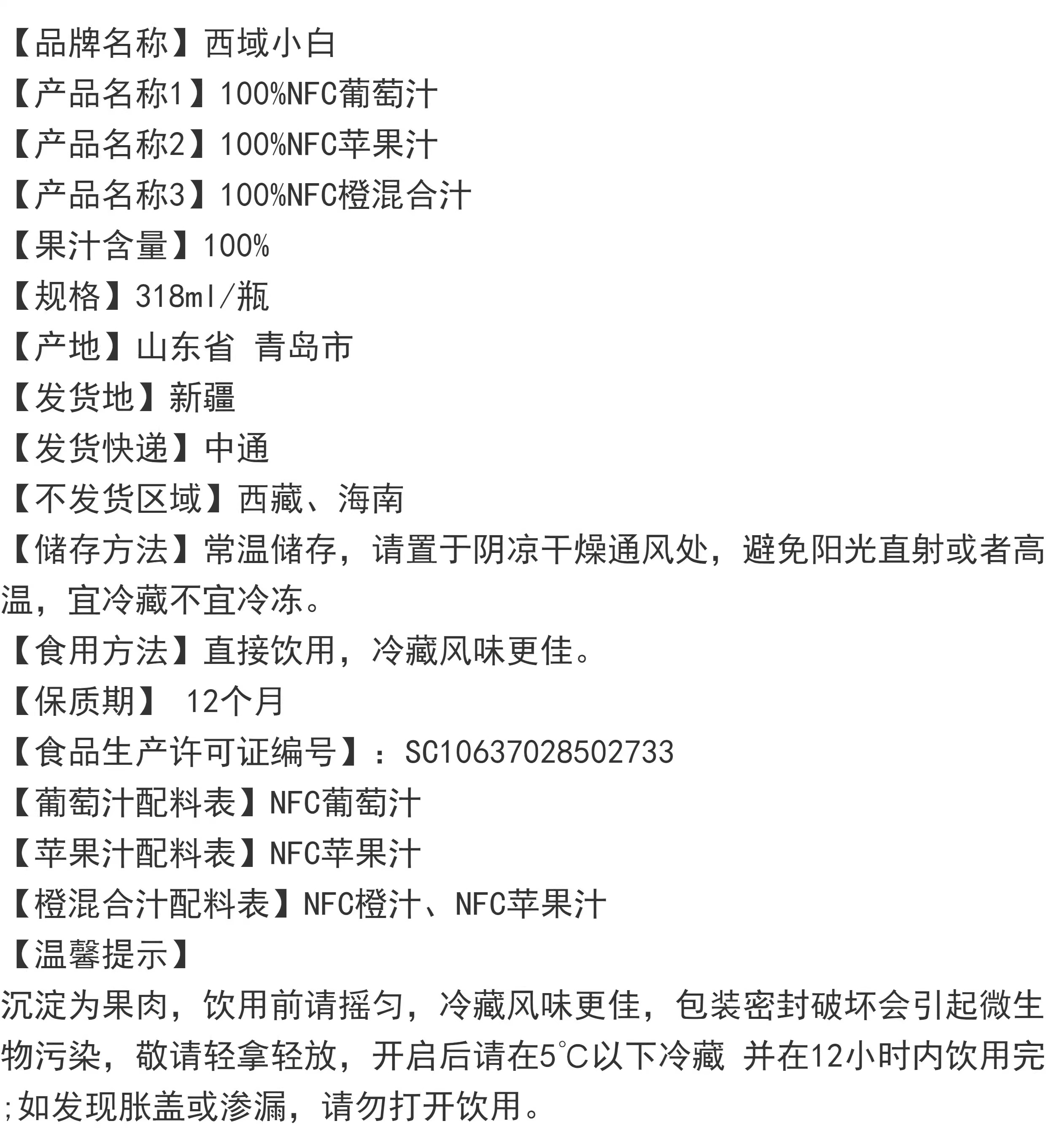 西域小白·NFC果汁系列 口味任选 保留原果浓郁果香 餐后解腻的天然饮品
