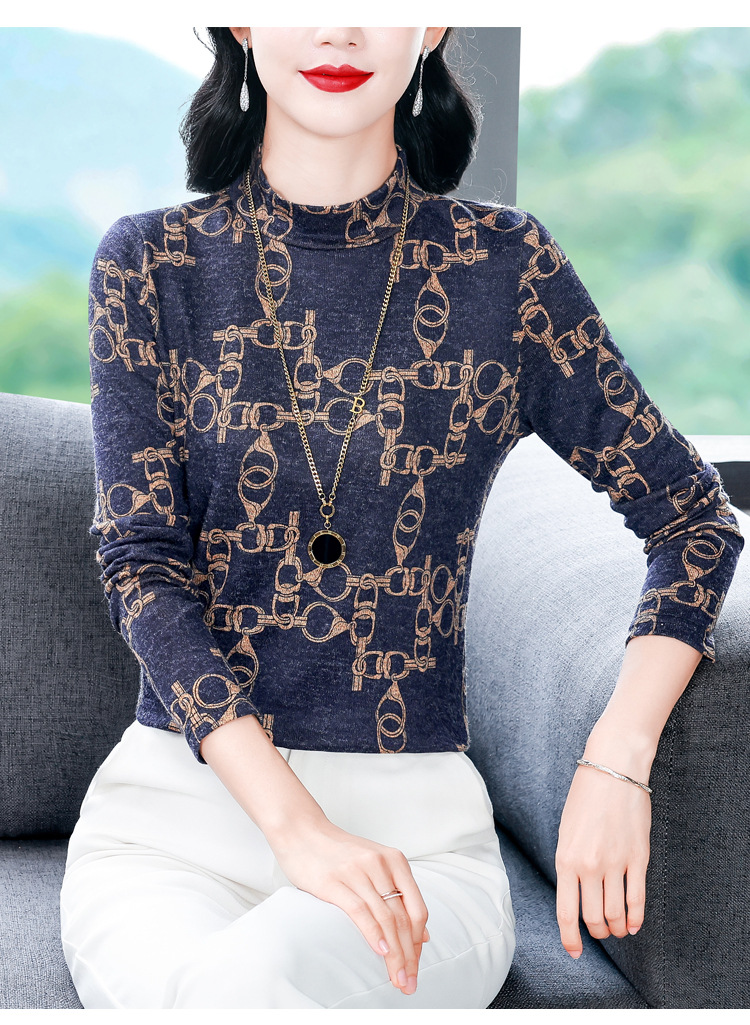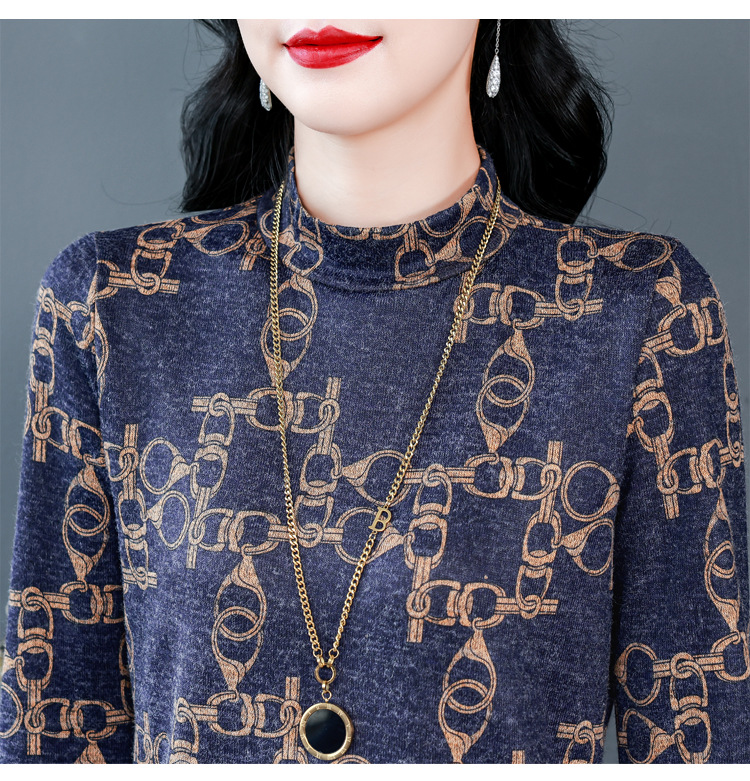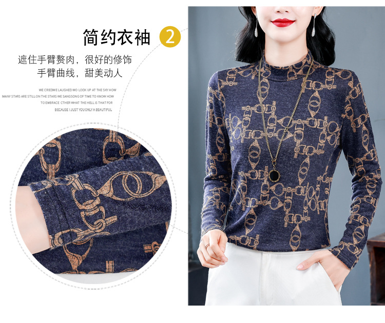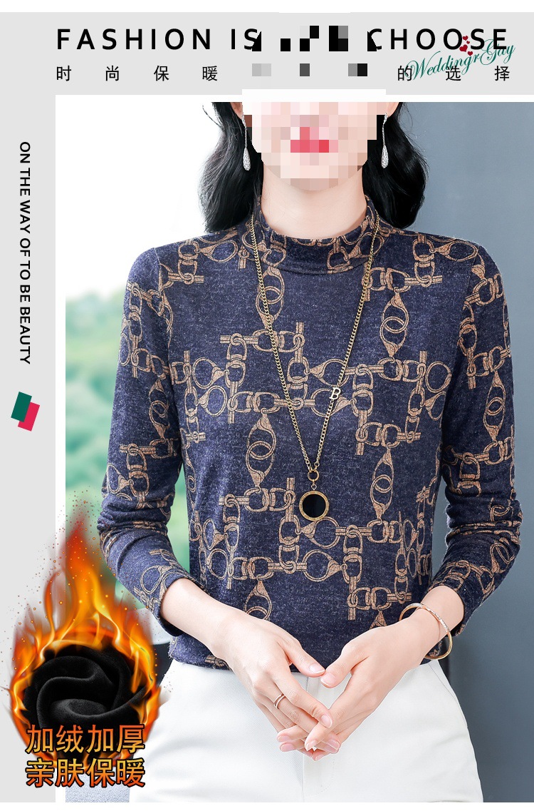 XMZ1263德绒半高领打底衫女长袖t恤春秋冬新款洋气妈妈印花加绒加厚上衣