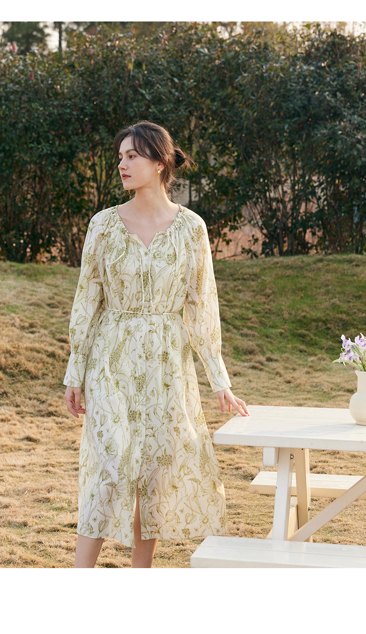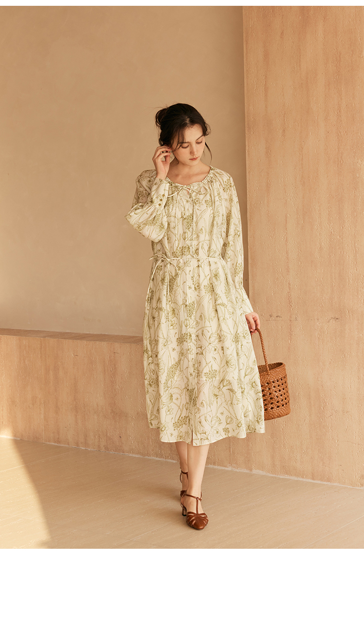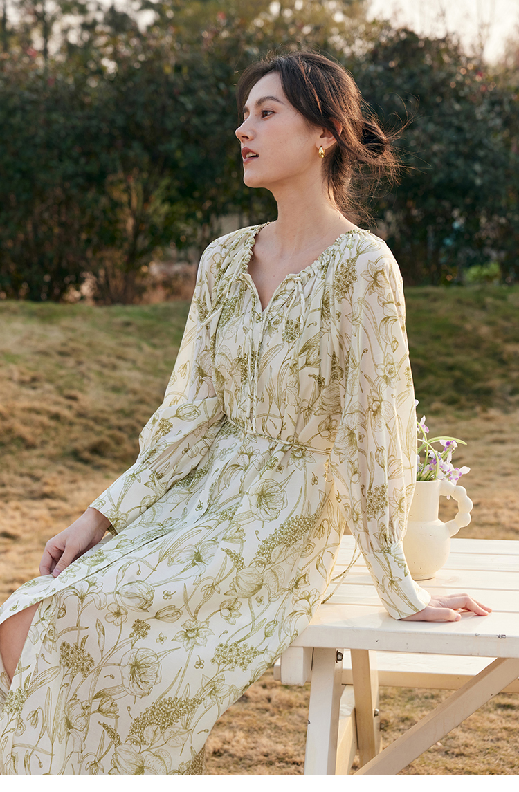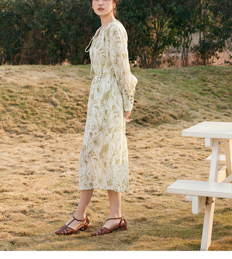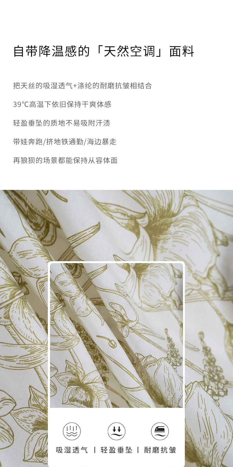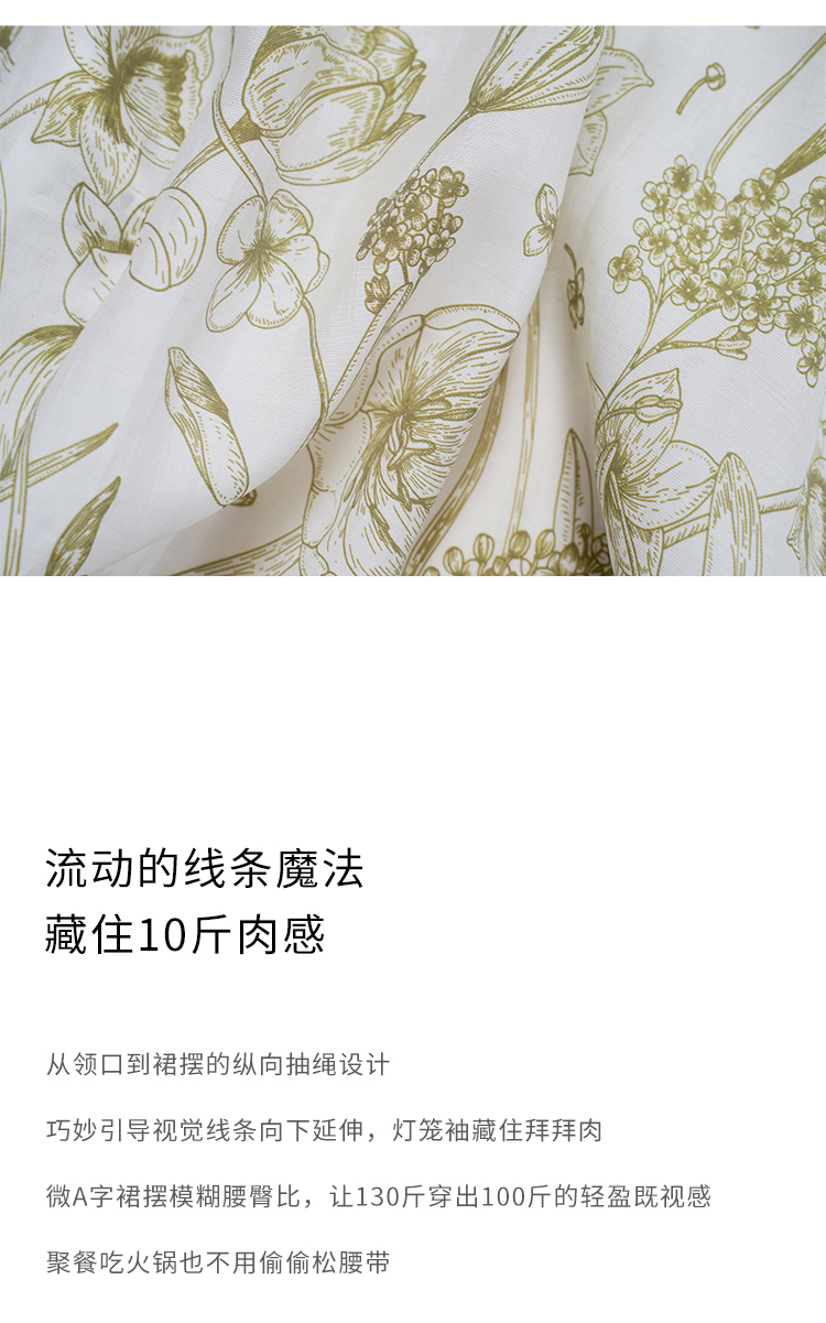HeyDress法式天丝植物印花连衣裙女春季宽松抽腰收腰气质度假裙子