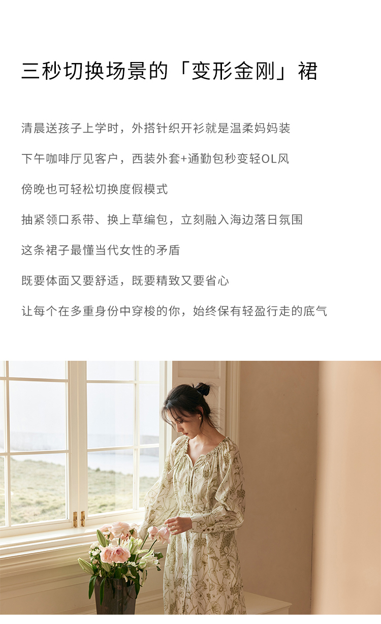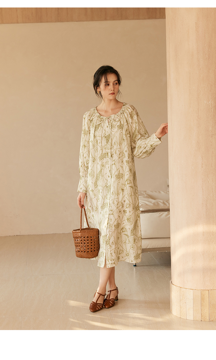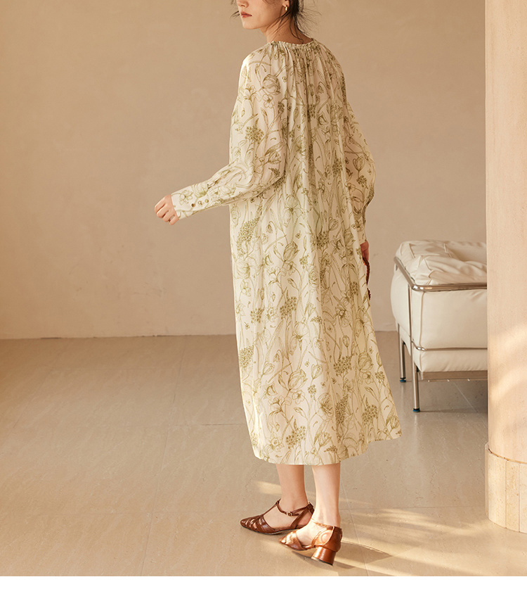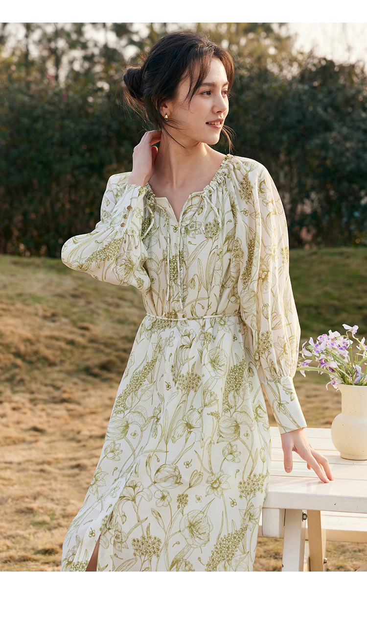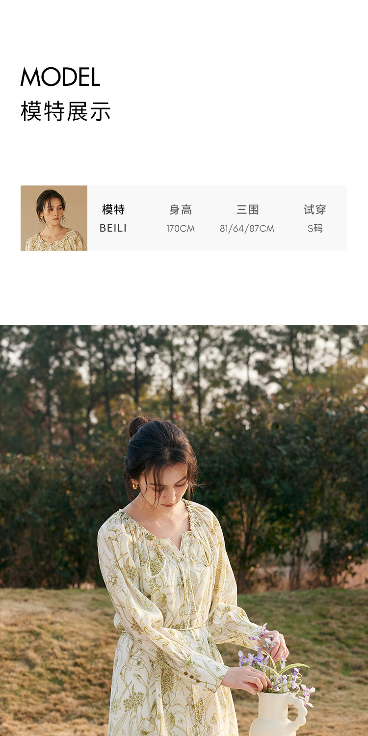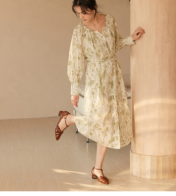 HeyDress法式天丝植物印花连衣裙女春季宽松抽腰收腰气质度假裙子