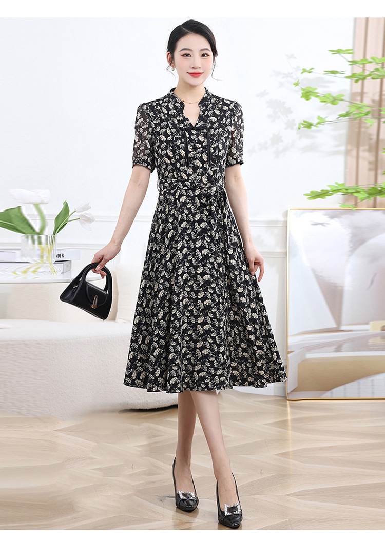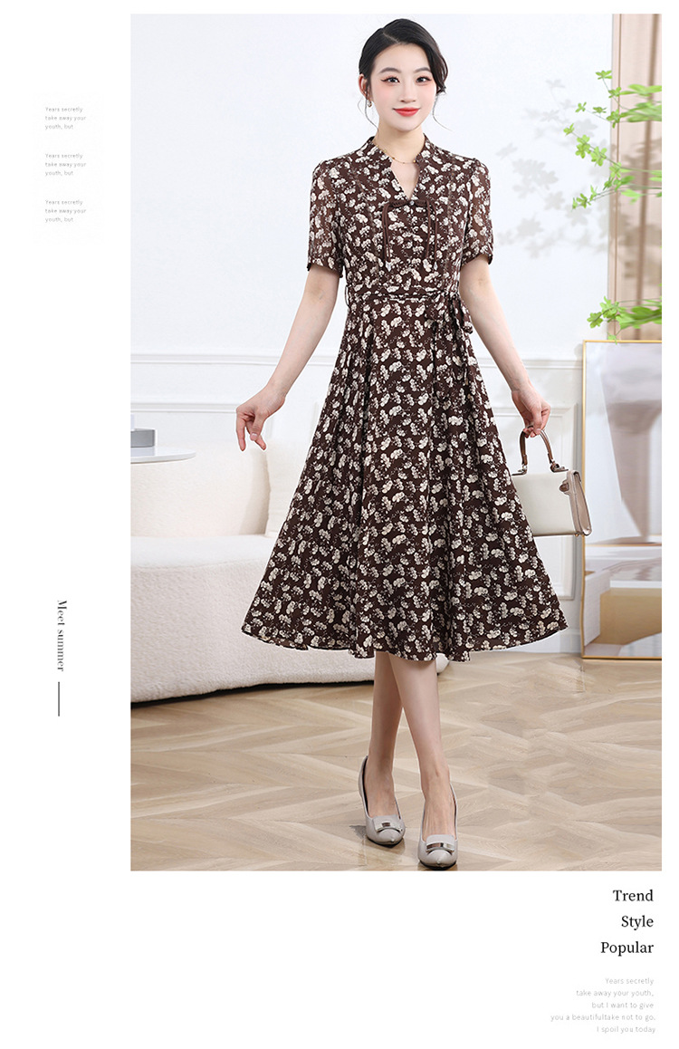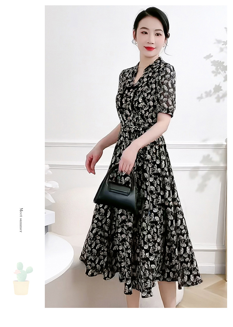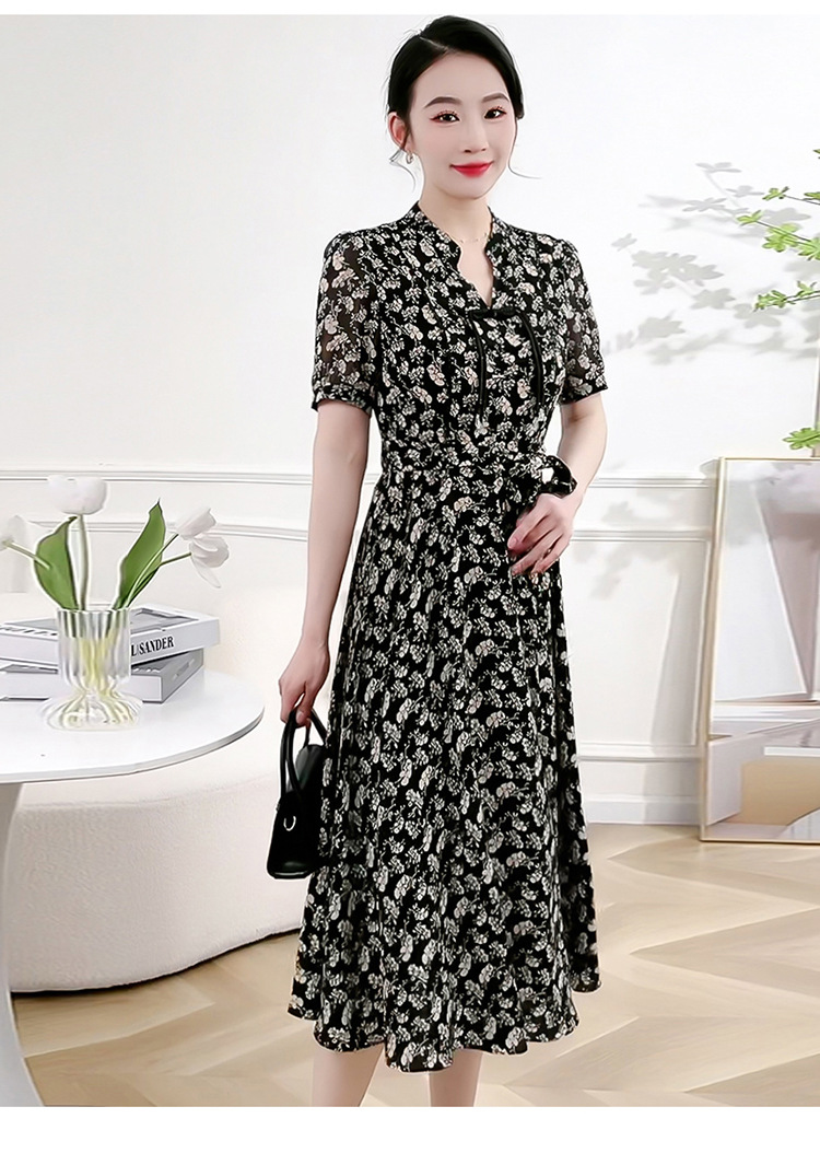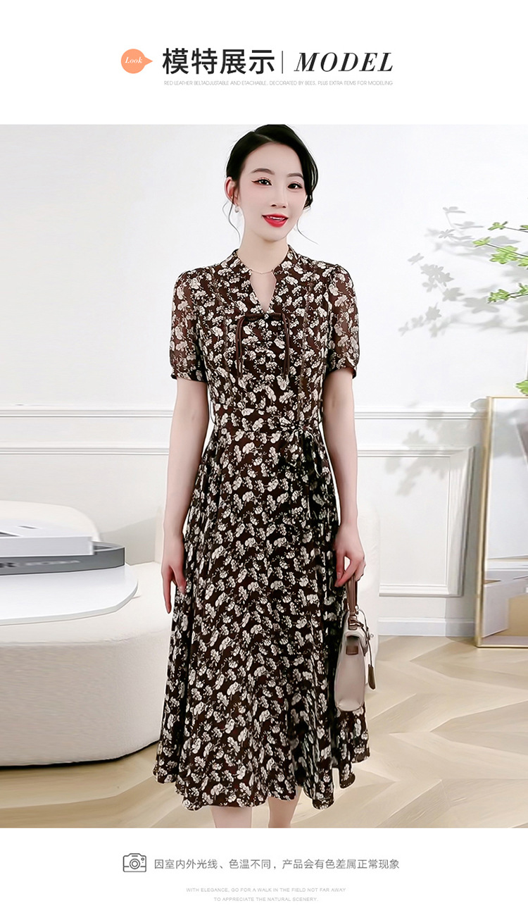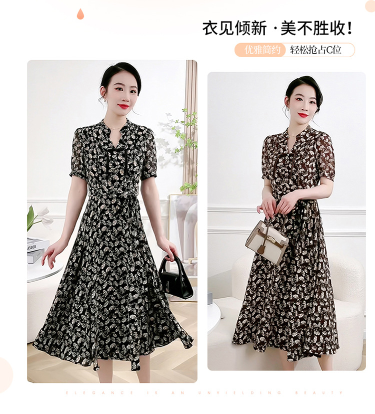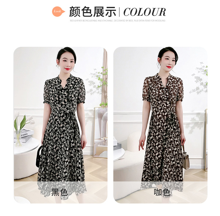 QYM DQ4927-L显瘦修身时尚碎花大摆裙V领休闲雪纺连衣裙 商品图0