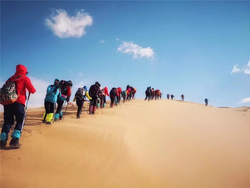 11:30 简单午餐后前往沙漠徒步起点处开始做热身运动,今日徒步全天行程16公里,匀速5-6小时即可到达营地,夜宿小天鹅湖营地。夜晚,西北的天气绝大多数时候都可以看到漫天的繁星。