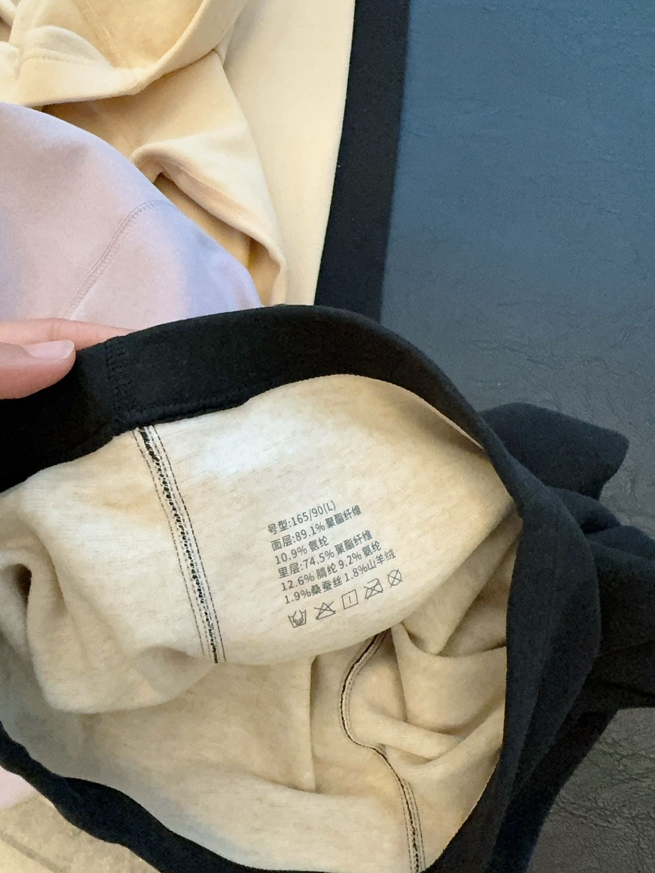 里层:74.5%聚酯纤维、12.6%晴纶、9.2%氨纶、1.9%桑蚕丝、1.8%山羊绒