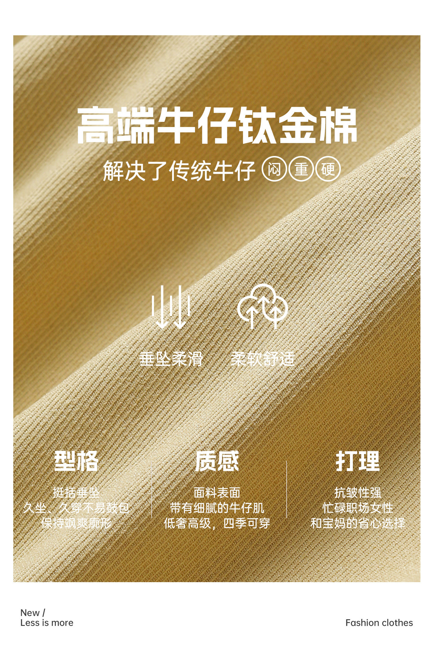 1. 面料优势:牛仔太金棉(棉+牛仔肌理混纺),挺括垂坠、不易皱、透气亲肤,比普通牛仔更软,比纯棉更有型,耐穿易打理,四季可穿。