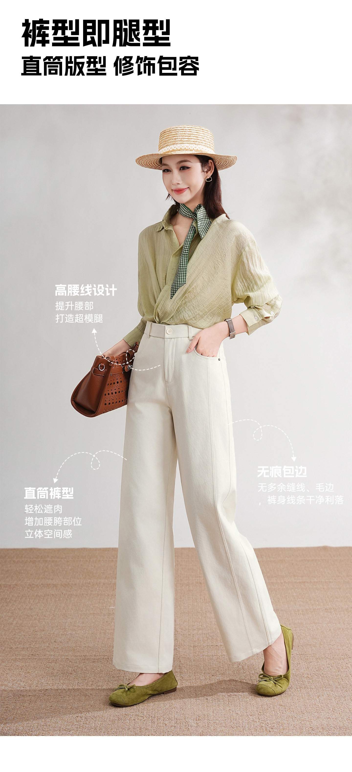 这款是6片拼接高腰直筒裤,核心版型特点: