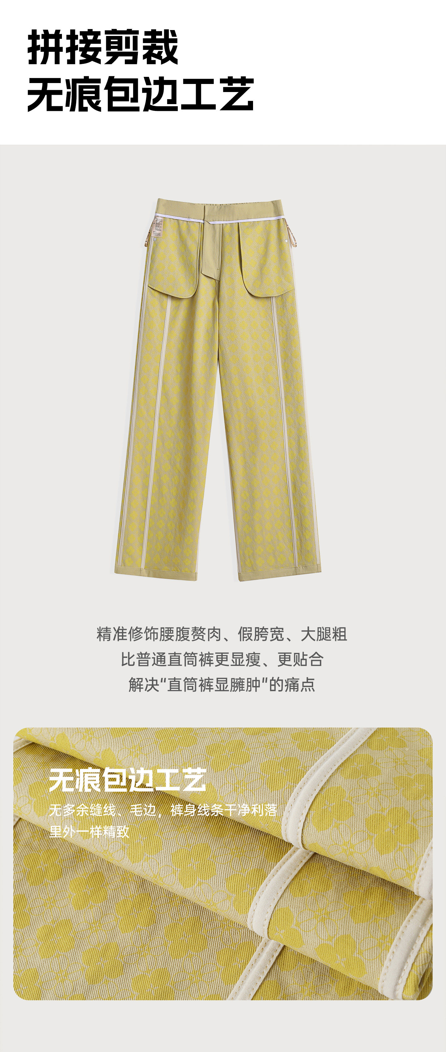 1. 工艺质感:采用无痕包边,无多余缝线、毛边,裤身线条干净利落,提升整体精致度与高级感,区别于普通包边的粗糙感。