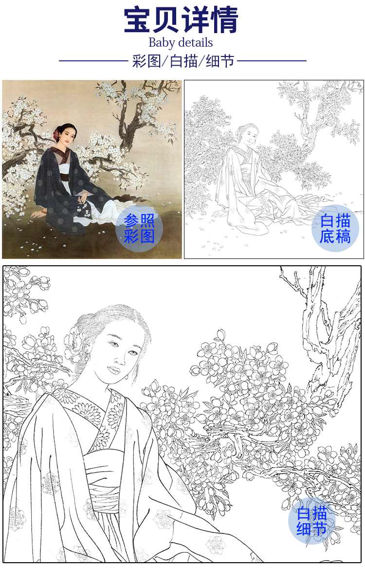 王美芳工笔传统仕女人物白描底稿《春意到花梢》-斗方小品册页-多种白描尺寸可选-B136