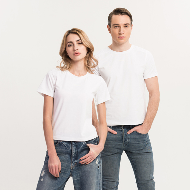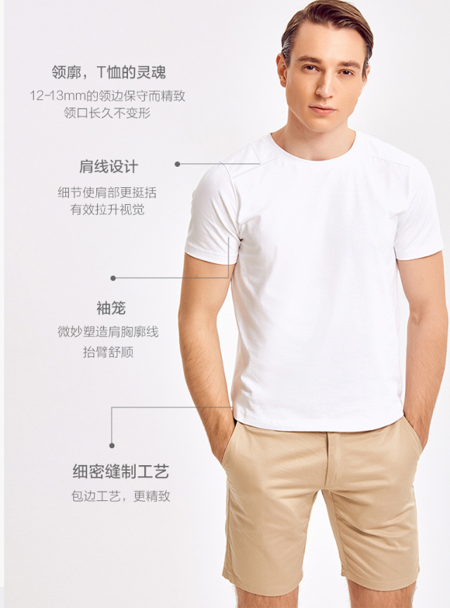 而多种面料结合成为各种大牌的青睐,这款白色T恤采用了95%的精梳棉5%的氨纶(莱卡)